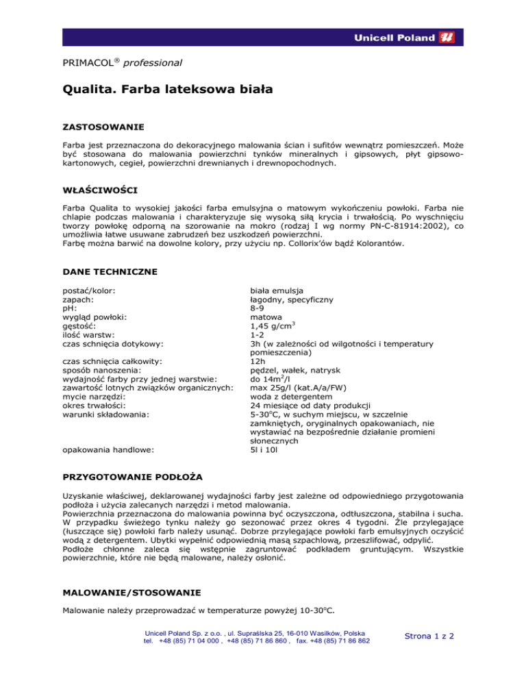 PRIMACOL® professional Qualita. Farba lateksowa biała ZASTOSOWANIE Farba jest przeznaczona do dekoracyjnego malowania ścian i sufitów wewnątrz pomieszczeń. Może być stosowana do malowania powierzchni tynków mineralnych i gipsowych, płyt gipsowokartonowych, cegieł, powierzchni drewnianych i drewnopochodnych. WŁAŚCIWOŚCI Farba Qualita to wysokiej jakości farba emulsyjna o matowym wykończeniu powłoki. Farba nie chlapie podczas malowania i charakteryzuje się wysoką siłą krycia i trwałością. Po wyschnięciu tworzy powłokę odporną na szorowanie na mokro (rodzaj I wg normy PN-C-81914:2002), co umożliwia łatwe usuwane zabrudzeń bez uszkodzeń powierzchni. Farbę można barwić na dowolne kolory, przy użyciu np. Collorix’ów bądź Kolorantów. DANE TECHNICZNE postać/kolor: zapach: pH: wygląd powłoki: gęstość: ilość warstw: czas schnięcia dotykowy: czas schnięcia całkowity: sposób nanoszenia: wydajność farby przy jednej warstwie: zawartość lotnych związków organicznych: mycie narzędzi: okres trwałości: warunki składowania: opakowania handlowe: biała emulsja łagodny, specyficzny 8-9 matowa 1,45 g/cm3 1-2 3h (w zależności od wilgotności i temperatury pomieszczenia) 12h pędzel, wałek, natrysk do 14m2/l max 25g/l (kat.A/a/FW) woda z detergentem 24 miesiące od daty produkcji 5-30oC, w suchym miejscu, w szczelnie zamkniętych, oryginalnych opakowaniach, nie wystawiać na bezpośrednie działanie promieni słonecznych 5l i 10l PRZYGOTOWANIE PODŁOŻA Uzyskanie właściwej, deklarowanej wydajności farby jest zależne od odpowiedniego przygotowania podłoża i użycia zalecanych narzędzi i metod malowania. Powierzchnia przeznaczona do malowania powinna być oczyszczona, odtłuszczona, stabilna i sucha. W przypadku świeżego tynku należy go sezonować przez okres 4 tygodni. Źle przylegające (łuszczące się) powłoki farb należy usunąć. Dobrze przylegające powłoki farb emulsyjnych oczyścić wodą z detergentem. Ubytki wypełnić odpowiednią masą szpachlową, przeszlifować, odpylić. Podłoże chłonne zaleca się wstępnie zagruntować podkładem gruntującym. Wszystkie powierzchnie, które nie będą malowane, należy osłonić. MALOWANIE/STOSOWANIE Malowanie należy przeprowadzać w temperaturze powyżej 10-30oC. Unicell Poland Sp. z o.o. , ul. Supraślska 25, 16-010 Wasilków, Polska tel. +48 (85) 71 04 000 , +48 (85) 71 86 860 , fax. +48 (85) 71 86 862 Strona 1 z 2 Przed użyciem farbę dokładnie wymieszać. W razie konieczności farbę można rozcieńczyć wodą w ilości max 5%. Farbę można nakładać przy użyciu wałka, pędzla bądź natrysku. Zaleca się nakładanie dwóch warstw w odstępie ok. 3 godzin. W pierwszej kolejności należy pomalować trudno dostępne miejsca i narożniki za pomocą pędzla lub małego wałka. Sufit należy malować zaczynając od strony okna i kierując się do wnętrza pokoju, zgodnie z kierunkiem padania światła. Farbę na wałek należy nabierać obficie a następnie starannie i równomiernie rozprowadzać na podłożu. Ważne jest, aby nie malować suchym wałkiem. Przy malowaniu jednej powierzchni nie robić przerw w pracy, ani poprawek na półsuchej powłoce. Kolejne malowane fragmenty łączyć "mokre na mokre”. Malowanie każdego fragmentu malowanej powierzchni należy zawsze kończyć ruchami wałka w tym samym kierunku. Po zakończeniu malowania narzędzia należy umyć wodą. Pomieszczenie wywietrzyć do zaniku zapachu. Powłoka farby uzyskuje pełne właściwości wytrzymałościowe (odporność na zmywanie i szorowanie) po 28 dniach od zakończenia prac malarskich. BEZPIECZEŃSTWO STOSOWANIA Prace prowadzić zgodnie z zasadami sztuki budowlanej, normami i przepisami BHP. Produkt chronić przed dziećmi. W razie połknięcia zasięgnąć porady lekarza. BHP: pożarowe: środowiskowe: produkt nie klasyfikowany jako niebezpieczny produkt wodny – niepalny nie klasyfikowany jako niebezpieczny INFORMACJE PRAWNE Wszystkie informacje i dane zawarte tutaj są podane w dobrej wierze i w zgodzie z posiadaną przez nasze laboratoria wiedzą. Muszą jednak być przyjęte jako oznaczenia bez gwarancji, jeżeli produkt znajduje się poza naszą kontrolą. Informacja techniczna nie jest świadectwem jakości produktu ani też ofertą. Producent nie odpowiada za niewłaściwe użycie informacji zawartych na tej karcie, ani też za konsekwencje z tego wynikające. W przypadku wątpliwości zawsze należy przeprowadzić próbę. Producent zastrzega sobie prawo do zmiany powyższych danych bez powiadamiania klienta. Wydanie Autor: Data: Elżbieta Michałowska 05.06.2013r. Unicell Poland Sp. z o.o. , ul. Supraślska 25, 16-010 Wasilków, Polska tel. +48 (85) 71 04 000 , +48 (85) 71 86 860 , fax. +48 (85) 71 86 862 Strona 2 z 2