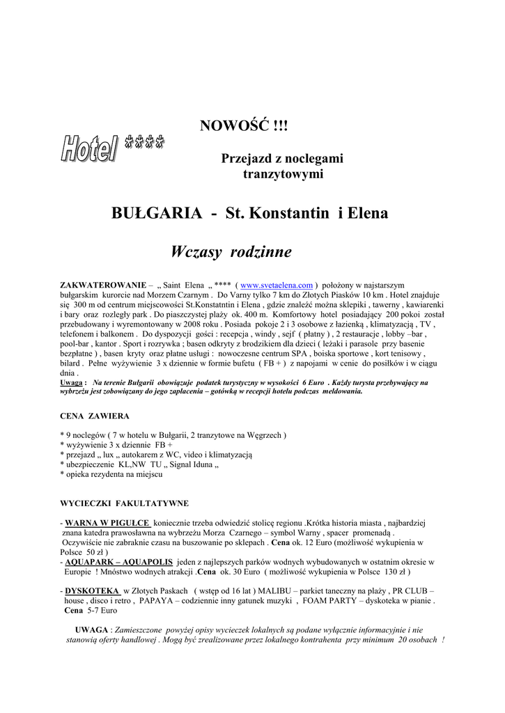 NOWOŚĆ !!! Przejazd z noclegami tranzytowymi BUŁGARIA - St. Konstantin i Elena Wczasy rodzinne ZAKWATEROWANIE – „ Saint Elena „ **** ( www.svetaelena.com ) położony w najstarszym bułgarskim kurorcie nad Morzem Czarnym . Do Varny tylko 7 km do Złotych Piasków 10 km . Hotel znajduje się 300 m od centrum miejscowości St.Konstatntin i Elena , gdzie znaleźć można sklepiki , tawerny , kawiarenki i bary oraz rozległy park . Do piaszczystej plaży ok. 400 m. Komfortowy hotel posiadający 200 pokoi został przebudowany i wyremontowany w 2008 roku . Posiada pokoje 2 i 3 osobowe z łazienką , klimatyzacją , TV , telefonem i balkonem . Do dyspozycji gości : recepcja , windy , sejf ( płatny ) , 2 restauracje , lobby –bar , pool-bar , kantor . Sport i rozrywka ; basen odkryty z brodzikiem dla dzieci ( leżaki i parasole przy basenie bezpłatne ) , basen kryty oraz płatne usługi : nowoczesne centrum SPA , boiska sportowe , kort tenisowy , bilard . Pełne wyżywienie 3 x dziennie w formie bufetu ( FB + ) z napojami w cenie do posiłków i w ciągu dnia . Uwaga : Na terenie Bułgarii obowiązuje podatek turystyczny w wysokości 6 Euro . Każdy turysta przebywający na wybrzeżu jest zobowiązany do jego zapłacenia – gotówką w recepcji hotelu podczas meldowania. CENA ZAWIERA * 9 noclegów ( 7 w hotelu w Bułgarii, 2 tranzytowe na Węgrzech ) * wyżywienie 3 x dziennie FB + * przejazd „ lux „ autokarem z WC, video i klimatyzacją * ubezpieczenie KL,NW TU „ Signal Iduna „ * opieka rezydenta na miejscu WYCIECZKI FAKULTATYWNE - WARNA W PIGUŁCE koniecznie trzeba odwiedzić stolicę regionu .Krótka historia miasta , najbardziej znana katedra prawosławna na wybrzeżu Morza Czarnego – symbol Warny , spacer promenadą . Oczywiście nie zabraknie czasu na buszowanie po sklepach . Cena ok. 12 Euro (możliwość wykupienia w Polsce 50 zł ) - AQUAPARK – AQUAPOLIS jeden z najlepszych parków wodnych wybudowanych w ostatnim okresie w Europie ! Mnóstwo wodnych atrakcji .Cena ok. 30 Euro ( możliwość wykupienia w Polsce 130 zł ) - DYSKOTEKA w Złotych Paskach ( wstęp od 16 lat ) MALIBU – parkiet taneczny na plaży , PR CLUB – house , disco i retro , PAPAYA – codziennie inny gatunek muzyki , FOAM PARTY – dyskoteka w pianie . Cena 5-7 Euro UWAGA : Zamieszczone powyżej opisy wycieczek lokalnych są podane wyłącznie informacyjnie i nie stanowią oferty handlowej . Mogą być zrealizowane przez lokalnego kontrahenta przy minimum 20 osobach ! PROGRAM RAMOWY Dzień 1 : Wyjazd z Polski , przejazd na nocleg tranzytowy na Węgrzech , kolacja . Dzień 2 : Śniadanie , w godzinach południowych wyjazd do Bułgarii . Dzień 3 : Przyjazd do Bułgarii w godzinach południowych , zakwaterowanie od 14.00 , wypoczynek po podróży . Następnie spotkanie z rezydentem , kolacja . Dzień 3 – 10 : Pobyt , realizacja wycieczek fakultatywnych . Dzień 10 : Po śniadaniu wykwaterowanie , o 12.00 obiad . Dla zagospodarowania czasu do wieczornego wyjazdu , proponujemy pobyt w AQUAPARKU 13.00 – 19.00 ( jest to pobyt fakultatywny płatny dodatkowo dla chętnych ) . W przeciwnym wypadku uczestnicy wypoczywają przy basenie lub nad morzem . Po kolacji wyjazd na Węgry . Dzień 11 : Przyjazd na Węgry w godzinach południowych , zakwaterowanie , obiadokolacja , nocleg . Dzień 12 : Śniadanie , podróż do Polski . TERMIN 08.07 – 18.07.2015 Rozkład jazdy godzina Konin Dworzec PKP, Terminal 05.00 Poznań Zintegrowane Centrum Komunikacji ul. St. Matyi 2 07.00 Wrocław Parking pod Hotelem „Wrocław „ ul. Powst. Śl.7 10.00 Katowice Dworzec PKS ul. Piotra Skargi 1 12.30