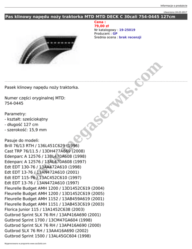 Informacje o produkcie Utworzono 04-03-2017 Pas klinowy napędu noży traktorka MTD MTD DECK C 30cali 754-0445 127cm Cena : 79,00 zł is .c om Nr katalogowy : 19-25019 Producent : GP Średnia ocena : brak recenzji Parametry: - kształt: sześciokątny - długość 127 cm - szerokość: 15,9 mm eg as e Numer części oryginalnej MTD: 754-0445 rw Pasek klinowy napędu noży traktorka. w w w .m Pasuje do modeli: Brill 76/13 RTH / 136L451C629 (1996) Cast TRP 76/11.5 / 13DH477A669 (2008) Edenparc A 12576 / 13BL470A608 (1998) Edenparc A 12576 / 13AL470A608 (1997) Edt EDT 130-76 / 13AA472A610 (1998) Edt EDT 13-76 / 13AN472A610 (2001) Edt EDT 115-76 / 13AC452C610 (1997) Edt EDT 13-76 / 13AN472A610 (1997) Fleurelle Budget AMH 1200 / 13D1452C619 (2004) Fleurelle Budget AMH 1200 / 13D1452C619 (2005) Fleurelle Budget AMH 1152 / 13AB459A619 (2001) Fleurelle Budget AMH 1151 / 13AB453C619 (2003) Florica Junior 115 / 13A1452C638 (2003) Gutbrod Sprint SLX 76 RH / 13AP416A690 (2001) Gutbrod Sprint 1700 / 13CM47GA604 (1998) Gutbrod Sprint SLX 76 RH / 13AP416A690 (2000) Gutbrod SLX 76 RH / 13AA416A690 (2002) Gutbrod Sprint 1500 / 13AL45GC604 (1998) Wygenerowano w programie www.oscGold.com w w w .m eg as e is .c om rw Gutbrod SLX 76 R / 13DH476A690 (2007) Gutbrod Sprint 1500 / 13AA45GC604 (1999) Gutbrod SLX 76 R / 13DH476A490 (2007) Gutbrod SLX 76 R / 13DC476A690 (2004) Gutbrod Sprint 1700 / 13BN47GA604 (1998) Gutbrod SLX 76 RH / 13AP416A690 (2002) Gutbrod Sprint 1500 / 13AM45GC604 (1997) Gutbrod Sprint 1700 / 13AN47GA604 (1998) Gutbrod Sprint SLX 76 RH / 13AP416A690 (1999) Gutbrod SLX 76 RH / 13AP496A690 (1999) Gutbrod SLX 76 R / 13DH476A490 (2006) Hvc H 451 C / 13AH451C609 (1998) Hvc H 450 C / 13BH450C609 (1998) Lawnflite 604 / 13BC450C611 (1998) Lawnflite J 136 / 13AA458C611 (1999) Lawnflite 604 / 13AC450C611 (1997) Lawnflite 604 / 13DV479C611 (2006) Lawnflite 603 / 13DH479C611 (2007) Lawnflite 604 / 13DV479C611 (2005) Lawnflite J 126 / 13AA478C611 (2000) Lawnflite 603 / 13AC479C611 (2004) Lawnflite 603 / 13DH473C611 (2007) Mastercut 115/76 / 13BC452C659 (1998) Mastercut 125/76 / 13BL452C659 (1998) Mastercut 125/76 / 13BL451C657 (1998) Mastercut 115/76 / 13AB452C659 (1999) Mastercut 76 / 13D1450C459 (2007) Mtd J 114 / 13AB455C661 (1999) Mtd J 114 / 13A1455C661 (1999) Mtd RH 115 / 13A1450C600 (2000) Mtd JA 115 / 13DC478A678 (2004) Mtd RH 115/76 / 13D1458C622 (2007) Mtd J/115 / 13AC458C678 (2000) Mtd J 124 / 13AH455A661 (2000) Mtd JA 115 / 13DC478A670 (2004) Mtd J/115 / 13AA458C670 (2000) Mtd Junior 115 / 13DH452C600 (2007) Mtd JA 115 / 13AC478A678 (2001) Mtd RH 115/76 / 13D1452C600 (2004) Mtd RH 115/76 / 13D1452C670 (2007) Mtd J 126 / 13BL475A678 (1998) Mtd JA 125 T / 13DH473A670 (2006) Mtd J 124 / 13AH455A661 (1999) w w w .m eg as e rw Mtd Junior 115 / 13DH452C600 (2006) Mtd J/130 / 13AN475A678 (2001) Mtd Spider 76 R / 13A1452C600 (2003) Mtd JA 125 T / 13DH473A678 (2006) Mtd J 125 / 13BL470A678 (1998) Mtd RH 115 / 13BC451C600 (1998) Mtd RH 115/76 / 13D1452C600 (2005) Mtd IB 125 / 13BL475A606 (1998) Mtd RH 115 / 13AC451C600 (1998) Mtd Junior 115 / 13DH452C600 (2005) Mtd JA 135 T / 13DH473A676 (2007) Mtd J/130 / 13AP478A670 (2000) Mtd J/115 / 13AC458C678 (1999) Mtd JA 125 T / 13DH473A478 (2006) Mtd RH 115 B / 13AC458C600 (2003) Mtd J 120 / 13AL455C678 (1998) Mtd J 125 / 13AN450C678 (1997) MTech E 45 GC / 13AE45GC605 (1997) MTech 245 GC / 13A245GC605 (1998) Raiffeisen RMH 412-76 T / 13AC477A628 (2003) Raiffeisen RMH 412-76 T / 13DH477A628 (2006) Raiffeisen RMH 412-76 T / 13AC477A628 (2002) Raiffeisen RMH 12.5-76 / 13AL452C628 (1999) Raiffeisen RMH 12.5-76 / 13AL452C628 (1998) Raiffeisen RMH 13-76 H / 13AN473A628 (1998) TurboSilent TSRH 115 / 13A1450C667 (2002) TurboSilent TSRH 115/76 R / 13A1452C667 (2003) TurboSilent TSRH 115/76 R / 13D1452C667 (2005) White LRH 145 H / 13AP493A679 (1999) White LRH 145 H / 13AP416A680 (1999) White LRH 130 / 13AA473A679 (1999) Yardman TA 4120 / 13BC474A643 (2003) Yardman TA 4135 / 13DH474A443 (2007) Yardman TC 4125 / 13AL473C643 (1998) Yardman TA 4120 / 13AC474A643 (2002) Yardman 12.5/76 / 136L452C643 (1996) Yardman TC 4125 / 136L452C643 (1996) Yardman AT 511/07 / 13D1450C439 (2007) Yardman TA 4135 / 13DH474A643 (2006) is .c om Informacje o produkcie Wygenerowano w programie www.oscGold.com is .c om rw eg as e .m w w w