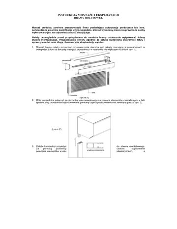 INSTRUKCJA MONTAśU I EKSPLOATACJI BRAMY ROLETOWEJ. MontaŜ produktu powinna przeprowadzić firma posiadająca autoryzację producenta lub inne, potwierdzone pisemnie kwalifikacje w tym względzie. MontaŜ wykonany przez nieuprawnione osoby wykonywany jest na odpowiedzialność zlecającego. NaleŜy bezwzględnie przed przystąpieniem do montaŜu bramy ostatecznie wytynkować ściany otworu montaŜowego. Przygotowanie otworu zgodnie ze sztuką budowlaną gwarantuje łatwy i sprawny montaŜ oraz długą i bezawaryjną eksploatację wyrobu. 1. MontaŜ bramy naleŜy rozpocząć od nawiercenia otworów pod wkręty mocujące w prowadnicach w odległości 2,5cm od bocznej krawędzi prowadnicy i w rozstawie nie większym niŜ 65cm (rys. 1). (rys.nr.1) 2. Obie prowadnice połączyć ze skrzynką wału nawojowego za pomocą elementów montaŜowych w taki sposób, aby prowadnice były skierowane gumową częścią uszczelnienia na zewnątrz garaŜu (rys. 2). (rys.nr.2) 3. Całość konstrukcji przyłoŜyć Za pomocą poziomicy połoŜenie elementów w obu do otworu montaŜowego. ustawić odpowiednie płaszczyznach, a 1 następnie odznaczyć miejsca wiercenia otworów pod wkręty mocujące. 4. Nawiercić otwory w ścianie wg naniesionych punktów, a następnie całość konstrukcji zamontować za pomocą kołków rozporowych. 5. Po zamontowaniu konstrukcji naleŜy podwiesić płaszcz bramy do wału nawojowego w sposób pokazany na rys. 3a i 3b, a następnie unieruchomić pierścienie wału z pomocą wkrętów. UWAGA! Wiercąc otwory na wale nawojowym naleŜy zachować ostroŜność, aby nie uszkodzić znajdującego się w wale silnika. (rys.nr.3a) (rys.nr 3b) 6. Po podwieszeniu płaszcza nawinąć go na wał nawojowy za pomocą korby awaryjnego otwierania bramy. 7. Zgodnie z dołączoną instrukcją montaŜu napędu przeprowadzić montaŜ instalacji elektrycznej i dokonać regulacji połoŜeń końcowych. UWAGA! Czynności te naleŜy zlecić osobie z odpowiednimi uprawnieniami elektrycznymi. 8. Po zakończeniu wszystkich czynności montaŜowych i sprawdzeniu poprawności działania bramy naleŜy zamocować osłonę wału nawojowego za pomocą wkrętów. W skład zestawu wchodzą następujące elementy: 1) Skrzynka wału nawojowego – 1szt. 2) Płaszcz bramy wraz z wieszakami – 1szt. 3) Prowadnice – 2szt. 4) Korba – 1szt. Pozycje uzaleŜnione od wersji bramy.* Niepotrzebne skreślić 5) Przełącznik klawiszowy -1 szt.* 6) Centralka sterująca -1 szt.* 7) Nadajnik -2 szt.* 2 Schemat podłączenia sterownika ST100H Schemat podłączenia sterownika ST100H (brama z hamulcem inercyjnym). SILNIK SILNIK hamulec inercyjny czarny N L niebieski Ŝółto-zielony PN brązowy M czarny N niebieski Ŝółto-zielony PN brązowy M L TRAFO TRAFO . Schemat podłączenia przełącznika klawiszowego. Schemat podłączenia przełącznika klawiszowego (brama z hamulcem inercyjnym). SILNIK SILNIK M niebieski Ŝółto-zielony czarny brązowy Ŝółto-zielony niebieski czarny brązowy M hamulec inercyjny L L przełącznik klawiszowy przełącznik klawiszowy L N L PN 3 N PN Warunki gwarancji: 1. Firma Legbud Gargula gwarantuje wysoką jakość swoich produktów i potwierdza, Ŝe produkty te posiadają właściwości typowe dla produktów tego rodzaju. Warunkiem gwarancji jest zgodna z instrukcją eksploatacja i prawidłowy montaŜ, zgodny z warunkami techniczno-eksploatacyjnymi. 2. Gwarancji udziela się na okres 12 miesięcy od daty sprzedaŜy, nie dłuŜej jednak niŜ na okres 24 miesięcy od daty produkcji. 3. Gwarancji nie podlegają elementy współpracujące ze sobą bezpośrednio, które w wyniku pracy mogą ulec zuŜyciu. 4. Gwarancja nie obejmuje równieŜ uszkodzeń spowodowanych przez uŜytkownika lub przez niezgodny z instrukcją montaŜ oraz niewłaściwe składowanie wyrobu, jak równieŜ mechaniczne uszkodzenie produktu. 5. Wyrób traci gwarancję po zastosowaniu przez uŜytkownika jakichkolwiek zmian w budowie lub konstrukcji produktu, bądź na skutek wadliwej eksploatacji lub nieuprawnionej ingerencji osób trzecich. 6. Gwarancja nie obejmuje powłoki lakieru oraz uszkodzeń spowodowanych przez warunki atmosferyczne. 7. Niewypełniona, wypełniona częściowo lub nieprawidłowo karta gwarancyjna jest niewaŜna. 8. Zgubienie karty gwarancyjnej powoduje rozwiązanie umowy gwarancyjnej. 9. Wszelkie uszkodzenia powstałe na skutek wadliwej eksploatacji nie podlegają gwarancji i mogą zostać usunięte jedynie za pobraniem opłat serwisowych. 10. Uprawnienia z tytułu udzielonej gwarancji nie obejmują prawa klienta do domagania się zwrotu utraconych zysków i wyrównania ewentualnej szkody w związku z awarią produktu, poza uprawnieniami wynikającymi z niniejszej gwarancji. 11. Gwarancja jest waŜna tylko na terytorium UE i obejmuje produkty, za które zapłata została uiszczona w umówionym terminie. 4