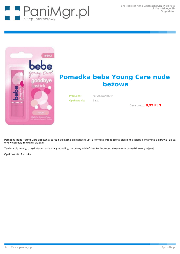 Pani Magister Anna Czerniachowicz-Piskorska ul. Krasińskiego 2B Stąporków Pomadka bebe Young Care nude beżowa Producent: "BRAK DANYCH" Opakowanie: 1 szt. Cena brutto: 8,99 PLN Pomadka bebe Young Care zapewnia bardzo delikatną pielęgnację ust, a formuła wzbogacona olejkiem z jojoba i witaminą E sprawia, że są one wyjątkowo miękkie i gładkie Zawiera pigmenty, dzięki którym usta mają jednolity, naturalny odcień bez konieczności stosowania pomadki koloryzującej. Opakowanie: 1 sztuka http://www.panimgr.pl AptusShop