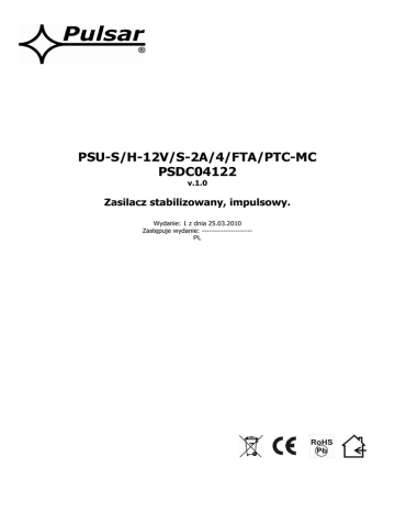 PSU-S/H-12V/S-2A/4/FTA/PTC-MC PSDC04122 v.1.0 Zasilacz stabilizowany, impulsowy. Wydanie: 1 z dnia 25.03.2010 Zastępuje wydanie: --------------------PL SPIS TREŚCI: 1. Opis techniczny. 1.1. Opis ogólny 1.2. Schemat blokowy 1.3. Opis elementów i złącz zasilacza 1.4. Parametry techniczne 2. Instalacja. 2.1. Wymagania 2.2. Procedura instalacji 3. Sygnalizacja pracy zasilacza. 3.1. Sygnalizacja optyczna 3.2. Wyjście techniczne 4. Obsługa oraz eksploatacja. 4.1. Zabezpieczenie przeciwzwarciowe 4.2. Zabezpieczenie przeciąŜeniowe 4.3 Konserwacja 1. Opis techniczny. 1.1. Opis ogólny. Zasilacz stabilizowany przeznaczony jest do zasilania urządzeń wymagających stabilizowanego napięcia o wartości 12V DC (12,0V÷15,0V DC). Podstawowe cechy zasilacza: • 4 wyjścia zabezpieczone niezaleŜnie bezpiecznikami: F 500mA/PTC , awaria (zwarcie) w obwodzie któregoś z wyjść spowoduje przepalenie wkładki bezpiecznikowej lub zadziałanie PTC i odłączenie obwodu od zasilania DC (+U). • optyczna sygnalizacja pracy informująca o stanie: wyjść i/lub awarii. • wyjście techniczne AW informujące o awarii wyjścia (zadziałanie SCP), słuŜące do zdalnej kontroli pracy • zabezpieczenia: przeciwzwarciowe (SCP), przeciąŜeniowe (OLP), nadnapięciowe (OVP). • regulacja napięcia wyjściowego: w przypadku instalacji, gdzie występują znaczące spadki napięć na rezystancji przewodów doprowadzających do odbiorników, moŜliwa jest korekta wartości napięcia potencjometrem P1 (12,0V÷16,5V DC) • zasilacz wykorzystuje nowoczesny moduł zasilacza impulsowego • metalowa obudowa (kolor RAL 9003) z panelem sygnalizacyjnym Informacje o typach: Model PSDC 08124 PSU-S/H-12V/S-4A/8/FTA/PTCMC PSDC 04124 PSU-S/H-12V/S-4A/4/FTA/PTCMC PSDC 16128 PSU-S/H-12V/S-8A/16/FTA/PTCMC Opis Zasilacz stabilizowany (impulsowy), o całkowitej wydajności prądowej 4A i napięciu wyjściowym 12 V DC. WyposaŜony w panel sygnalizacji stanu wyjść AUX1÷AUX8. Metalowa obudowa IP20 z panelem sygnalizacyjnym, wyposaŜona w mikroprzełącznik TAMPER. Zasilacz stabilizowany (impulsowy), o całkowitej wydajności prądowej 4A i napięciu wyjściowym 12 V DC. WyposaŜony w panel sygnalizacji stanu wyjść AUX1÷AUX4. Metalowa obudowa IP20 z panelem sygnalizacyjnym, wyposaŜona w mikroprzełącznik TAMPER. Zasilacz stabilizowany (impulsowy), o całkowitej wydajności prądowej 8A i napięciu wyjściowym 12 V DC. WyposaŜony w panel sygnalizacji stanu wyjść AUX1÷AUX16. Metalowa obudowa IP20 z panelem sygnalizacyjnym, wyposaŜona w mikroprzełącznik TAMPER. 1.2. Schemat blokowy (rys.1). Rys.1. Schemat blokowy zasilacza. 2 1.3. Opis elementów i złącz zasilacza ( tab.1, tab.2, rys.2, rys.3). Element nr [Rys. 2] [1] [2] Opis L1…..L4 (zielone) diody LED (sygnalizują zadziałanie bezpiecznika) F1….F4 bezpieczniki topikowe w obwodach AUX (+) [3] IN wejście zasilania listwy LB4/AW [4] AUX1…. AUX4 wyjścia, wspólny zacisk COM (-) [5] [6] LAW (czerwona) dioda sygnalizująca awarie jednego z wyjść (zadziałanie bezpiecznika) AW wyjście sygnalizujące awarię jednego z wyjść, typ OC (stan normalny L, awaria hi-Z) Zworka zmiany rodzaju bezpiecznika PTC/ topikowy Fx Fx.x [7] załoŜona zworka Fx, wybrany bezpiecznik polimerowy Fx Fx.x załoŜona zworka Fx.x, wybrany bezpiecznik topikowy Tab.1. Elementy LB4/AW – listwa bezpiecznikowa. Rys.2. Widok listwy LB4/AW. Element nr [Rys. 3] Opis [1] L-N złącze zasilania 230 V AC, Złącze ochrony PE [2] F bezpiecznik w obwodzie 230 V AC [3] MODUŁ ZASILACZA [4] P1 potencjometr, regulacja napięcia wyjściowego [5] LED sygnalizacja optyczna stanu zasilania DC, głównego modułu zasilacza [6] LB4/AW listwa bezpiecznikowa, z wyjściami zasilania i sygnalizacją optyczną Tab.2. Elementy zasilacza. 3 Rys.3. Widok zasilacza. 4 1.3. Parametry techniczne: - parametry elektryczne (tab.3) - parametry mechaniczne (tab.4) - bezpieczeństwo uŜytkowania (tab.5) - parametry eksploatacyjne (tab.6) Parametry elektryczne (tab. 3). Napięcie zasilania Częstotliwość zasilania Moc zasilacza P Pobór prądu Napięcie wyjściowe Czas podtrzymania napięcia wyjściowego Zakres nastawy napięcia Napięcie tętnienia Prąd wyjściowy Zabezpieczenie przed zwarciem SCP Zabezpieczenie przed przeciąŜeniem OLP Zabezpieczenie nadnapięciowe OVP Wyjścia techniczne: - AW wyjście sygnalizujące awarię bezpiecznika (przepalenie) listwy LB4/AW ( zadziałanie SCP) Bezpiecznik F Bezpieczniki F1÷ F4 88-264 V AC, 125 – 373 V DC 47÷63Hz lub DC 30W max. 0,5 A /230 V AC (40A/230 V AC „zimny start”) 12,5V DC nom. 80 ms 12,0V÷16,5 V DC (-5%/+5%), 1x regulacja P1 120 mV p-p max. 4x 0,5A lub 2x 1,0A (bezpieczniki z zestawu) ΣI= 2,0A LISTWA LB4/AW 4x F 0,5A bezpiecznik topikowy lub PTC 0,5A lub 2xF 1A (bezpieczniki z zestawu) MODUŁ ZASILACZA 110% ÷ 150% mocy zasilacza ograniczenie elektroniczne prądu, powrót automatyczny po ustaniu awarii 110% ÷ 150% mocy zasilacza ograniczenie elektroniczne prądu, powrót automatyczny po ustaniu awarii 17,25 V÷ 20,25V odłączenie napięcia wyjściowego, przywracane ręcznie- odłączenie zasilania AC typ OC, 50mA max stan normalny: poziom L (0V), awaria: poziom hi-Z T 2A/250V F 0,5A/250V lub PTC 0,5A (wybór ręczny) Parametry mechaniczne (tab. 4). Wymiary obudowy 230 x 167 x 50 (WxHxD) , z pokrywą: (235 x 172 x 58) Mocowanie 198 x 145 x Φ 6 (WxH) Waga netto/brutto 1,08/1,23 kg Kolor obudowy RAL 9003 Zamykanie Wkręt walcowy: od czoła obudowy Złącza Zasilanie 230 V AC: Φ0,63-2,05 (AWG 22-12) Wyjścia AUX : Φ0,51- 2,05 (AWG 24-12) LB4/AW : Φ0,51- 2,05 (AWG 24-12) Uwagi Obudowa posiada dystans od podłoŜa montaŜowego w celu prowadzenia okablowania, chłodzenie konwekcyjne Bezpieczeństwo uŜytkowania (tab.5). Klasa ochronności PN-EN 60950-1:2004 Stopień ochrony PN-EN 60529: 2002 (U) Wytrzymałość elektryczna izolacji: - pomiędzy obwodem wejściowym (sieciowym) a obwodami wyjściowymi zasilacza (I/P-O/P) - pomiędzy obwodem wejściowym 