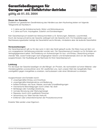 Garantiebedingungen für Garagen- und Einfahrtstor-Antriebe gültig ab 01.03.2004 Dauer der Garantie Zusätzlich zur gesetzlichen Gewährleistung des Händlers aus dem Kaufvertrag leisten wir folgende Teilegarantie ab Kaufdatum: • 5 Jahre auf die Antriebsmechanik, Motor und Motorsteuerung • 2 Jahre auf Funk, Impulsgeber, Zubehör und Sonderanlagen Kein Garantieanspruch besteht bei Verbrauchsmitteln (z. B. Sicherungen, Batterien, Leuchtmittel). Durch die Inanspruchnahme der Garantie verlängert sich die Garantie nicht. Für Ersatzlieferungen und Nachbesserungsarbeiten beträgt die Garantiefrist sechs Monate, mindestens aber die laufende Garantiefrist. Voraussetzungen Der Garantieanspruch gilt nur für das Land, in dem das Gerät gekauft wurde. Die Ware muss auf dem von uns vorgegebenen Vertriebsweg erstanden worden sein. Der Garantieanspruch besteht nur für Schäden am Vertragsgegenstand selbst. Die Erstattung von Aufwendungen für Aus- und Einbau, Überprüfung entsprechender Teile, sowie Forderungen nach entgangenen Gewinn und Schadensersatz sind von der Garantie ausgeschlossen. Der Kaufbeleg gilt als Nachweis für Ihren Garantieanspruch. Leistung Für die Dauer der Garantie beseitigen wir alle Mängel am Produkt, die nachweislich auf einen Material- oder Herstellungsfehler zurückzuführen sind. Wir verpflichten uns, nach unserer Wahl die mangelhafte Ware unentgeltlich gegen mangelfreie zu ersetzen, nachzubessern oder einen Minderwert zu ersetzen. Ausgeschlossen sind Schäden durch: • unsachgemäßen Einbau und Anschluss • unsachgemäße Inbetriebnahme und Bedienung • äußere Einflüsse, wie Feuer, Wasser, anormale Umweltbedingungen • mechanische Beschädigungen durch Unfall, Fall, Stoß • fahrlässige oder mutwillige Zerstörung • normale Abnutzung oder Wartungsmangel • Reparatur durch nicht qualifizierte Personen • Verwendung von Teilen fremder Herkunft • Entfernen oder Unkenntlichmachen der Produktionsnummer Ersetzte Teile werden unser Eigentum. Hörmann KG Verkaufsgesellschaft (D)