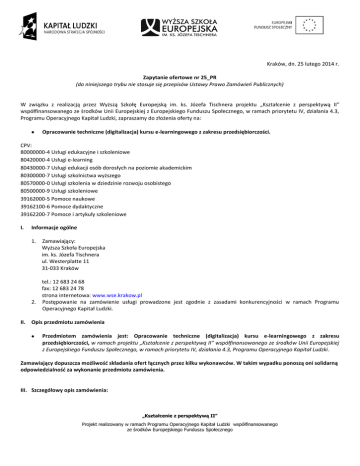Kraków, dn. 25 lutego 2014 r. Zapytanie ofertowe nr 25_PR (do niniejszego trybu nie stosuje się przepisów Ustawy Prawo Zamówień Publicznych) W związku z realizacją przez Wyższą Szkołę Europejską im. ks. Józefa Tischnera projektu „Kształcenie z perspektywą II” współfinansowanego ze środków Unii Europejskiej z Europejskiego Funduszu Społecznego, w ramach priorytetu IV, działania 4.3, Programu Operacyjnego Kapitał Ludzki, zapraszamy do złożenia oferty na: Opracowanie techniczne (digitalizacja) kursu e-learningowego z zakresu przedsiębiorczości. CPV: 80000000-4 Usługi edukacyjne i szkoleniowe 80420000-4 Usługi e-learning 80430000-7 Usługi edukacji osób dorosłych na poziomie akademickim 80300000-7 Usługi szkolnictwa wyższego 80570000-0 Usługi szkolenia w dziedzinie rozwoju osobistego 80500000-9 Usługi szkoleniowe 39162000-5 Pomoce naukowe 39162100-6 Pomoce dydaktyczne 39162200-7 Pomoce i artykuły szkoleniowe I. Informacje ogólne 1. Zamawiający: Wyższa Szkoła Europejska im. ks. Józefa Tischnera ul. Westerplatte 11 31-033 Kraków tel.: 12 683 24 68 fax: 12 683 24 78 strona internetowa: www.wse.krakow.pl 2. Postępowanie na zamówienie usługi prowadzone jest zgodnie z zasadami konkurencyjności w ramach Programu Operacyjnego Kapitał Ludzki. II. Opis przedmiotu zamówienia Przedmiotem zamówienia jest: Opracowanie techniczne (digitalizacja) kursu e-learningowego z zakresu przedsiębiorczości, w ramach projektu „Kształcenie z perspektywą II” współfinansowanego ze środków Unii Europejskiej z Europejskiego Funduszu Społecznego, w ramach priorytetu IV, działania 4.3, Programu Operacyjnego Kapitał Ludzki. Zamawiający dopuszcza możliwość składania ofert łącznych przez kilku wykonawców. W takim wypadku ponoszą oni solidarną odpowiedzialność za wykonanie przedmiotu zamówienia. III. Szczegółowy opis zamówienia: „Kształcenie z perspektywą II” Projekt realizowany w ramach Programu Operacyjnego Kapitał Ludzki współfinansowanego ze środków Europejskiego Funduszu Społecznego 1. Informacje na temat opracowania technicznego (digitalizacji) kursu: Wybrany Wykonawca techniczny kursu opracuje kurs e-learningowy zgodnie ze wskazaniami wykonawcy jego części merytorycznej wykorzystując techniki multimedialne, informatyczne, oprogramowanie graficzne. Wybrany Wykonawca dostarczy szatę graficzną kursu opracowaną zgodnie z wytycznymi dotyczącymi promocji projektów współfinansowanych ze środków Unii Europejskiej oraz Europejskiego Funduszu Społecznego. Opracowany (zdigitalizowany) kurs e-learningowy musi działać w środowisku platformy open source – narzędzie Moodle 2.6 Powinien wykorzystywać podstawowe narzędzia platformy takie jak Lekcja/Książka, Słownik pojęć (dodatkowo doinstalowane są wtyczki Gry, Certyfikat, Kwestionariusz, Galeria zdjęć – Lightbox) Rozmiar kursu nie powinien przekraczać 200MB. Jeśli ma zawierać filmy to powinny być hostowane w serwisach zewnętrznych(np. youtube) i wstawione do kursu. Treści kursu powinny być responsywe ponieważ moodle korzysta z szablonu graficznego dostosowanego do urządzeń mobilnych. IV. Termin wykonania zamówienia: Opracowanie techniczne: digitalizacja – od daty podpisania umowy do dnia 15.04.2014 r. V. Warunki udziału w postępowaniu: O udzielenie zamówienia mogą ubiegać się Wykonawcy, którzy spełniają poniższe warunki: 1) Akceptują treść zapytania bez zastrzeżeń – złożenie oferty jest uważane za akceptację treści zapytania. 2) Posiadają uprawnienia do wykonywania określonej działalności lub czynności, jeżeli ustawy nakładają obowiązek posiadania takich uprawnień, w tym: prowadzą działalność gospodarczą w zakresie objętym zamówieniem (dotyczy Wykonawców prowadzących działalność gospodarczą). Warunkiem spełnienia wymagania określonego w pkt. 2 jest dostarczenie dokumentu: odpis z KRS, zaświadczenie o prowadzeniu działalności gospodarczej. 3) Posiadają doświadczenie praktyczne z opracowywania technicznego – digitalizacji 4) Przesłanie dwóch przykładowo zdigitalizowanych materiałów 5) Znajdują się w sytuacji ekonomicznej i finansowej zapewniającej wykonanie zamówienia. 6) W przypadku zatrudnienia Oferenta w innych projektach NSRO łączna ilość godzin wynikająca z tego zatrudnienia nie przekracza 230 godzin miesięcznie. 6) Oferent jest podmiotem niepowiązanym z Zamawiającym w sposób osobowy lub kapitałowy. Przez powiązania kapitałowe lub osobowe rozumie się w szczególności: • uczestniczenie w spółce jako wspólnik lub tworzenie z ECC Sp. z o.o. spółki cywilnej lub spółki osobowej; • posiadanie co najmniej 10 % udziałów w ECC Sp. z o.o.; • pełnienie funkcji członka organu nadzorczego lub zarządzającego, prokurenta, pełnomocnika; • pozostawanie w związku małżeńskim, w stosunku pokrewieństwa lub powinowactwa w linii prostej, pokrewieństwa lub powinowactwa w linii bocznej do drugiego stopnia lub w stosunku przysposobienia, opieki lub kurateli (niniejszy warunek będzie weryfikowany na podstawie przedłożonych przez Oferenta oświadczeń będących załącznikiem nr 3 i 4 do niniejszego zapytania ofertowego). 7) Oświadczają, że znany jest im Regulamin wyboru wykonawcy zgodnie z zasadą konkurencyjności oraz zasadą efektywnego zarządzania finansami w ramach projektu „Kształcenie z perspektywą II” zamieszczony na stronie http://wse.krakow.pl/pl/Ksztalcenie_z_perspektywa_II/artykuly/art,1641,zapytania_ofertowe.html W razie ubiegania się o udzielenie zamówienia przez podmiot nie będący osobą fizyczną, podmiot ten powinien dysponować osobami (osobą) spełniającymi (spełniającą) wymogi opisane w pkt.3 niniejszego ustępu, oraz dołączyć CV tej osoby, wraz z upoważnieniem (osoby) do przetwarzania danych osobowych. Zamawiający dokona oceny spełnienia przez Wykonawcę warunków udziału w postępowaniu na podstawie żądanych dokumentó