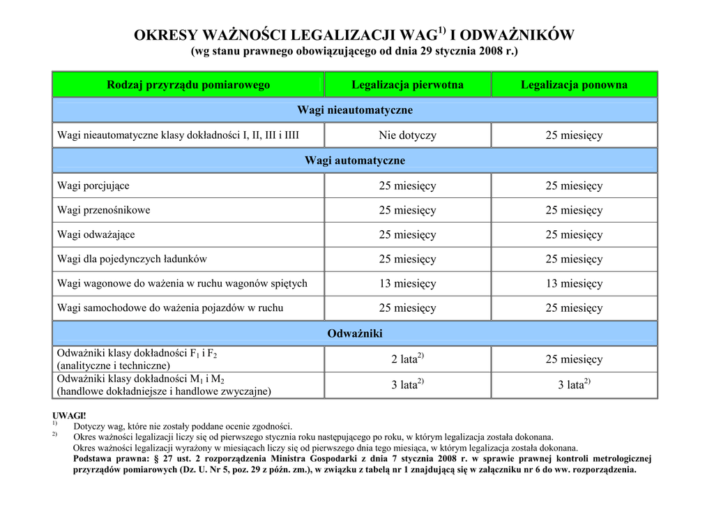 OKRESY WAŻNOŚCI LEGALIZACJI WAG1) I ODWAŻNIKÓW (wg stanu prawnego obowiązującego od dnia 29 stycznia 2008 r.) Rodzaj przyrządu pomiarowego Legalizacja pierwotna Legalizacja ponowna Wagi nieautomatyczne Nie dotyczy Wagi nieautomatyczne klasy dokładności I, II, III i IIII 25 miesięcy Wagi automatyczne Wagi porcjujące 25 miesięcy 25 miesięcy Wagi przenośnikowe 25 miesięcy 25 miesięcy Wagi odważające 25 miesięcy 25 miesięcy Wagi dla pojedynczych ładunków 25 miesięcy 25 miesięcy Wagi wagonowe do ważenia w ruchu wagonów spiętych 13 miesięcy 13 miesięcy Wagi samochodowe do ważenia pojazdów w ruchu 25 miesięcy 25 miesięcy Odważniki Odważniki klasy dokładności F1 i F2 (analityczne i techniczne) Odważniki klasy dokładności M1 i M2 (handlowe dokładniejsze i handlowe zwyczajne) 2 lata2) 25 miesięcy 3 lata2) 3 lata2) UWAGI! 1) Dotyczy wag, które nie zostały poddane ocenie zgodności. 2) Okres ważności legalizacji liczy się od pierwszego stycznia roku następującego po roku, w którym legalizacja została dokonana. Okres ważności legalizacji wyrażony w miesiącach liczy się od pierwszego dnia tego miesiąca, w którym legalizacja została dokonana. Podstawa prawna: § 27 ust. 2 rozporządzenia Ministra Gospodarki z dnia 7 stycznia 2008 r. w sprawie prawnej kontroli metrologicznej przyrządów pomiarowych (Dz. U. Nr 5, poz. 29 z późn. zm.), w związku z tabelą nr 1 znajdującą się w załączniku nr 6 do ww. rozporządzenia. TERMINY ZGŁOSZENIA WAG NIEAUTOMATYCZNYCH PO RAZ PIERWSZY DO LEGALIZACJI PONOWNEJ PO DOKONANIU OCENY ZGODNOŚCI ORAZ OKRESY WAŻNOŚCI LEGALIZACJI PONOWNEJ (wg stanu prawnego obowiązującego od dnia 29 stycznia 2008 r.) Wagi wprowadzone do obrotu w terminie: Termin zgłoszenia wag po raz pierwszy do legalizacji ponownej po ocenie zgodności od dnia 01 maja 2004 r. do dnia 31 grudnia 2004 r. przed dniem 31 grudnia 2007 r. 1) od dnia 01 stycznia 2005 r. do dnia 31 grudnia 2005 r. przed dniem 31 grudnia 2008 r. 1) od dnia 01 stycznia 2006 r. do dnia 06 stycznia 2007 r. przed dniem 31 grudnia 2009 r. od dnia 07 stycznia 2007 r. 1) Okres ważności legalizacji ponownej3) 25 miesięcy 3 lata2) UWAGI! 1) Termin wynikający z art. 11 ustawy z dnia 15 grudnia 2006 r. o zmianie ustawy o systemie oceny zgodności oraz zmianie niektórych innych ustaw (Dz. U. Nr 249, poz. 1834). 2) Termin liczy się od dnia pierwszego grudnia roku, którego oznaczenie zostało naniesione na wadze podczas dokonywania oceny zgodności; Podstawa prawna: art. 8k ust. 3 ustawy z dnia 11 maja 2001 r. Prawo o miarach (Dz. U. z 2013 r., poz. 1069). Przykład: Waga posiadająca oznaczenie zgodności z 2008 r. powinna być zgłoszona do legalizacji ponownej przed dniem pierwszego grudnia 2011 r. 3) Okres ważności legalizacji liczy się od pierwszego dnia tego miesiąca, w którym legalizacja została dokonana; Podstawa prawna: § 27 ust. 2 rozporządzenia Ministra Gospodarki z dnia 7 stycznia 2008 r. w sprawie prawnej kontroli metrologicznej przyrządów pomiarowych (Dz. U. Nr 5, poz. 29 z późn. zm.), w związku z tabelą nr 2 znajdującą się w załączniku nr 6 do ww. rozporządzenia. TERMINY ZGŁOSZENIA WAG AUTOMATYCZNYCH PO RAZ PIERWSZY DO LEGALIZACJI PONOWNEJ PO DOKONANIU OCENY ZGODNOŚCI ORAZ OKRESY WAŻNOŚCI LEGALIZACJI PONOWNEJ (wg stanu prawnego obowiązującego od dnia 29 stycznia 2008 r.) Termin zgłoszenia wag po raz pierwszy do legalizacji ponownej po ocenie zgodności1) Okresy ważności legalizacji ponownej2) Wagi dla pojedynczych ładunków 3 lata 25 miesięcy Wagi porcjujące 3 lata 25 miesięcy Wagi odważające 3 lata 25 miesięcy Wagi przenośnikowe 3 lata 25 miesięcy Wagi wagonowe 2 lata 13 miesięcy Rodzaj wag automatycznych UWAGI! 1) Termin liczy się od dnia pierwszego grudnia roku, którego oznaczenie zostało naniesione na wadze podczas dokonywania oceny zgodności; Podstawa prawna: art. 8k ust. 3 ustawy z dnia 11 maja 2001 r. Prawo o miarach (Dz. U. z 2013 r., poz. 1069). Przykład: Waga wagonowa posiadająca oznaczenie zgodności z 2007 r. powinna być zgłoszona do legalizacji ponownej przed dniem pierwszego grudnia 2009 r. 2) Okres ważności legalizacji liczy się od pierwszego dnia tego miesiąca, w którym legalizacja została dokonana; Podstawa prawna: § 27 ust. 2 rozporządzenia Ministra Gospodarki z dnia 7 stycznia 2008 r. w sprawie prawnej kontroli metrologicznej przyrządów pomiarowych (Dz. U. Nr 5, poz. 29 z późn. zm.), w związku z tabelą nr 2 znajdującą się w załączniku nr 6 do ww. rozporządzenia.