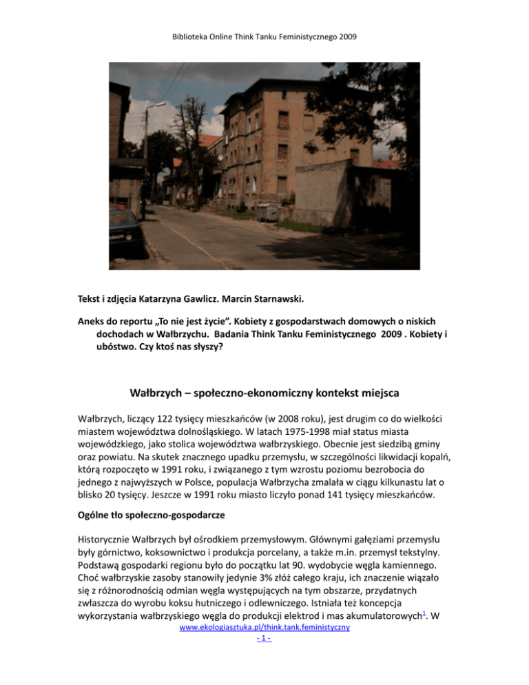 Biblioteka Online Think Tanku Feministycznego 2009 Tekst i zdjęcia Katarzyna Gawlicz. Marcin Starnawski. Aneks do reportu „To nie jest życie”. Kobiety z gospodarstwach domowych o niskich dochodach w Wałbrzychu. Badania Think Tanku Feministycznego 2009 . Kobiety i ubóstwo. Czy ktoś nas słyszy? Wałbrzych – społeczno-ekonomiczny kontekst miejsca Wałbrzych, liczący 122 tysięcy mieszkańców (w 2008 roku), jest drugim co do wielkości miastem województwa dolnośląskiego. W latach 1975-1998 miał status miasta wojewódzkiego, jako stolica województwa wałbrzyskiego. Obecnie jest siedzibą gminy oraz powiatu. Na skutek znacznego upadku przemysłu, w szczególności likwidacji kopalń, którą rozpoczęto w 1991 roku, i związanego z tym wzrostu poziomu bezrobocia do jednego z najwyższych w Polsce, populacja Wałbrzycha zmalała w ciągu kilkunastu lat o blisko 20 tysięcy. Jeszcze w 1991 roku miasto liczyło ponad 141 tysięcy mieszkańców. Ogólne tło społeczno-gospodarcze Historycznie Wałbrzych był ośrodkiem przemysłowym. Głównymi gałęziami przemysłu były górnictwo, koksownictwo i produkcja porcelany, a także m.in. przemysł tekstylny. Podstawą gospodarki regionu było do początku lat 90. wydobycie węgla kamiennego. Choć wałbrzyskie zasoby stanowiły jedynie 3% złóż całego kraju, ich znaczenie wiązało się z różnorodnością odmian węgla występujących na tym obszarze, przydatnych zwłaszcza do wyrobu koksu hutniczego i odlewniczego. Istniała też koncepcja wykorzystania wałbrzyskiego węgla do produkcji elektrod i mas akumulatorowych1. W www.ekologiasztuka.pl/think.tank.feministyczny -1- Biblioteka Online Think Tanku Feministycznego 2009 latach 80. na terenie Wałbrzycha działały trzy kopalnie („Thorez”, „Victoria” i „Wałbrzych”, wchodzące w skład Dolnośląskiego Zagłębia Węglowego. W połowie ostatniej dekady PRL zainicjowano budowę nowoczesnego szybu „Kopernik”, mającego połączyć istniejące kopalnie w jeden system wydobywczy2. Decyzję o przerwaniu budowy szybu podjęto na 9 miesięcy przed jego ukończeniem zaplanowanym na 1995 rok. Decyzja ta związana była z szerszym programem całkowitego zamknięcia kopalń w regionie wałbrzyskim. Podstawą likwidacji przemysłu węglowego w Dolnośląskim Zagłębiu Węglowym była uchwała Rady Ministrów z 23 października 1990 roku, powołująca Pełnomocnika ds. Restrukturyzacji Regionu Wałbrzyskiego. Już 15 listopada kopalnie postawiono w stan likwidacji, której zakończenie zaplanowano na koniec roku 1995. Zwraca się uwagę na niejasne okoliczności polityczne tego kroku, którego oficjalnym powodem był „rachunek ekonomiczny”. Decyzja specjalnej komisji powołanej w październiku 1990 roku do oceny opłacalności dalszego wydobycia zapadła zaledwie w 7 dni, a nieoficjalnie mówi się o politycznym rewanżu liberalnych elit pierwszych rządów „postsolidarnościowych” na sprzyjającym władzy PRL regionie określanym „Czerwonym Zagłębiem”3. Tło polityczne tych wydarzeń przybliża T. Dudź: „Po wyborach w czerwcu 1989 r. do władzy w kraju doszły inne siły polityczne. Dolnośląscy górnicy nie mieli swojej reprezentacji w Sejmie. Jeszcze w czasie kampanii [w 1989 r.] (…) późniejszy senator, prof. Włodzimierz Bojarski nie ukrywał swoich pomysłów likwidatorskich wobec Dolnośląskiego Zagłębia. Gorącym orędownikiem jego likwidacji okazał się późniejszy poseł Jan Lityński, a także liczni członkowie gabinetów premierów: Mazowieckiego i Bieleckiego, odwiedzający Wałbrzych”4. Likwidacja przemysłu wydobywczego spowodowała znaczący spadek ogólnej liczby zatrudnionych w Wałbrzychu: z ponad 58 tysięcy w 1989 roku do 35 tysięcy siedem lat później. W jednym tylko roku 1994 z kopalń zwolniono blisko 8 tysięcy zatrudnionych górników. Sytuację w mieście i regionie po kilku latach kapitalistycznej transformacji, tak opisują autorzy artykułu na temat historii wałbrzyskiego górnictwa: „Alkoholizm, bezrobocie, wzrastająca przestępczość i ulegająca dewastacji secesyjna substancja mieszkaniowa, którą niebawem podtopią (…) wody z zalanych kopalń, żebrzące przed sklepami dzieci i absolutny marazm – to dzisiejsza wizytówka Wałbrzycha. Do tego, podobnie jak w całym kraju, bezprawie pozostałych na rynku, niewielkich pracodawców (…)”. W całym regionie Zagłębia „najtrudniejszym był rok 1994, kiedy liczba szukających pracy na 31 XII wynosiła 87 240 osób. Potem zanotowano jej systematyczny spadek. Z końcem września 1998 r. naliczono 49 867 zarejestrowanych bezrobotnych. Wobec braku propozycji ze strony władz, ludzie po prostu opuszczają region. 3 tys. obywateli wymeldowano z samego Wałbrzycha w ostatnim kwartale roku 2004!”5. Na terenie Wałbrzycha działają trzy fabryki porcelany: „Krzysztof”, „Wałbrzych” i „Książ”. Ta ostatnia w 2004 roku została postawiona w stan likwidacji, co stało się przyczyną masowych zwolnień pracowników. www.ekologiasztuka.pl/think.tank.feministyczny -2- Biblioteka Online Think Tanku Feministycznego 2009 Na skutek zaistnienia bezrobocia strukturalnego oraz rosnącego ubóstwa, około roku 2001 lub wcześniej, pojawili się w Wałbrzychu tzw. biedaszybnicy, na własną rękę („nielegalnie”), prymitywnymi metodami wydobywający węgiel w dostępnych miejscach w okolicznych lasach i na polach. Organizacja, a właściwie samoorganizacja pracy w biedaszybach opiera się na kilkuosobowych brygadach kopiących w samodzielnie wydrążonych „dziuplach” sięgających kilku-kilkunastu metrów w głąb ziemi. Wydobywany w ten sposób surowiec przeznaczano na użytek własny lub na sprzedaż. Liczba pracujących w biedaszybach w szczytowym momencie osiągnęła nawet 2,5 tysiąca osób, skupiając w części byłych górników, a w okresie wakacyjnym obejmując również dzieci. Niebezpieczne warunki „dzikiego” wydobycia przyczyni