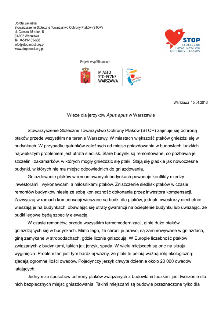 Dorota Zielińska Stowarzyszenie Stołeczne Towarzystwo Ochrony Ptaków (STOP) ul. Czeska 15 a lok. 5 03-902 Warszawa Tel. 0-519-185-668 [email protected] www.stop.most.org.pl Warszawa 15.04.2013 Wieże dla jerzyków Apus apus w Warszawie Stowarzyszenie Stołeczne Towarzystwo Ochrony Ptaków (STOP) zajmuje się ochroną ptaków przede wszystkim na terenie Warszawy. W miastach większość ptaków gnieździ się w budynkach. W przypadku gatunków zależnych od miejsc gniazdowania w budowlach ludzkich największym problemem jest utrata siedlisk. Stare budynki są remontowane, co pozbawia je szczelin i zakamarków, w których mogły gnieździć się ptaki. Stają się gładkie jak nowoczesne budynki, w których nie ma miejsc odpowiednich do gniazdowania. Gniazdowanie ptaków w remontowanych budynkach powoduje konflikty między inwestorami i wykonawcami a miłośnikami ptaków. Zniszczenie siedlisk ptaków w czasie remontów budynków niesie ze sobą konieczność dokonania przez inwestora kompensacji. Zazwyczaj w ramach kompensacji wieszane są budki dla ptaków, jednak inwestorzy niechętnie wieszają je na budynkach, obawiając się utraty gwarancji na ocieplenie budynku lub uważając, że budki lęgowe będą szpeciły elewację. W czasie remontów, przede wszystkim termomodernizacji, ginie dużo ptaków gnieżdżących się w budynkach. Mimo tego, że chroni je prawo, są zamurowywane w gniazdach, giną zamykane w stropodachach, gdzie licznie gniazdują. W Europie liczebność ptaków związanych z budynkami, takich jak jerzyk, spada. W wielu miejscach są one na skraju wyginięcia. Problem ten jest tym bardziej ważny, że ptaki te pełnią ważną rolę ekologiczną: zjadają ogromne ilości owadów. Pojedynczy jerzyk chwyta dziennie około 20 000 owadów latających. Jednym ze sposobów ochrony ptaków związanych z budowlami ludzkimi jest tworzenie dla nich bezpiecznych miejsc gniazdowania. Takimi miejscami są budowle przeznaczone tylko dla ptaków, zlokalizowane w pobliżu człowieka, ale nie powodujące konfliktów. Można je stawiać na terenach zielonych i zabudowanych. Trwałością znacznie przewyższają budki lęgowe. Są dobrym sposobem na ochronę jerzyka także dlatego, że zwracają uwagę ludności oraz mediów na ten gatunek. Wieże dają możliwość edukowania ludzi na temat biologii, ekologii i zagrożeń, jakie czyhają na jerzyki w budynkach. Budowle takie, tzw. wieże dla jerzyków (lub ptaków im pokrewnych) powstawały już w różnych miejscach świata. Wysoka na 21 metrów wieża dla, przypominających jerzyki, jaskółczaków modrych powstała w Griggsville w USA już w latach '60. Zawiera 562 miejsca lęgowe i stała się znakiem rozpoznawczym tego niewielkiego miasta, które świat poznał dzięki jaskółczakowi. Mieszkańcy miasteczka chwalą się, że dzięki ptakom, które osiedliły się w wieży pokonali plagę komarów. Okazała wieża lęgowa dla jerzyków powstała w Pekinie z okazji igrzysk olimpijskich. Podobny projekt z okazji olimpiady realizował Londyn. Swoją wieżę dla jerzyków ma także uniwersytet w Cambridge. Stowarzyszenie STOP postanowiło wybudować wieże dla jerzyków w Polsce. W 2011r. STOP ogłosił konkurs na najlepszą koncepcję wieży dla jerzyków. Honorowy patronat nad konkursem objęła prezydent Warszawy, Hanna Gronkiewicz Waltz. Na konkurs zgłoszono kilkadziesiąt ciekawych, profesjonalnych prac. Jedna została wybrana jako zwycięska, 6 wyróżniono. W roku 2012 STOP podjął działania zmierzające do budowy kilku wież w Warszawie. Pierwsza w Polsce wieża dla jerzyków powstała w grudniu 2012r. na warszawskiej Białołęce. Władze tej nadwiślańskiej dzielnicy chcą, aby jerzyki pomogły im w walce z komarami. Miasto sfinansowało wykonanie projektu według jednej z wyróżnionych koncepcji a także przeznaczyło pieniądze na budowę wieży. Również władze warszawskiej Pragi Południe poparły plan budowy wież na terenie tej dzielnicy. STOP szuka sponsorów wykonania projektów oraz budowy wież, chcąc aby Warszawa stała się polską stolicą jerzyka.
