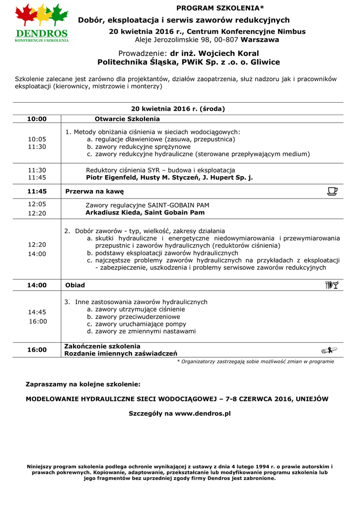 PROGRAM SZKOLENIA* Dobór, eksploatacja i serwis zaworów redukcyjnych 20 kwietnia 2016 r., Centrum Konferencyjne Nimbus Aleje Jerozolimskie 98, 00-807 Warszawa Prowadzenie: dr inż. Wojciech Koral Politechnika Śląska, PWiK Sp. z .o. o. Gliwice Szkolenie zalecane jest zarówno dla projektantów, działów zaopatrzenia, służ nadzoru jak i pracowników eksploatacji (kierownicy, mistrzowie i monterzy) 20 kwietnia 2016 r. (środa) 10:00 10:05 11:30 Otwarcie Szkolenia 1. Metody obniżania ciśnienia w sieciach wodociągowych: a. regulacje dławieniowe (zasuwa, przepustnica) b. zawory redukcyjne sprężynowe c. zawory redukcyjne hydrauliczne (sterowane przepływającym medium) 11:30 11:45 11:45 Reduktory ciśnienia SYR – budowa i eksploatacja Piotr Eigenfeld, Husty M. Styczeń, J. Hupert Sp. j. Przerwa na kawę 12:05 Zawory regulacyjne SAINT-GOBAIN PAM Arkadiusz Kieda, Saint Gobain Pam 12:20 12:20 14:00 14:00 14:45 16:00 16:00 2. Dobór zaworów - typ, wielkość, zakresy działania a. skutki hydrauliczne i energetyczne niedowymiarowania i przewymiarowania przepustnic i zaworów hydraulicznych (reduktorów ciśnienia) b. podstawy eksploatacji zaworów hydraulicznych c. najczęstsze problemy zaworów hydraulicznych na przykładach z eksploatacji - zabezpieczenie, uszkodzenia i problemy serwisowe zaworów redukcyjnych Obiad 3. Inne zastosowania zaworów hydraulicznych a. zawory utrzymujące ciśnienie b. zawory przeciwuderzeniowe c. zawory uruchamiające pompy d. zawory ze zmiennymi nastawami Zakończenie szkolenia Rozdanie imiennych zaświadczeń * Organizatorzy zastrzegają sobie możliwość zmian w programie Zapraszamy na kolejne szkolenie: MODELOWANIE HYDRAULICZNE SIECI WODOCIĄGOWEJ – 7-8 CZERWCA 2016, UNIEJÓW Szczegóły na www.dendros.pl Niniejszy program szkolenia podlega ochronie wynikającej z ustawy z dnia 4 lutego 1994 r. o prawie autorskim i prawach pokrewnych. Kopiowanie, adaptowanie, przekształcanie lub modyfikowanie programu szkolenia lub jego fragmentów bez uprzedniej zgody firmy Dendros jest zabronione.