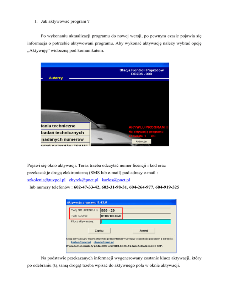 1. Jak aktywować program ? Po wykonaniu aktualizacji programu do nowej wersji, po pewnym czasie pojawia się informacja o potrzebie aktywowani programu. Aby wykonać aktywację należy wybrać opcję „Aktywuję” widoczną pod komunikatem. Pojawi się okno aktywacji. Teraz trzeba odczytać numer licencji i kod oraz przekazać je drogą elektroniczną (SMS lub e-mail) pod adresy e-mail : [email protected] [email protected] [email protected] lub numery telefonów : 602-47-33-42, 602-31-98-31, 604-264-977, 604-919-325 Na podstawie przekazanych informacji wygenerowany zostanie klucz aktywacji, który po odebraniu (tą samą drogą) trzeba wpisać do aktywnego pola w oknie aktywacji. Proszę w miarę możliwości z wyprzedzeniem zgłaszać zapotrzebowanie na klucze aktywacyjne i nie czekać do ostatniego dnia, chcielibyśmy uniknąć sytuacji (z wyjątkiem tych związanych z serwisem oprogramowania) w których trzeba generować klucze na telefon. Warunkiem wydania klucza jest terminowe rozliczanie się z firmą TUVPOL.