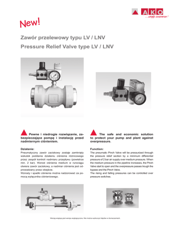 New! Zawór przelewowy typu LV / LNV Pressure Relief Valve type LV / LNV Pewne i niedrogie rozwiązanie, zabezpieczające pompę i instalację przed nadmiernym ciśnieniem. The safe and economic solution to protect your pump and plant against overpressure. Działanie: Function: Pneumatyczny zawór zaciskowy zostaje zamknięty wskutek poddania działaniu ciśnienia różnicowego przez zespół kontroli nadmiaru przepływu (powietrze min. 2 bar). Wzrost ciśnienia medium w rurociągu otwiera zawór zaciskowy, a nadmiar ciśnienia jest odprowadzany przez obejście. Wzrosty i spadki ciśnienia można nadzorować za pomocą wyłącznika ciśnieniowego. The pneumatic Pinch Valve will be pressurized through the pressure relief section by a minimum differential pressure of 2 bar air supply over medium pressure. When the medium pressure in the pipeline increases, the Pinch Valve start to open and the overpressure passes trough the bypass and the Pinch Valve. The rising and falling pressures can be controlled over pressure switches. Wersją wiążącą jest wersja anglojęzyczna. Nie można wykluczyć błędów w tłumaczeniach. Wykonania: Typ LV - podłączone zasilanie sprężonym powietrzem (z manometrem) i 2 wyłącznikami ciśnieniowymi. Options: Type LV if control air is available (incl. pressure gauge) and 2 pressure switches. Typ LNV niepodłączone zasilania sprężonym powietrzem Type LV if control air is available 95mm 125mm 4 2 0 Akcesoria: W przyapdku zastosowań bez udziału sprężonego powietrza (sprężarka) można dla typu LNV otrzymać opcjonalnie pompę ręczną (typ LP...). bar 6 8 10 The valve unit consists either of a pneumatic pinch valve plus relief section or to be used as an addition on existing pinch valves. Additional information upon request. . Accessories: For type LNV a handpump is available for an independent use from any air supply (compressor). Dziedziny przemysłowe: • Przemysł chemiczny • Przemysł spożywczy • Produkcja napojów • Przemysł farmaceutyczny • Przemysł papierniczy • Oczyszczalnie ścieków • Przemysł ceramiczny • Produkcja tworzyw sztucznych • Cementownie • Produkcja zapraw budowlanych i wiele innych Industrial areas: • Chemical• Food• Beverage• Pharmaceutical• Paper• Water• Ceramics• Plastic• Cement• Motar industry and many others Zastrzega się prawo do dokonywania zmian technicznych. Technical changes kept in reserve. AKO Armaturen & Separations GmbH D-65468 Trebur-Astheim ▪ Adam-Opel-Str. 5 ▪ Telefon: +49 (0) 61 47-9159-0 ▪ Faks: +49 (0) 61 47-9159-59 E-mail: [email protected] ▪ Internet: www.ako-armaturen.de Wersją wiążącą jest wersja anglojęzyczna. Nie można wykluczyć błędów w tłumaczeniach. DHE 001_pl - 03/2009 Zespół składa się ze sterowanego pneumatycznie zaworu zaciskowego z zespołem kontroli nadmiaru przepływu, natomiast w przypadku już zamontowanych zaworów zaciskowych otrzymują one dodatkowy osprzęt. Bliższe informacje - na zapytanie. AKO