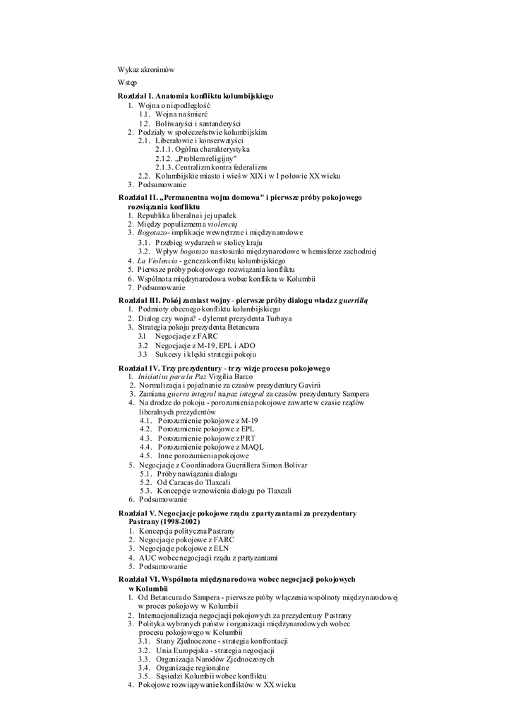 Wykaz akronimów Wstęp Rozdział I. Anatomia konfliktu kolumbijskiego 1. Wojna o niepodległość 1.1. Wojna na śmierć 1.2. Boliwaryści i santanderyści 2. P odziały w społeczeństwie kolumbijskim 2.1. Liberałowie i konserwatyści 2.1.1. Ogólna charakterystyka 2.1.2. „P roblem religijny" 2.1.3. Centralizm kontra federalizm 2.2. Kolumbijskie miasto i wieś w XIX i w I połowie XX wieku 3. P odsumowanie Rozdział II. „Permanentna wojna domowa" i pierwsze próby pokojowego rozwiązania konf liktu 1. Republika liberalna i jej upadek 2. Między populizmem a violenciq 3. Bogotazo- implikacje wewnętrzne i międzynarodowe 3.1. P rzebieg wydarzeń w stolicy kraju 3.2. Wpływ bogotazo na stosunki międzynarodowe w hemisferze zachodniej 4. La Violencia - geneza konfliktu kolumbijskiego 5. P ierwsze próby pokojowego rozwiązania konfliktu 6. Wspólnota międzynarodowa wobec konfliktu w Kolumbii 7. P odsumowanie Rozdział III. Pokój zamiast wojny - pierwsze próby dialogu władz z guerrillą 1. P odmioty obecnego konfliktu kolumbijskiego 2. Dialog czy wojna? - dylemat prezydenta Turbaya 3. Strategia pokoju prezydenta Betancura 3.1 Negocjacje z FARC 3.2 Negocjacje z М-19, EPL i ADO 3.3 Sukcesy i klęski strategii pokoju Rozdział IV. Trzy pre zydentury - tr zy wizje procesu pokojowego 1. Iniciativa para la Paz Virgilia Barco 2. Normalizacja i pojednanie za czasów prezydentury Gavirii 3. Zamiana guerra integral na paz integral za czasów prezydentury Sampera 4. Na drodze do pokoju - porozumienia pokojowe zawarte w czasie rządów liberalnych prezydentów 4.1. P orozumienie pokojowe z M-19 4.2. P orozumienie pokojowe z EPL 4.3. P orozumienie pokojowe z P RT 4.4. P orozumienie pokojowe z MAQL 4.5. Inne porozumienia pokojowe 5. Negocjacje z Coordinadora Guerrillera Simon Bolivar 5.1. P róby nawiązania dialogu 5.2. Od Caracas do Tlaxcali 5.3. Koncepcje wznowienia dialogu po Tlaxcali 6. P odsumowanie Rozdział V. Negocjacje pokojowe rządu z partyzantami za prezydentury Pastrany (1998-2002) 1. Koncepcja polityczna P astrany 2. Negocjacje pokojowe z FARC 3. Negocjacje pokojowe z ELN 4. AUC wobec negocjacji rządu z partyzantami 5. P odsumowanie Rozdział VI. Wspólnota międzynarodowa wobec negocjacji pokojowych w Kolumbii 1. Od Betancura do Sampera - pierwsze próby włączenia wspólnoty międzynarodowej w proces pokojowy w Kolumbii 2. Internacjonalizacja negocjacji pokojowych za prezydentury P astrany 3. P olityka wybranych państw i organizacji międzynarodowych wobec procesu pokojowego w Kolumbii 3.1. Stany Zjednoczone - strategia konfrontacji 3.2. Unia Europejska - strategia negocjacji 3.3. Organizacja Narodów Zjednoczonych 3.4. Organizacje regionalne 3.5. Sąsiedzi Kolumbii wobec konfliktu 4. P okojowe rozwiązywanie konfliktów w XX wieku P odsumowanie Bibliografia