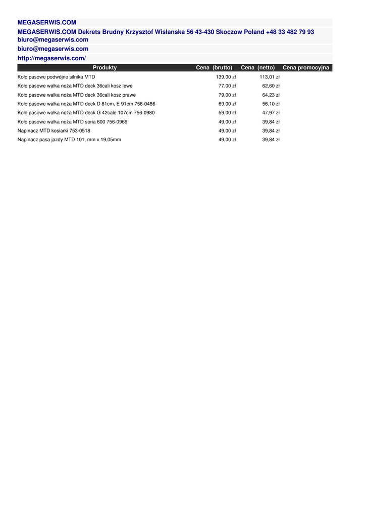 MEGASERWIS.COM MEGASERWIS.COM Dekrets Brudny Krzysztof Wislanska 56 43-430 Skoczow Poland +48 33 482 79 93 [email protected] [email protected] http://megaserwis.com/ Produkty Koło pasowe podwójne silnika MTD Cena (brutto) Cena (netto) Cena promocyjna 139,00 zł 113,01 zł Koło pasowe wałka noża MTD deck 36cali kosz lewe 77,00 zł 62,60 zł Koło pasowe wałka noża MTD deck 36cali kosz prawe 79,00 zł 64,23 zł Koło pasowe wałka noża MTD deck D 81cm, E 91cm 756-0486 69,00 zł 56,10 zł Koło pasowe wałka noża MTD deck G 42cale 107cm 756-0980 59,00 zł 47,97 zł Koło pasowe wałka noża MTD seria 600 756-0969 49,00 zł 39,84 zł Napinacz MTD kosiarki 753-0518 49,00 zł 39,84 zł Napinacz pasa jazdy MTD 101, mm x 19,05mm 49,00 zł 39,84 zł