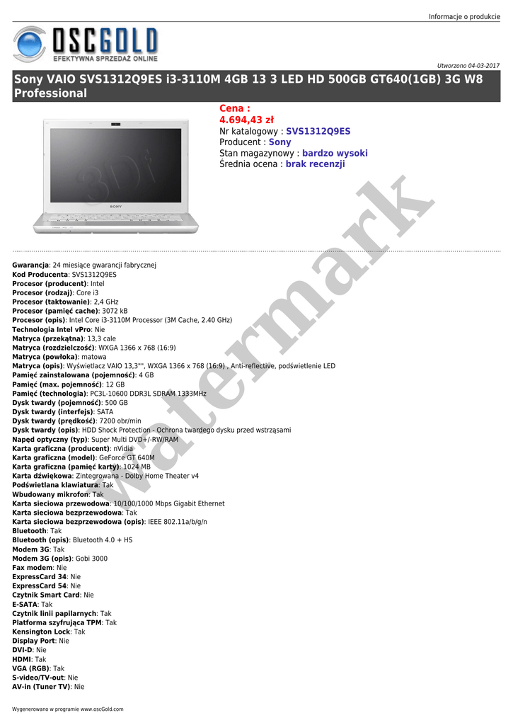 Informacje o produkcie Utworzono 04-03-2017 Sony VAIO SVS1312Q9ES i3-3110M 4GB 13 3 LED HD 500GB GT640(1GB) 3G W8 Professional Cena : 4.694,43 zł er m ar k Nr katalogowy : SVS1312Q9ES Producent : Sony Stan magazynowy : bardzo wysoki Średnia ocena : brak recenzji w at Gwarancja: 24 miesiące gwarancji fabrycznej Kod Producenta: SVS1312Q9ES Procesor (producent): Intel Procesor (rodzaj): Core i3 Procesor (taktowanie): 2,4 GHz Procesor (pamięć cache): 3072 kB Procesor (opis): Intel Core i3-3110M Processor (3M Cache, 2.40 GHz) Technologia Intel vPro: Nie Matryca (przekątna): 13,3 cale Matryca (rozdzielczość): WXGA 1366 x 768 (16:9) Matryca (powłoka): matowa Matryca (opis): Wyświetlacz VAIO 13,3"", WXGA 1366 x 768 (16:9) , Anti-reflective, podświetlenie LED Pamięć zainstalowana (pojemność): 4 GB Pamięć (max. pojemność): 12 GB Pamięć (technologia): PC3L-10600 DDR3L SDRAM 1333MHz Dysk twardy (pojemność): 500 GB Dysk twardy (interfejs): SATA Dysk twardy (prędkość): 7200 obr/min Dysk twardy (opis): HDD Shock Protection - Ochrona twardego dysku przed wstrząsami Napęd optyczny (typ): Super Multi DVD+/-RW/RAM Karta graficzna (producent): nVidia Karta graficzna (model): GeForce GT 640M Karta graficzna (pamięć karty): 1024 MB Karta dźwiękowa: Zintegrowana - Dolby Home Theater v4 Podświetlana klawiatura: Tak Wbudowany mikrofon: Tak Karta sieciowa przewodowa: 10/100/1000 Mbps Gigabit Ethernet Karta sieciowa bezprzewodowa: Tak Karta sieciowa bezprzewodowa (opis): IEEE 802.11a/b/g/n Bluetooth: Tak Bluetooth (opis): Bluetooth 4.0 + HS Modem 3G: Tak Modem 3G (opis): Gobi 3000 Fax modem: Nie ExpressCard 34: Nie ExpressCard 54: Nie Czytnik Smart Card: Nie E-SATA: Tak Czytnik linii papilarnych: Tak Platforma szyfrująca TPM: Tak Kensington Lock: Tak Display Port: Nie DVI-D: Nie HDMI: Tak VGA (RGB): Tak S-video/TV-out: Nie AV-in (Tuner TV): Nie Wygenerowano w programie www.oscGold.com w at er m ar k Line-in: Nie Line-out: Tak Wejście mikrofonu: Tak S/PDIF: Nie RS232 (szeregowy): Nie Czytnik kart pamięci: Tak Czytnik kart pamięci (opis): Memory Stick Duo, SD, SDHC, SDXC compatible, UHS (SDR50) supported Panel klawiszy multimedialnych: Nie Złącze replikatora portów: Nie Fire-Wire (IEEE1394): Nie USB 2.0: 1 szt. USB 3.0: 2 szt. System operacyjny: Windows 8 Professional 64 bit System operacyjny (wer. Językowa): polski Dodatkowe oprogramowanie: Preinstalowany Office 2010 pełna aktywacja po zakupie klucza produktu Office 2010, Windows Live Essentials 2011, Adobe Reader 10, 30-dniowa subskrypcja McAfee Internet Security Wbudowana kamera: Tak Wbudowana kamera (rozdzielczość): 1 ,31 Wbudowana kamera (opis): Wbudowana kamera internetowa HD o rozdzielczości 1280 x 1024; 1.31 MPix Wbudowana kamera obrotowa: Nie Urządzenie wskazujące: Touch Pad (z obsługą gestów) Akumulator (technologia): Akumulator Litowo-jonowy - VGP-BPS24 Wymiary (wysokość): 23,9 mm Wymiary (szerokość): 331 mm Wymiary (głębokość): 225 mm Gwarancja: 24 mies Gwarancja międzynarodowa: Tak Gwarancja baterii: 12 mies Wyposażenie: Zasilacz sieciowy (VGP-AC19V32) Opis: Kolor: Silver
