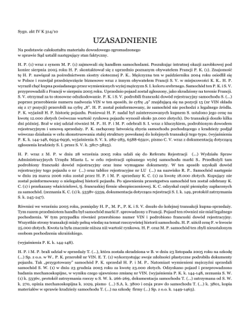 Sygn. akt IV K 314/10 UZASADNIENIE Na podstawie całokształtu materiału dowodowego zgromadzonego w sprawie Sąd ustalił następujący stan faktyczny. H. P. (1) wraz z synem M. P. (1) zajmowali się handlem samochodami. Poszukując intratnej okazji zarobkowej pod koniec sierpnia 2005 roku H. P. skontaktował się z uprzednio poznanym obywatelem Francji P. K. (1). Znajomość tę H. P. nawiązał za pośrednictwem siostry ciotecznej P. K.. Mężczyzna ten w październiku 2004 roku osiedlił się w Polsce i rozwijał przedsięwzięcie biznesowe wraz z innym obywatelem Francji S. V. w miejscowości K. K.. H. P. wyraził chęć kupna posiadanego przez wymienionych wyżej mężczyzn S. I. koloru srebrnego. Samochód ten P. K. i S. V. przyprowadzili z Francji w sierpniu 2005 roku. Uprzednio pojazd został zgłoszony, jako skradziony na terenie Francji. S. V. otrzymał za to stosowne odszkodowanie. P. K. i S. V. podrobili francuski dowód rejestracyjny samochodu S. (...) poprzez przerobienie numeru nadwozia VIN w ten sposób, że cyfrę „9” znajdującą się na pozycji 15 (nr VIN składa się z 17 pozycji) przerobili na cyfrę „8”. H. P. został poinformowany, że samochód nie pochodzi z legalnego źródła. P. K. wyjaśnił H. P. historię pojazdu. Ponieważ H. P. nadal był zainteresowanych kupnem S. ustalono jego cenę na kwotę 12.000 złotych (wówczas wartość rynkowa pojazdu wynosił około 30.000 złotych). Do transakcji doszło kilka dni później. Brał w niej udział również M. P.. H. P. i M. P. odebrali S. I. wraz z kluczykiem, podrobionym dowodem rejestracyjnym i umową sprzedaży. P. K. zachęcony łatwością zbycia samochodu pochodzącego z kradzieży podjął wówczas działania w celu skonstruowania stałej struktury powołanej do kolejnych transakcji tego typu. (wyjaśnienia P. K. k. 144-148, 6934-6936, wyjaśnienia S. V. k. 282-283, 6588-6591v, pismo C. V. wraz z dokumentacją dotyczącą zgłoszenia kradzieży S. I. przez S. V. k. 3817-3825). H. P. wraz z M. P. w dniu 28 września 2005 roku udali się do Referatu Rejestracji (...) Wydziału Spraw Administracyjnych Urzędu Miasta L. w celu rejestracji opisanego wyżej samochodu marki S.. Przedłożyli tam podrobiony francuski dowód rejestracyjny oraz inne wymagane dokumenty. W ten sposób uzyskali dowód rejestracyjny tego pojazdu o nr (...) oraz tablice rejestracyjne nr LU (...) na nazwisko R. P.. Samochód następnie w dniu 29 marca 2006 roku został przez H. P. i M. P. sprzedany K. C. (1) za kwotę 18.000 złotych. Kupujący nie został poinformowany o nielegalnej historii pojazdu. Po ujawnieniu przestępstwa samochód ten został odebrany K. C. (1) i przekazany właścicielowi, tj. francuskiej firmie ubezpieczeniowej. K. C. odzyskał część pieniędzy zapłaconych za samochód. (zeznania K. C. (1) k. 5338v-5339, dokumentacja dotycząca rejestracji S. I. k. 149, protokół zatrzymania S. k. 245-247). Również we wrześniu 2005 roku, pomiędzy H. P., M. P., P. K. i S. V. doszło do kolejnej transakcji kupna-sprzedaży. Tym razem przedmiotem handlu był samochód marki F. sprowadzony z Francji. Pojazd ten również nie miał legalnego pochodzenia. W tym przypadku również przerobiono numer VIN i podrobiono francuski dowód rejestracyjny. Wszystkie strony transakcji miały pełną wiedzę na temat rzeczywistej historii samochodu. H. P. uiścił cenę F. w kwocie 25.000 złotych. Kwota ta była znacznie niższa niż wartość rynkowa. H. P. oraz M. P. samochód ten zbyli nieustalonym osobom pochodzenia ukraińskiego. (wyjaśnienia P. K. k. 144-148). H. P. i M. P. brali udział w sprzedaży T. (...), która została skradziona w B. w dniu 23 listopada 2005 roku na szkodę (...) Sp. z o.o. w W.. P. K. przerobił nr VIN. E. T. (1) wykorzystując swoje zdolności plastyczne podrobiła dokumenty pojazdu. Tak „przygotowany” samochód P. K. sprzedał H. P. i M. P.. Natomiast wymienieni mężczyźni sprzedali samochód S. W. (1) w dniu 23 grudnia 2005 roku za kwotę 23.000 złotych. Odzyskano pojazd i przeprowadzono badania mechanoskopijne, w wyniku czego ujawniono zmianę nr VIN. (wyjaśnienia P. K. k. 144-148, zeznania S. W. (1) k. 5336v, protokół zatrzymania rzeczy u S. W. k. 266-269, dokumentacja samochodu T. (...) zatrzymana od S. W. k. 270, opinia mechanoskopijna k. 1029, pismo (...) S.A. k. 3800 i cesja praw do samochodu T. (...) k. 3801, kopia materiałów w sprawie kradzieży samochodu T. (...) na szkodę firmy (...) Sp. z o.o. k. 1449-1463). H. P. wspólnie i w porozumieniu z synem M. P. w dniu 7 listopada 2005 roku sprzedali J. L. (1) samochód marki P. (...) za kwotę 18.000 złotych. Samochód pochodził z kradzieży dokonanej w dniu 31 października 2005 roku na szkodę Euro Bank (...). Pojazd został uprzednio zakupiony przez T. P. (1) a następnie przekazany P. K.. Wówczas przerobiono nr VIN, zaś E. T. przygotowała podrobione dokumenty. H. P. i M. P. mieli widzę o faktycznym, nielegalnym pochodzeniu P.. Samochód został zarejestrowany na nazwisko W. L. i otrzymał nr rej. (...). Po odzyskaniu pojazdu przeprowadzono badania mechanoskopijne, które ujawniły zmianę nr VIN. Samochód został zwrócony firmie ubezpieczeniowej. (kopia materiałów w prawie kradzieży P. (...) k. 1426-1443, zeznania J. L. (1) k. 5357v-5358, zeznania G. L. (1) k.5584v-5585, opinia mechanoskopijna k. 1174-1175, wyjaśnienia S. V. k. 282-283, wyjaśnienia P. K. k. 144-148, dokumentacja zabezpieczona od J. L. (1) k. 700-720). H. P. brał również udział w sprzedaży samochodu T. (...) o pierwotnym nr rej. (...) o wartości 27.300 złotych. Pojazd został skradziony w okresie między od 15 do 17 lutego 2006 roku na szkodę A. B. (1). Samochód został przekazany P. K. przez T. P.. Przerobiono wówczas nr VIN. E. T. podrobiła francuskie dokumenty samochodu. H. P. podjął próbę zarejestrowania przedmiotowej T. na nazwisko J. P. (1). W Urzędzie Celnym, podczas dopełniania formalności J. P. (1) została poinfo