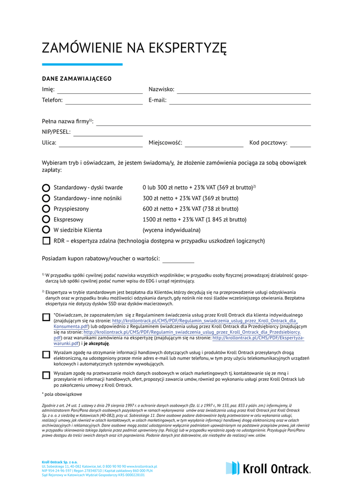 ZAMÓWIENIE NA EKSPERTYZĘ DANE Z AMAWIA JĄCEGO Imię: Nazwisko: Telefon: E-mail: Pełna nazwa firmy1): NIP/PESEL: Ulica: Miejscowość: Kod pocztowy: Wybieram tryb i oświadczam, że jestem świadoma/y, że złożenie zamówienia pociąga za sobą obowiązek zapłaty: Standardowy - dyski twarde 0 lub 300 zł netto + 23% VAT (369 zł brutto)2) Standardowy - inne nośniki 300 zł netto + 23% VAT (369 zł brutto) Przyspieszony 600 zł netto + 23% VAT (738 zł brutto) Ekspresowy 1500 zł netto + 23% VAT (1 845 zł brutto) W siedzibie Klienta (wycena indywidualna) RDR – ekspertyza zdalna (technologia dostępna w przypadku uszkodzeń logicznych) Posiadam kupon rabatowy/voucher o wartości: 1) przypadku spółki cywilnej podać nazwiska wszystkich wspólników; w przypadku osoby fizycznej prowadzącej działalność gospoW darczą lub spółki cywilnej podać numer wpisu do EDG i urząd rejestrujący. 2) kspertyza w trybie standardowym jest bezpłatna dla Klientów, którzy decydują się na przeprowadzenie usługi odzyskiwania E danych oraz w przypadku braku możliwości odzyskania danych, gdy nośnik nie nosi śladów wcześniejszego otwierania. Bezpłatna ekspertyza nie dotyczy dysków SSD oraz dysków macierzowych. * Oświadczam, że zapoznałem/am się z Regulaminem świadczenia usług przez Kroll Ontrack dla klienta indywidualnego (znajdującym się na stronie: http://krollontrack.pl/CMS/PDF/Regulamin_swiadczenia_uslug_przez_Kroll_Ontrack_dla_ Konsumenta.pdf) lub odpowiednio z Regulaminem świadczenia usług przez Kroll Ontrack dla Przedsiębiorcy (znajdującym się na stronie: http://krollontrack.pl/CMS/PDF/Regulamin_swiadczenia_uslug_przez_Kroll_Ontrack_dla_Przedsiebiorcy. pdf) oraz warunkami zamówienia na ekspertyzę (znajdującym się na stronie: http://krollontrack.pl/CMS/PDF/Ekspertyzawarunki.pdf) i je akceptuję. Wyrażam zgodę na otrzymanie informacji handlowych dotyczących usług i produktów Kroll Ontrack przesyłanych drogą elektroniczną, na udostępniony przeze mnie adres e-mail lub numer telefonu, w tym przy użyciu telekomunikacyjnych urządzeń końcowych i automatycznych systemów wywołujących. Wyrażam zgodę na przetwarzanie moich danych osobowych w celach marketingowych tj. kontaktowanie się ze mną i przesyłanie mi informacji handlowych, ofert, propozycji zawarcia umów, również po wykonaniu usługi przez Kroll Ontrack lub po zakończeniu umowy z Kroll Ontrack. * pola obowiązkowe Zgodnie z art. 24 ust. 1 ustawy z dnia 29 sierpnia 1997 r. o ochronie danych osobowych (Dz. U. z 1997 r., Nr 133, poz. 833 z późn. zm.) informujemy, iż administratorem Pani/Pana danych osobowych pozyskanych w ramach wykonywania umów oraz świadczenia usług przez Kroll Ontrack jest Kroll Ontrack Sp. z o. o. z siedzibą w Katowicach (40-082), przy ul. Sobieskiego 11. Dane osobowe podane dobrowolnie będą przetwarzane w celu wykonania usługi, realizacji umowy, jak również w celach kontaktowych, w celach marketingowych, w tym wysyłania informacji handlowej drogą elektroniczną oraz w celach archiwizacyjnych i reklamacyjnych. Dane osobowe mogą zostać udostępnione wyłącznie podmiotom upoważnionym na podstawie przepisów prawa, jak również w przypadku skierowania takiego żądania przez podmiot uprawniony (np. Policję) lub w przypadku wyrażenia zgody na udostępnienie. Przysługuje Pani/Panu prawo dostępu do treści swoich danych oraz ich poprawiania. Podanie danych jest dobrowolne, ale niezbędne do realizacji ww. celów. Kroll Ontrack Sp. z o.o. Ul. Sobeskiego 11, 40-082 Katowice, tel. 0 800 90 90 90 www.krollontrack.pl NIP 954-24-96-597 | Regon 278348710 | Kapitał zakładowy 860 000 PLN Sąd Rejonowy w Katowicach Wydział Gospodarczy KRS 0000228101 DANE TECHNICZNE DANE NOŚNIKA Producent Model: Nr seryjny SYSTEM OPERACYJNY DOS/WIN 9X/ME inny: WIN 2K/XP/NT wersja: NetWare LINUX/UNIX MAC OS system plików: ILOŚĆ / WIELKOŚĆ PART YC JI: NA JWA ŻNIE JSZE DANE DO ODZ YSK ANIA: OPISZ OB JAW Y USZKODZENIA: USZKODZONY NOŚNIK: ✔ może być otwarty w sterylnych warunkach ✔ ma być odesłany z powrotem Zamawiam ekspertyzę załączonego nośnika pod kątem możliwości odzyskania z niego danych. data: _________________ _____________________________________________________________ czytelny podpis osoby upoważnionej do reprezentacji oraz jej stanowisko Kroll Ontrack Sp. z o.o. Ul. Sobeskiego 11, 40-082 Katowice, tel. 0 800 90 90 90 www.krollontrack.pl NIP 954-24-96-597 | Regon 278348710 | Kapitał zakładowy 860 000 PLN Sąd Rejonowy w Katowicach Wydział Gospodarczy KRS 0000228101 ___________________ pieczęć Zleceniodawcy