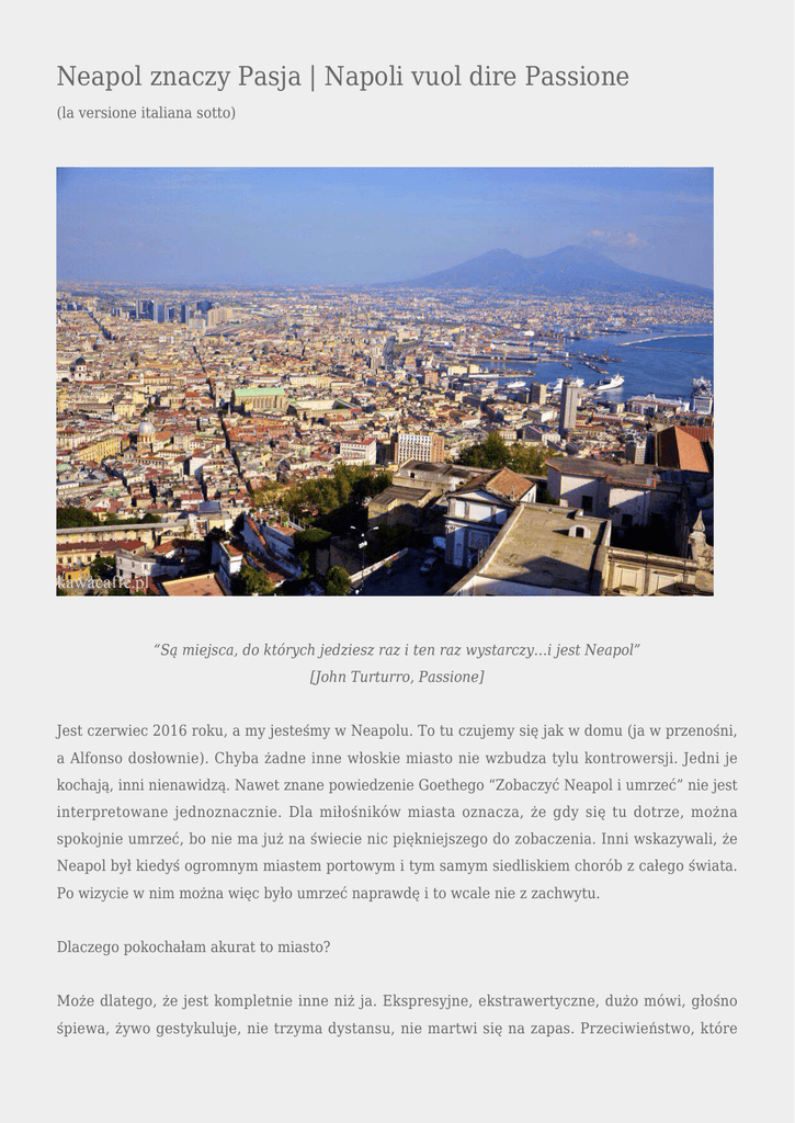 Neapol znaczy Pasja | Napoli vuol dire Passione (la versione italiana sotto) “Są miejsca, do których jedziesz raz i ten raz wystarczy…i jest Neapol” [John Turturro, Passione] Jest czerwiec 2016 roku, a my jesteśmy w Neapolu. To tu czujemy się jak w domu (ja w przenośni, a Alfonso dosłownie). Chyba żadne inne włoskie miasto nie wzbudza tylu kontrowersji. Jedni je kochają, inni nienawidzą. Nawet znane powiedzenie Goethego “Zobaczyć Neapol i umrzeć” nie jest interpretowane jednoznacznie. Dla miłośników miasta oznacza, że gdy się tu dotrze, można spokojnie umrzeć, bo nie ma już na świecie nic piękniejszego do zobaczenia. Inni wskazywali, że Neapol był kiedyś ogromnym miastem portowym i tym samym siedliskiem chorób z całego świata. Po wizycie w nim można więc było umrzeć naprawdę i to wcale nie z zachwytu. Dlaczego pokochałam akurat to miasto? Może dlatego, że jest kompletnie inne niż ja. Ekspresyjne, ekstrawertyczne, dużo mówi, głośno śpiewa, żywo gestykuluje, nie trzyma dystansu, nie martwi się na zapas. Przeciwieństwo, które przyciąga. Sprawia, że i ja zaczynam szybciej mówić i głośniej się śmiać. Lubię to miasto za nieoczywistość i za to, że ciągle wymaga uważności. To nie miejsce, gdzie można bez zastanowienia zrobić setkę sielankowych zdjęć. Czasem trzeba naprawdę porządnie poszukać, by dostrzec coś pięknego. Tym większa satysfakcja, gdy się to piękno odnajdzie. Jeśli miałabym wybrać tylko jedno słowo, z którym kojarzy mi się Neapol byłaby to “muzyka”. Pisaliśmy o niej już w ostatnim poście TU, a dzisiaj chcemy zachęcić Was do obejrzenia pewnego dokumentu. Mowa o “Passione” Johna Turturro. Wprowadzi Was on w świat muzyki neapolitańskiej. O oprowadzenie Was po miejscach, w których został nakręcony kiedyś zadbamy z kolei my ;) “To miasto namalowane dźwiękami, a muzyka jest jego nieodłączną częścią” Dajcie porwać się tym dźwiękom, naprawdę warto! http://ninateka.pl/film/passione-john-turturro Napoli vuol dire Passione “Ci sono posti in cui vai una volta sola e ti basta… e poi c’è Napoli” [John Turturro, Passione] Giugno 2016. Siamo a Napoli, nella città dove ci sentiamo come a casa nostra (io in senso figurato e Alfonso letteralmente). Probabilmente nessun’altra città italiana suscita tante polemiche. O viene amata o viene odiata. Pure una famosa frase di Goethe “Vedi Napoli e poi muori” è interpretata in modi diversi. Per gli amanti della città significa che dopo averla visitata si può morire tranquillamente perché in tutto il mondo non c’è un posto più bello da vedere. Gli altri indicavano invece che una volta Napoli era la città con un grande porto e per questo motivo qui si diffondevano tante malattie da tutto il mondo. Cosi, dopo esserci stati, la morte era molto probabile ma purtroppo non a causa dell’ ammirazione per la città. Perchè mi sono innamorata di questa città? Forse perchè è completamente diversa da me. Espressiva, estroversa, parla molto, canta a voce alta, gesticola velocemente, non tiene la distanza, non si preoccupa troppo. L’opposto che attira. Che mi fa parlare velocemente e ridere più forte. Mi piace la città perchè non è ovvia e perchè richiede da me maggiore attenzione. Non è un posto dove si possono scattare centinaia di foto iddilliache. Qualche volta bisogna guardare attorno con tanta attenzione per vedere qualcosa di bello. E’ più grande la soddisfazione dopo aver trovato una bellezza non sempre ovvia. Se dovessi scegliere solo una parola che mi fa pensare a Napoli sceglierei “la musica”. Ne abbiamo scritto nel nostro ultimo post QUA e oggi vi invogliamo a guardare un documentario musicale. Intendiamo “Passione” di John Turtutto che vi fa entrare nel mondo della musica napoletana. Noi invece una volta vi faremo vedere i posti dove è stato girato;) “Questa città è „dipinta” di suoni, e la musica ne è un elemento essenziale” Lasciate che questi suonivi rapiscano, davvero vale la pena! http://ninateka.pl/film/passione-john-turturro Muzyka neapolitańska | La musica napoletana (la versione italiana sotto) Muzyka w języku neapolitańskim, ze swoim romantyzmem i melodią, pozwalała marzyć i rozkochała w sobie całe pokolenia. Dzisiaj przygotowaliśmy dla Was pierwszą listę pięciu piosenek neapolitańskich, które ułatwią Wam zrozumienie piękna Neapolu i jego mieszkańców. I’ te vurria vasà (Io ti vorrei baciare) – 1900 rok Utwór ten nawiązuje do burzliwej miłości autora, Vincenzo Russo, do Enrichetty Marchese. Delikatne dźwięki idealnie łączą się z tekstem, który opowiada o chwili bliskości pomiędzy zakochanymi w ogrodzie pachnącym malwami i oświetlonym światłem poranka. Poniżej posłuchacie przepięknej wersji w wykonaniu Miny. Tekst: http://www.tekstowo.pl/piosenka,mina,i__te_vurria_vas_.html ‘O Sole mio (Il mio sole) – 1898 rok To z pewnością najbardziej popularna i znana na całym świecie piosenka neapolitańska, śpiewana przez wielu wykonawców, także zagranicznych. Podobno muzyka do tego utworu nie została skomponowana w Neapolu, a w Odessie na Ukrainie, gdzie muzyk Eduardo di Capua przebywał z powodu swojego ojca, także muzyka grającego w orkiestrze. Tekst z kolei napisany został przez Giovanniego Capurro, dziennikarza dziennika “Roma”. Niestety utwór, mimo że ciągle popularny, nie odniósł na początku żadnego sukcesu, a jego twórcy zmarli w biedzie nie zyskując sławy. Poniżej znajdziecie wersję w wykonaniu mistrza Luciano Pavarotti. Tekst z tłumaczeniem: http://www.tekstowo.pl/piosenka,luciano_pavarotti,o_sole_mio.html ‘O Surdato ‘Nnamorato (Il soldato innamorato) – 1915 rok Także ten utwór należy do najbardziej popularnych tekstów neapolitańskich. Autorem tekstu był Aniello Califano, a muzyki- Enrico Cannio. Piosenka opisuje smutek żołnierza walczącego na froncie podczas I wojny światowej, t