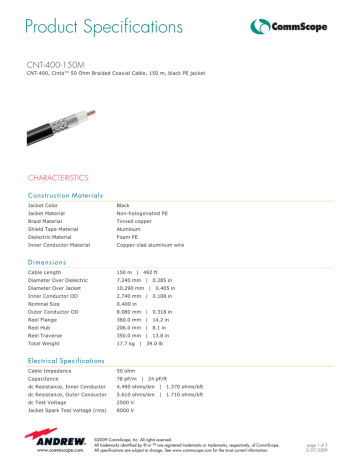 Product Specifications CNT-400-150M CNT400, Cinta™ 50 Ohm Braided Coaxial Cable, 150 m, black PE jacket CHARACTERISTICS Construction Materials Jacket Color Black Jacket Material Nonhalogenated PE Braid Material Tinned copper Shield Tape Material Aluminum Dielectric Material Foam PE Inner Conductor Material Copperclad aluminum wire Dimensions Cable Length 150 m | 492 ft Diameter Over Dielectric 7.240 mm | 0.285 in Diameter Over Jacket 10.290 mm | 0.405 in Inner Conductor OD 2.740 mm | 0.108 in Nominal Size 0.400 in Outer Conductor OD 8.080 mm | 0.318 in Reel Flange 360.0 mm | 14.2 in Reel Hub 206.0 mm | 8.1 in Reel Traverse 350.0 mm | 13.8 in Total Weight 17.7 kg | 39.0 lb Electrical Specifications Cable Impedance 50 ohm Capacitance 78 pF/m | 24 pF/ft dc Resistance, Inner Conductor 4.490 ohms/km | 1.370 ohms/kft dc Resistance, Outer Conductor 5.610 ohms/km | 1.710 ohms/kft dc Test Voltage 2500 V Jacket Spark Test Voltage (rms) 8000 V ©2009 CommScope, Inc. All rights reserved. All trademarks identified by ® or ™ are registered trademarks or trademarks, respectively, of CommScope. All specifications are subject to change. See www.commscope.com for the most current information. page 1 of 3 5/27/2009 Product Specifications CNT-400-150M Maximum Frequency 16.20 GHz Operating Frequency Band 30 – 6000 MHz Peak Power 16.0 kW Shielding Effectiveness >90 dB Velocity 85% Environmental Specifications Installation Temperature 40 °C to +85 °C ( 40 °F to +185 °F) Operating Temperature 40 °C to +85 °C (40 °F to +185 °F) Storage Temperature 70 °C to +85 °C (94 °F to +185 °F) General Specifications Cable Type CNT400 Braid Coverage 86% braid Brand Cinta™ Packaging Type Reel Mechanical Specifications Bending Moment 0.7 Nm | 0.5 ft lb Flat Plate Crush Strength 0.7 kg/mm | 40.0 lb/in Minimum Bend Radius, Single Bend 25.40 mm | 1.00 in Tensile Strength 73 kg | 160 lb Performance Frequency 30 MHz 50 MHz 150 MHz 220 MHz 450 MHz 900 MHz 1500 MHz 1800 MHz 2000 MHz 2400 MHz 2500 MHz 3000 MHz 4000 MHz 4500 MHz 5000 MHz 5200 MHz 5500 MHz 5800 MHz 6000 MHz Attenuation (dB/100 m) 2.49 3.18 4.92 6.23 8.86 12.80 16.70 18.40 19.40 21.65 22.00 24.60 28.87 30.84 32.81 33.46 34.78 35.76 36.42 Attenuation (dB/100 ft) 0.76 0.97 1.50 1.90 2.70 3.90 5.10 5.60 5.90 6.60 6.70 7.50 8.80 9.40 10.00 10.20 10.60 10.90 11.10 Regulatory Compliance/Certifications Agency RoHS 2002/95/EC Classification Compliant ©2009 CommScope, Inc. All rights reserved. All trademarks identified by ® or ™ are registered trademarks or trademarks, respectively, of CommScope. All specifications are subject to change. See www.commscope.com for the most current information. page 2 of 3 5/27/2009 Product Specifications CNT-400-150M ©2009 CommScope, Inc. All rights reserved. All trademarks identified by ® or ™ are registered trademarks or trademarks, respectively, of CommScope. All specifications are subject to change. See www.commscope.com for the most current information. page 3 of 3 5/27/2009