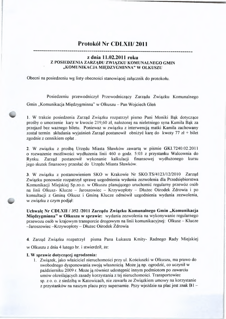 Protokół Nr CDLXII/ 2011 z dnia 11.02.2011 roku z POSIEDZENIA ZARZĄDU ZWIĄZKU KOMUNALNEGO GMIN „KOMUNIKACJA MIĘDZYGMINNA” W OLKUSZU Obecni na posiedzeniu wg listy obecności stanowiącej załącznik do protokołu. Posiedzeniu przewodniczył Przewodniczący Zarządu Związku Komunalnego Gmin „Komunikacja Międzygminna” w Olkuszu - Pan Wojciech Gleń 1. W trakcie posiedzenia Zarząd Związku rozpatrzył pismo Pani Moniki Bąk dotyczące prośby o umorzenie kary w kwocie 219,60 zł, nałożonej na nieletniego syna Kamila Bąk za przejazd bez ważnego biletu. Ponieważ w związku z interwencją matki Kamila zachowany został termin składania wyjaśnień Zarząd postanowił obniżyć karę do kwoty 77 zł + bilet zgodnie z cennikiem opłat. 2. W związku z prośbą Urzędu Miasta Sławków zawartą w piśmie GKI.7240.02.2011 o rozważenie możliwości wydłużenia linii 460 o godz. 5:03 z przystanku Walcownia do Rynku. Zarząd postanowił wykonanie kalkulacji finansowej wydłużonego kursu jego skutek finansowy przesłać do Urzędu Miasta Sławków. 3. W związku z postanowieniem SKO w Krakowie Nr SKO.TS/4123/12/2010 Zarząd Związku ponownie rozpatrzył sprawę uzgodnienia wydania zezwolenia dla Przedsiębiorstwa Komunikacji Miejskiej Sp.zo.o. w Olkuszu planującego uruchomić regularny przewóz osób na linii Olkusz- Klucze - Jaroszowiec - Krzywopłoty - Dłużec Ośrodek Zdrowia i po konsultacji z Gminą Olkusz i Gminą Klucze odmówił uzgodnienia wydania zezwolenia, w związku z czym podjął: Uchwałę Nr CDLXII / 352 /2011 Zarządu Związku Komunalnego Gmin „Komunikacja Międzygminna” w Olkuszu w sprawie: wydania zezwolenia na wykonywanie regularnego przewozu osób w krajowym transporcie drogowym na linii komunikacyjnej: Olkusz - Klucze -Jaroszowiec -Krzywopłoty - Dłużec Ośrodek Zdrowia 4. Zarząd Związku rozpatrzył pisma Pana Łukasza Kmity- RadnegoRady Miejskiej w Olkuszu z dnia 4 lutego br. i stwierdził, że: L W sprawie dotyczącej ogrodzenia: 1. Związek, jako właściciel nieruchomości przy ul. Kościuszki w Olkuszu, ma prawo do swobodnego dysponowania swoją własnością. Może ją np. ogrodzić, co uczynił w październiku 2009 r. Może ją również udostępnić innym podmiotom po zawarciu umów określających zasady korzystania z tej nieruchomości. Transportowiec sp. z o. o. z siedzibą w Katowicach, nie zawarła ze Związkiem umowy na korzystanie z przystanków na naszym placu przy supersamie. Przy wjeździe na plac jest znak BI - 2. 3. 4. 5. II. 1. 2. 3. zakaz wjazdu, a zatem wjazd na ten plac przez kierowców Transportowca jest równoznaczny ze złamaniem prawa o ruchu drogowym. W Sądzie Rejonowym w Olkuszu toczy się jeszcze kilkanaście postępowań przeciwko kierowcom Transportowca o czyn z art. 98 kw oraz jedno postępowanie w sprawie spowodowania kolizji na placu. Do czasu rozpoznania spraw przez Sad, Zarząd Związku nie usunie ogrodzenia placu, ani też nie zawrze umowy z Transportowcem. Zgodnie z sugestią Sądu, że: cyt. .Jeśli ZKG KM uważa, iż taka decyzja była błędna i naruszała jego prawo własności mógł w odpowiednim czasie i trybie tę decyzję zaskarżyć''. Zarząd Związku wystąpił do SKO w Krakowie, za pośrednictwem Burmistrza Olkusza, z wnioskiem o stwierdzenie, że decyzja Burmistrza Olkusza w sprawie wydania zezwolenia nr 0000093 dla firmy Transportowiec nastąpiła z rażącym naruszeniem prawa i uchylenie tej decyzji. Zarząd Związku wystąpi na gruncie prawa cywilnego z pozwem przeciwko firmie Transportowiec o odszkodowanie za bezumowne korzystanie z własności Związku. Związek wystąpił do Inspekcji Transportu Drogowego w Krakowie o określenie co wg ITD należy rozumieć pod pojęciem „komunikacja miejska”, zgodnie z obowiązującym prawem tj. ustawą o transporcie drogowym. W sprawie linii 450s: Związek kontroluje realizację przewozów na wszystkich swoich liniach z wykorzystaniem również wizyjnego monitoringu na placu przy supersamie. W przypadku stwierdzenia nieprawidłowości operatorzy ponoszą kary umowne. Z wideo rejestracji przystanku przy ul. Kościuszki wynika, że zatoka przystankowa jest systematycznie blokowana przez busy wykonujące przewozy dla firmy Transportowiec. Na tym posiedzenie zakończono Protokołowała Przewodniczący Zarządu Związku ZAf^Z^DUZ^^KC> m gr inż, Wojciech Gleń