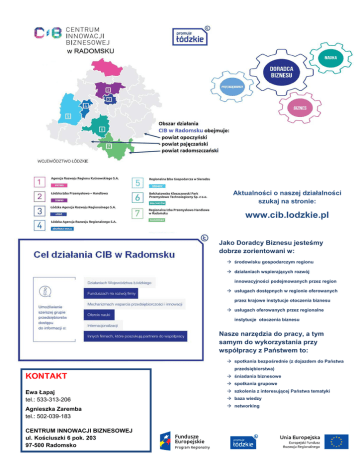 Aktualności o naszej działalności szukaj na stronie: www.cib.lodzkie.pl Jako Doradcy Biznesu jesteśmy dobrze zorientowani w: środowisku gospodarczym regionu działaniach wspierających rozwój innowacyjności podejmowanych przez region usługach dostępnych w regionie oferowanych przez krajowe instytucje otoczenia biznesu usługach oferowanych przez regionalne instytucje otoczenia biznesu Nasze narzędzia do pracy, a tym samym do wykorzystania przy współpracy z Państwem to: spotkania bezpośrednie (z dojazdem do Państwa przedsiębiorstwa) KONTAKT śniadania biznesowe spotkania grupowe Ewa Łapaj tel.: 533-313-206 Agnieszka Zaremba tel.: 502-039-183 CENTRUM INNOWACJI BIZNESOWEJ ul. Kościuszki 6 pok. 203 97-500 Radomsko szkolenia z interesującej Państwa tematyki baza wiedzy networking