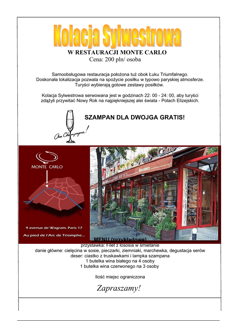 W RESTAURACJI MONTE CARLO Cena: 200 pln/ osoba Samoobsługowa restauracja położona tuż obok Łuku Triumfalnego. Doskonała lokalizacja pozwala na spożycie posiłku w typowo paryskiej atmosferze. Turyści wybierają gotowe zestawy posiłków. Kolacja Sylwestrowa serwowana jest w godzinach 22: 00 - 24: 00, aby turyści zdążyli przywitać Nowy Rok na najpiękniejszej alei świata - Polach Elizejskich. SZAMPAN DLA DWOJGA GRATIS! MENU (przykładowe) przystawka: Filet z łososia w śmietanie danie główne: cielęcina w sosie, pieczarki, ziemniaki, marchewka, degustacja serów deser: ciastko z truskawkami i lampka szampana 1 butelka wina białego na 4 osoby 1 butelka wina czerwonego na 3 osoby Ilość miejsc ograniczona Zapraszamy!