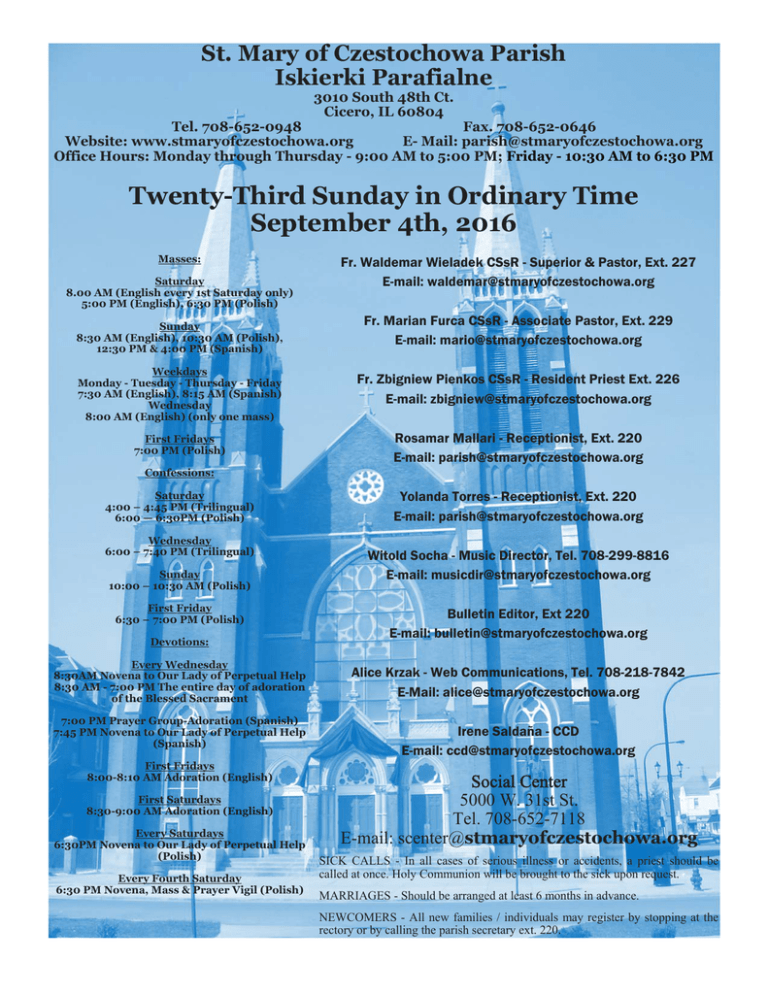 St. Mary of Czestochowa Parish Iskierki Parafialne 3010 South 48th Ct. Cicero, IL 60804 Tel. 708-652-0948 Fax. 708-652-0646 Website: www.stmaryofczestochowa.org E- Mail: [email protected] Office Hours: Monday through Thursday - 9:00 AM to 5:00 PM; Friday - 10:30 AM to 6:30 PM Twenty-Third Sunday in Ordinary Time September 4th, 2016 Masses: Saturday 8.00 AM (English every 1st Saturday only) 5:00 PM (English), 6:30 PM (Polish) Sunday 8:30 AM (English), 10:30 AM (Polish), 12:30 PM & 4:00 PM (Spanish) Fr. Waldemar Wieladek CSsR - Superior & Pastor, Ext. 227 E-mail: [email protected] Fr. Marian Furca CSsR - Associate Pastor, Ext. 229 E-mail: [email protected] Weekdays Monday - Tuesday - Thursday - Friday 7:30 AM (English), 8:15 AM (Spanish) Wednesday 8:00 AM (English) (only one mass) Fr. Zbigniew Pienkos CSsR - Resident Priest Ext. 226 E-mail: [email protected] First Fridays 7:00 PM (Polish) Rosamar Mallari - Receptionist, Ext. 220 E-mail: [email protected] Confessions: Saturday 4:00 – 4:45 PM (Trilingual) 6:00 — 6:30PM (Polish) Wednesday 6:00 – 7:40 PM (Trilingual) Sunday 10:00 – 10:30 AM (Polish) First Friday 6:30 – 7:00 PM (Polish) Devotions: Every Wednesday 8:30AM Novena to Our Lady of Perpetual Help 8:30 AM - 7:00 PM The entire day of adoration of the Blessed Sacrament 7:00 PM Prayer Group-Adoration (Spanish) 7:45 PM Novena to Our Lady of Perpetual Help (Spanish) First Fridays 8:00-8:10 AM Adoration (English) First Saturdays 8:30-9:00 AM Adoration (English) Every Saturdays 6:30PM Novena to Our Lady of Perpetual Help (Polish) Every Fourth Saturday 6:30 PM Novena, Mass & Prayer Vigil (Polish) Yolanda Torres - Receptionist, Ext. 220 E-mail: [email protected] Witold Socha - Music Director, Tel. 708-299-8816 E-mail: [email protected] Bulletin Editor, Ext 220 E-mail: [email protected] Alice Krzak - Web Communications, Tel. 708-218-7842 E-Mail: [email protected] Irene Saldaña - CCD E-mail: [email protected] Social Center 5000 W. 31st St. Tel. 708-652-7118 E-mail: [email protected] SICK CALLS - In all cases of serious illness or accidents, a priest should be called at once. Holy Communion will be brought to the sick upon request. MARRIAGES - Should be arranged at least 6 months in advance. NEWCOMERS - All new families / individuals may register by stopping at the rectory or by calling the parish secretary ext. 220. Sunday Iskierki Parafialne 7:45 Novena a Nuestra Sra. del Perpetuo Socorro September 8, Thursday, The nativity of the blessed Virgin Mary September 4, Twenty-second Sunday in Ordinary Time 8:30 †Eleanor Warchol 10:30 12:30 4:00 †Keneth Kuruab (Harriet) O zdrowie, Boże błogosławieństwo dla Haliny i Stanisława Urnbaniak z całą rodziną, właścicieli „Montrose Deli” w podziękowaniu za wsparcie festiwalu parafialnego. O zdrowie i Boże bł. oraz opiekę Matki Bożej Częstochowskiej dla Rozalii Gutierrez O zdrowie i Boże bł. oraz opiekę Matki Bożej dla Elizabeth Szymankowskiej (Od mamy) O Boże bł., zdrowie oraz opiekę Matki Bożej Częstochowskiej dla Edwarda Kogut z okazji urodzin (Marszałkowie) O zdrowie i potrzebne dary Ducha św. Przez wstawiennictwo św. Jana Pawła II i Matki Bożej dla Justyny †Ks. Stanisław Staniszewski i rodzice Kamila i Tadeusz (Maria) †Maria Sadelska (Mąż i Dzieci) †Kazimierz Grabala w 5-tą rocz. śm. oraz śp. Tadeusz Malinowski w 6-tą rocz. Śmierci (Córka i dzieci) †Aniela Gancarczyk w 2 –ą rocz. Śm.(Od męża z synami) †Edward i Roman Ptak †Franciszek Banachowski—Senior—w 33-ą rocz. Śmierci (Od syna z rodziną) †Maria Chowaniec (Od wnuka z Rodziną) Por los feligreses Presentación de 3 anos de la niña Roselyn Aguirre Velázquez (Padrinos Nereida Aguirre y Gregorio Reyes & Papas Rosalinda Velázquez y Santos Aguirre) †Rosalina Rodriguez, eterno descanso (Hija) September 5, Monday, Weekday in Ordinary Time (Labor Day) 9:AM †Sam Marcollini (T. Zaworski) September 6, Tuesday, Weekday in Ordinary Time 7:30 8:15 In Thanksgiving to our lord & the lady of the Miracle Medal, and aunt Por los feligreses September 7, Wednesday, Weekday in Ordinary Time 8:00 Parishioners 8:30 Eucharistic Adoration until 7PM 7:PM Circulo de Oración 7:30 ††Holy Souls in the Book of Remembrance 8:15 †Por las almas inscritas en le libro de las memorias 7:00 PM Msza św. W j. polskim z racji Narodzenia N.M.P September 9. Friday, USA: Saint Peter Claver, Priest 7:30 8:15 Parishioners Por los feligreses September 10, Saturday, Weekday in Ordinary Time 11:00 1:00 3:00 Wedding: Andrzej Skiba & Agnieszka Baraniak Quinceanera: Estefania Alvarez Wedding: Carlos Tovar & Claudia Potrillo Lector Schedule Saturday, September 10 5:00 Marie Jarding, Gladis Trigueros 6:30 Maria Rozanska, Adriana Ratulowski Sunday, September 11 8:30 Barbara Kulaga, Jean Yunker 10:30 Kasia Kowalska, Franek Banachowski 12:30 Marisol Ortiz, Juan Rodríguez, Juana Salas 4:00 Enrique García, Lourdes González, Humberto Téllez Eucharistic Minister Saturday, September 10 5:00 Joanne Napoletano, Larry Napoletano 6:30 Krzysztof Odbierzychleb Sunday, September 11 8:30 Georgia Czarnecki, Michele Cison-Carlson, Maria Carmen Castaneda 10:30 Krzysztof Odbierzychleb, Jan Różański, Waldemar Lipka 12:30 Noema Arellano, Teresa Zavala, Erasmo Zavala, Alejandra Báez 4:00 Tiburcio Rodríguez, María Rodríguez, María Clara Ibarra There is a promise of marriage between III. Andrzej Skiba & Agnieszka Baranak III. Carlos Tovar & Claudia Potrillo II. Jacek Turza & Alicja Poczatek II. Fabian Monroy & Lorena Vera II. Walberto Galarza Jr. & Nicole Marie Chlada I. Jakub Stanek & Beata Anna Chramiec I.Robert Tarka & Maria Findura St. Mary of Czestochowa Sunday Collection, August 28, 2016 We want to remind our parishioners and friends, that all Mass intentions for 7:30 a.m. and 8:15 a.m. Masses, must be requested at the rectory at least two weeks in advance. Mass intentions won’t be taken at the sacristy anymore for these Masses. Donate flowers for Sunday services W