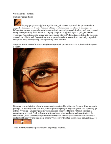 Gładka skóra - median Napisany przez: barat Zwykły pstrykacz zdjęć nie myśli o tym, jak takowe wykonać. Po prostu naciska migawkę i zaczyna się loteria. Podczas takiego totolotka może się zdarzyć, że zdjęcie na którym taki amator wspaniałomyślnie nas umieści może zbyt wyraźnie ukazywać wady naszej skóry. Jest sposób by temu zaradzić. Zwykły pstrykacz zdjęć nie myśli o tym, jak takowe wykonać. Po prostu naciska migawkę i zaczyna się loteria. Podczas takiego totolotka może się zdarzyć, że zdjęcie na którym taki amator wspaniałomyślnie nas umieści może zbyt wyraźnie ukazywać wady naszej skóry. Jest sposób by temu zaradzić. Najpierw trzeba nam ofiary naszych photoshopowych przekształceń. Ja wybrałem jedną panią z sxc.hu. Pierwszą czynnością jest zlokalizowanie miejsc na tyle kłopotliwych, że same filtry nic tu nie pomogą. W tym wypadku jest to wykwit w prawym górnym rogu fotografii. Nie będziemy go jednak wyciskać - użyjemy poczciwego narzędzia o nazwie Stempel / Stamp. Trzymając przyciśnięty przycisk ALT wybieramy miejsce które chcemy skopiować (pamiętajmy, że klawiszami [ oraz ] możemy odpowiednio zmniejszać lub zwiększać obszar zaznaczenia) a następnie klikamy w miejsce które chcemy "wyleczyć" (już bez wciśniętego przycisku ALT). Teraz możemy zabrać się za właściwą część tego tutoriala. Przechodzimy do zaznaczenia twarzy. Każda technika będzie dobra, ja wybrałem Szybką Maskę / Quick Mask i ją właśnie opiszę. Teraz wybieramy pędzel, dobieramy rozmiar który nam odpowiada. Miękkość pędzla ustawiamy wedle uznania (wygodniej maluje się miękkimi). "Zamalowujemy" twarz (pomijając oczy, usta i inne rzeczy nie będące skórą). Nie musi być to wykonane z chirurgiczna precyzją, ale wypada się trochę przyłożyć. Gdy już twarz będzie zupełnie czerwona wychodzimy z trybu Quick Mask (czy to przyciskiem, czy po prostu wciskając Q na klawiaturze) Utworzy nam się zaznaczenie. Teraz wciskamy Zaznacz > Odwrotność / Select > Inverse [SHIFT+CTRL+I] by je odwrócić (ponieważ obecnie zaznaczone jest wszystko oprócz twarzy). Kolej na skopiowanie warstwy. Wybieramy warstwę z naszą modelką i wciskamy CTRL+J (lub Layer > Duplicate Layer). Posiadamy teraz dwie warstwy. Pierwszą - główną (zapewne nazwaną Background), oraz drugą - na której znajduje się tylko skóra z twarzy (takie nowoczesne skalpowanie :) ) Tryb Mieszania / Blending Mode nowej warstwy przestawiamy na Jasność / Luminosity. Na razie nic się nie dzieje. Teraz czas na sztuczkę. Wybieramy Filtr > Szum > Mediana / Filter > Noise > Median i ustawiamy wartość w zależności od potrzeb (zazwyczaj wartości od 2 do 5 sprawdzają się bardzo dobrze). Ja wybrałem 5. Czasem trzeba też zmniejszyć parametr Krycie/Opacity (przezroczystość warstwy) by nie była ona taka plastikowa. U mnie został on zredukowany do 75%. Takim oto sposobem pozbywamy się porów na skórze, a mimo tego nie wyglądamy jak manekiny z wystaw sklepowych.