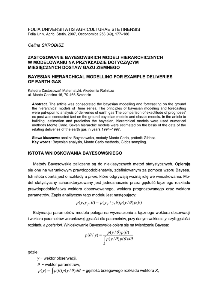 FOLIA UNIVERSITATIS AGRICULTURAE STETINENSIS Folia Univ. Agric. Stetin. 2007, Oeconomica 258 (49), 177–186 Celina SKROBISZ ZASTOSOWANIE BAYESOWSKICH MODELI HIERARCHICZNYCH W MODELOWANIU NA PRZYKŁADZIE DOTYCZĄCYM MIESIĘCZNYCH DOSTAW GAZU ZIEMNEGO BAYESIAN HIERARCHICAL MODELLING FOR EXAMPLE DELIVERIES OF EARTH GAS Katedra Zastosowań Matematyki, Akademia Rolnicza ul. Monte Cassino 16, 70-466 Szczecin Abstract. The article was consecrated the bayesian modelling and forecasting on the ground the hierarchical models of time series. The principles of bayesian modeling and forecasting were put-upon to analysis of deliveries of earth gas The comparison of exactitude of prognoses' ex post was conducted fast on the ground bayesian models and classic models. In the article to building, estimation and prediction the bayesian, hierarchical models were used numerical methods Monte Carlo. Seven hierarchic models were estimated on the basis of the data of the relating deliveries of the earth gas in years 1994–1997. Słowa kluczowe: analiza Bayesowska, metody Monte Carlo, próbnik Gibbsa. Key words: Bayesian analysis, Monte Carlo methods, Gibbs sampling. ISTOTA WNIOSKOWANIA BAYESOWSKIEGO Metody Bayesowskie zaliczane są do nieklasycznych metod statystycznych. Opierają się one na warunkowym prawdopodobieństwie, zdefiniowanym za pomocą wzoru Bayesa. Ich istota oparta jest o rozkłady a priori, które odgrywają ważną rolę we wnioskowaniu. Model statystyczny scharakteryzowany jest jednoznacznie przez gęstość łącznego rozkładu prawdopodobieństwa wektora obserwowanego, wektora prognozowanego oraz wektora parametrów. Zapis analityczny tego modelu jest następujący: p ( y, y f , θ ) = p ( y f / y, θ ) p ( y / θ ) p (θ ) Estymacja parametrów modelu polega na wyznaczeniu z łącznego wektora obserwacji i wektora parametrów warunkowej gęstości dla parametrów, przy danym wektorze y, czyli gęstości rozkładu a posteriori. Wnioskowanie Bayesowskie opiera się na twierdzeniu Bayesa: p (θ / y ) = p ( y / θ ) p (θ ) ∫ p( y / θ ) p(θ )dθ θ gdzie: y − wektor obserwacji, θ − wektor parametrów, p ( y ) = ∫ p (θ ) p ( y / θ )dθ − gęstość brzegowego rozkładu wektora X, C. Skrobisz 178 p(θ) – wstępna (niezależna od obserwacji) wiedza badacza o parametrze θ, wyrażona za pomocą rozkładu a priori o gęstości p(θ), p(y/θ) – funkcja wiarygodności określająca stopień przekonania, dotyczący przyjmowanych przez badane zjawisko wartości względem hipotetycznych wartości parametru θ, p(θ/y) – wiedza badacza o parametrze θ oparta na całej dostępnej informacji (z próby i wiedzy wstępnej), wyrażona przez gęstość rozkładu a posteriori. Predykcja jest wyznaczeniem z łącznej gęstości p ( y, y f , θ ) gęstości rozkładu warunkowego dla wektora prognozowanego, przy zaobserwowanym wektorze y. Jest to tzw. gęstość rozkładu predyktywnego: p( y f / y) = p( y, y f ) p( y ) ∫ p( y, y f ,θ )dθ = ∫ p( y f / y,θ ) Θ = p( y ) Θ p ( y, θ ) dθ = ∫ p ( y f / y,θ ) p (θ / y )dθ p( y) Θ Uzyskany rozkład a posteriori p (θ / y ) i rozkład predyktywny p ( y f , y ) reprezentuje całą dostępną wiedzę o szacowanych wielkościach parametrów θ i wektorze y f w następstwie wektora y. W stosowaniu metod Bayesowskich podstawowymi problemami, z którymi należy się uporać, są problemy natury numerycznej. Wyznaczenie podstawowych charakterystyk rozkładów a posteriori i predyktywnego wymaga obliczenia całek wielokrotnych. Oznacza to, że w przypadku wielowymiarowych przestrzeni parametrów i zmiennych ukrytych, które są przedmiotem wnioskowania, praktycznie jedynymi dostępnymi metodami obliczeniowymi są symulacyjne metody Monte Carlo. W procesie symulacyjnym wykorzystywane są różne algorytmy, np. Gibbsa, algorytm Metropolisa i Hastingsa czy algorytm eliminacji. ANALIZA BAYESOWSKA HIERARCHICZNYCH MODELI SZEREGU CZASOWEGO Ogólne zapisy analityczne − zarówno modeli klasycznych hierarchicznego, jak i Bayesowskich − są takie same. Różnice i to o zasadniczym charakterze odnoszą się do sposobów estymacji, weryfikacji i budowy prognoz. Postać modelu hierarchicznego dwustopniowego można zapisać następująco: m p1 m p2 s =1 r =1 Ysrt = α 1t + α 0 + ∑ b0 s Qst + ∑ b0 sr Qsrt + U srt , ∑b s 0s = ∑ b0 sr = 0 (1) r Model 3-stopniowy wyraża się wzorem: m p1 m p2 m p3 s =1 r =1 l Ysrlt = α 1t + α 0 + ∑ b0 s Q st + ∑ b0 sr Q srt + U 2 t + + ∑ b0 srl + Qsrlt + U srlt przy warunkach: m p1 ∑b s =1 0s = m p2 ∑b r =1 0 sr = m p3 ∑b l =1 0 srl =0 (2) 179 Zastosowanie Bayesowskich modeli hierarchicznych... Zapisy analityczne modeli oraz ich zestawienie dla danych miesięcznych (m=12) podajemy za Zawadzkim (2003). W modelach (1), (2) zmienne Qkt , Qsrt oraz Qsrlt są zmiennymi zerojedynkowymi, przyjmującymi wartości równe 1 dla poszczególnych podokresów, wynoszących odpowied- m m m , oraz , gdzie p1 , p 2 , p3 są podzielnikami odpowiadającymi kolejnym stopp1 p 2 p3 nio niom hierarchii. Z kolei liczba szacowanych parametrów w modelach hierarchicznych jest równa sumie podzielników pomniejszonych o liczbę stopni hierarchii. W przypadku modelu dwuczynnikowego: L2 = ( p1 − 1) + ( p 2 − 1) = p1 + p 2 − 2 Natomiast w modelu trzyczynnikowym wyraża się wzorem: L3 = ( p1 − 1) + ( p 2 − 1) + ( p3 − 1) = p1 + p 2 + p3 − 3 Zestawienie modeli hierarchicznych przedstawiono w tab. 1. Tabela. 1. Specyfikacja regularnych modeli hierarchicznych dla danych miesięcznych Czynnik pierwszy Model Czynnik drugi Czynnik trzeci Liczba szacowanych parametrów rodzaj zmienności macierz M12 miesiąc w roku IN H26 półrocze w roku PR miesiąc w półroczu MP 6 H34 kwartał w roku K miesiąc w kwartale MK 5 H43 okres 4 miesięcy w roku CZ miesiąc w okresie czteromiesięcznym MCZ 5 H62 okres 2 miesięcy w roku D miesiąc w okresie dwóch miesięcy MD 6 H232 półrocze w roku PR 2 miesiące w półroczu PD H223 pó