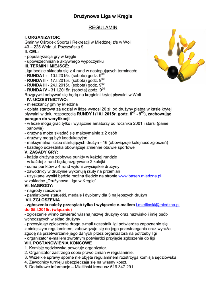 Drużynowa Liga w Kręgle REGULAMIN I. ORGANIZATOR: Gminny Ośrodek Sportu i Rekreacji w Miedźnej z/s w Woli 43 – 225 Wola ul. Pszczyńska 9, II. CEL: - popularyzacja gry w kręgle - upowszechnianie aktywnego wypoczynku III. TERMIN I MIEJSCE: Liga będzie składała się z 4 rund w następujących terminach: - RUNDA I - 10.I.2015r. (sobota) godz. 900 - RUNDA II - 17.I.2015r. (sobota) godz. 900 - RUNDA III - 24.I.2015r. (sobota) godz. 900 - RUNDA IV - 31.I.2015r. (sobota) godz. 900 Rozgrywki odbywać się będą na kręgielni krytej pływalni w Woli IV. UCZESTNICTWO: - mieszkańcy gminy Miedźna - opłata startowa za udział w lidze wynosi 20 zł. od drużyny płatna w kasie krytej pływalni w dniu rozpoczęcia RUNDY I (10.I.2015r. godz. 845 - 900), zachowując paragon do weryfikacji - w lidze mogą grać tylko i wyłącznie amatorzy od rocznika 2001 i starsi (panie i panowie) - drużyna może składać się maksymalnie z 2 osób - drużyny mogą być koedukacyjne - maksymalna liczba startujących drużyn - 16 (obowiązuje kolejność zgłoszeń) - każdego uczestnika obowiązuje zmienne obuwie sportowe V. ZASADY GRY: - każda drużyna zdobywa punkty w każdej rundzie - w każdej z rund będą rozgrywane 2 kolejki - suma punktów z 4 rund wyłoni zwycięskie drużyny - zawodnicy w drużynie wykonują rzuty na przemian - uzyskane wyniki będzie można śledzić na stronie www.basen.miedzna.pl w zakładce „Drużynowa Liga w Kręgle” VI. NAGRODY: - nagrody rzeczowe - pamiątkowe statuetki, medale i dyplomy dla 3 najlepszych drużyn VII. ZGŁOSZENIA - zgłoszenia należy przesyłać tylko i wyłącznie e-mailem [email protected] do 05.I.2015r. (włącznie) - zgłoszenie winno zawierać własną nazwę drużyny oraz nazwisko i imię osób wchodzących w skład drużyny - przesyłając zgłoszenie drogą e-mail uczestnik ligi potwierdza zapoznanie się z niniejszym regulaminem, zobowiązuje się do jego przestrzegania oraz wyraża zgodę na przetwarzanie jego danych przez organizatora na potrzeby ligi - organizator e-mailem zwrotnym potwierdzi przyjęcie zgłoszenia do ligi VIII. POSTANOWIENIA KOŃCOWE 1. Komisję sędziowską powołuje organizator. 2. Organizator zastrzega sobie prawo zmian w regulaminie. 3. Wszelkie sprawy sporne nie objęte regulaminem rozstrzyga komisja sędziowska. 4. Zawodnicy turnieju ubezpieczają się na własny koszt. 5. Dodatkowe informacje – Mietliński Ireneusz 519 347 291