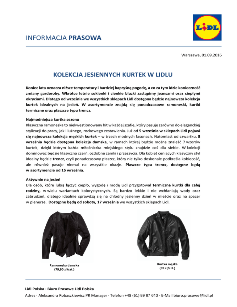 INFORMACJA PRASOWA Warszawa, 01.09.2016 KOLEKCJA JESIENNYCH KURTEK W LIDLU Koniec lata oznacza niższe temperatury i bardziej kapryśną pogodę, a co za tym idzie konieczność zmiany garderoby. Wkrótce letnie sukienki i cienkie bluzki zastąpimy jeansami oraz ciepłymi okryciami. Dlatego od września we wszystkich sklepach Lidl dostępna będzie najnowsza kolekcja kurtek idealnych na jesień. W asortymencie znajdą się ponadczasowe ramoneski, kurtki termiczne oraz płaszcze typu trencz. Najmodniejsza kurtka sezonu Klasyczna ramoneska to niekwestionowany hit w każdej szafie, który pasuje zarówno do eleganckiej stylizacji do pracy, jak i luźnego, rockowego zestawienia. Już od 5 września w sklepach Lidl pojawi się najnowsza kolekcja męskich kurtek – w trzech modnych fasonach. Natomiast od czwartku, 8 września będzie dostępna kolekcja damska, w ramach której będzie można znaleźć 7 wzorów kurtek, dzięki którym każda miłośniczka miejskiego stylu znajdzie coś dla siebie. W kolekcji dominować będzie klasyczna czerń, ozdobne zamki i przeszycia. Dla kobiet ceniących klasyczny styl idealny będzie trencz, czyli ponadczasowy płaszcz, który nie tylko doskonale podkreśla kobiecość, ale również pasuje niemal na wszystkie okazje. Płaszcze typu trencz, dostępne będą w asortymencie od 15 września. Aktywnie na jesień Dla osób, które lubią łączyć ciepło, wygodę i modę Lidl przygotował termiczne kurtki dla całej rodziny, w wielu wariantach kolorystycznych. Są bardzo lekkie i nie wchłaniają wody oraz zabrudzeń, dlatego idealnie sprawdzą się na chłodny jesienny dzień w mieście oraz na spacer w plenerze. Dostępne będą od soboty, 17 września we wszystkich sklepach Lidl. Ramoneska damska (79,90 zł/szt.) Kurtka męska (89 zł/szt.) Lidl Polska · Biuro Prasowe Lidl Polska Adres · Aleksandra Robaszkiewicz PR Manager · Telefon +48 (61) 89 67 613 · E-Mail [email protected] INFORMACJA PRASOWA Ramoneska damska (79,90 zł/szt.) Ramoneska damska (79,90 zł/szt.) Trencz (79,90 zł/szt.) Trencz (79,90 zł/szt.) Kurtka termiczna damska (79 zł/szt.) Kurtka termiczna męska (79 zł/szt.) Lidl Polska · Biuro Prasowe Lidl Polska Adres · Aleksandra Robaszkiewicz PR Manager · Telefon +48 (61) 89 67 613 · E-Mail [email protected] INFORMACJA PRASOWA Informacje o firmie: Lidl Polska należy do międzynarodowej grupy przedsiębiorstw Lidl, w której skład wchodzą niezależne spółki prowadzące aktywną działalność na terenie całej Europy. Historia sieci Lidl sięga lat 30. XX wieku, a pierwsze sieci pod szyldem tej marki powstały w Niemczech w latach 70. XX wieku. Obecnie w wielu krajach Europy istnieje około 10.000 sklepów tej marki, a w Polsce ponad 550. Dalsze informacje znajdą Państwo na naszych stronach: www.lidl.pl Facebook https://www.facebook.com/lidlpolska Instagram https://www.instagram.com/lidlpolska/ YouTube https://www.youtube.com/user/LidlPolskaPL Lidl Polska · Biuro Prasowe Lidl Polska Adres · Aleksandra Robaszkiewicz PR Manager · Telefon +48 (61) 89 67 613 · E-Mail [email protected]
