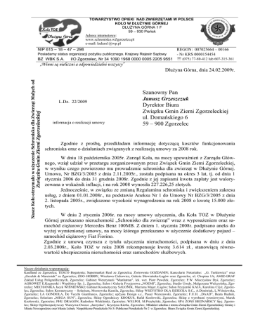 TOWARZYSTWO OPIEKI NAD ZWIERZĘTAMI W POLSCE KOŁO W DŁUśYNIE GÓRNEJ DŁUśYNA GÓRNA 1 F 59 – 930 Pieńsk Adresy internetowe: www.schronisko.wZgorzelcu.pl e-mail: [email protected] NIP 615 – 18 – 47 – 298 REGON: 007025664 – 00166 - Nr KRS 0000154454 I/O Zgorzelec, Nr 34 1090 1968 0000 0005 2205 9551 ℡ (075) 77-80-412 lub 607-315-361 Posiadamy status organizacji poŜytku publicznego. Krajowy Rejestr Sądowy BZ WBK S.A. „Winni są nieliczni a odpowiedzialni wszyscy” L.Dz. 22/2009 Związku Gmin Ziemi Zgorzeleckiej Nasze Koło otrzymało w użyczenie Schronisko dla Zwierząt Małych od DłuŜyna Górna, dnia 24.02.2009r. informacja o realizacji umowy Szanowny Pan Janusz Grzeszczuk Dyrektor Biura Związku Gmin Ziemi Zgorzeleckiej ul. Domańskiego 6 59 – 900 Zgorzelec Zgodnie z prośbą, przedkładam informację dotyczącą kosztów funkcjonowania schroniska oraz o działaniach związanych z realizacją umowy za 2008 rok. W dniu 18 października 2005r. Zarząd Koła, na mocy upowaŜnień z Zarządu Głównego, wziął udział w przetargu zorganizowanym przez Związek Gmin Ziemi Zgorzeleckiej, w wyniku czego powierzono mu prowadzenie schroniska dla zwierząt w DłuŜynie Górnej. Umowa, Nr BZG/3/2005 z dnia 2.11.2005r., została podpisana na okres 3 lat, tj. od dnia 1 stycznia 2006 do dnia 31 grudnia 2008r. Zgodnie z jej zapisami kwota zapłaty jest waloryzowana o wskaźnik inflacji, i na rok 2008 wynosiła 227.226,25 złotych. Jednocześnie, w związku ze zmianą Regulaminu schroniska i zwiększeniem zakresu usług, z dniem 01.01.2008r., na podstawie Aneksu Nr 1 do Umowy Nr BZG/3/2005 z dnia 2. listopada 2005r., zwiększono wysokość wynagrodzenia na rok 2008 o kwotę 15.000 złotych. W dniu 2 stycznia 2006r. na mocy umowy uŜyczenia, dla Koła TOZ w DłuŜynie Górnej przekazano nieruchomość „Schronisko dla zwierząt” wraz z wyposaŜeniem oraz samochód cięŜarowy Mercedes Benz 100MB. Z dniem 1. stycznia 2008r. podpisano aneks do wyŜej wymienionej umowy, na mocy którego przekazano w uŜyczenie dodatkowy pojazd – samochód cięŜarowy Fiat Fiorino. Zgodnie z umową czynszu z tytułu uŜyczenia nieruchomości, podpisana w dniu z dnia 2.03.2008r., Koło TOZ w roku 2008 rekompensuje kwotę 3.614 zł., stanowiącą równowartość ubezpieczenia nieruchomości oraz samochodów słuŜbowych. Nasze działania wspomagają: Kaufland ze Zgorzelca; TESCO Bogatynia; Supermarket Real ze Zgorzelca; świrownia GOZDANIN; Kancelarie Notarialne: „G. Turkiewicz” oraz „Grzelak & Marciniak” ze Zgorzelca; ZOO–HOBBY, Wiesława Cichowicz, Galeria Słowiańska-Łagów oraz Zgorzelec, ul. Chopina 1A; AMIZ-GRAF Zakład Usług Poligrafdicznych, Zgorzelec; Gabinet Weterynarii "Manhattan", lek. wet. Piotr Pawełek, Zgorzelec; P.W. Mieczysław Dyś, Zgorzelec; AGROWET E.Kacperski i Wspólnicy Sp. J., Zgorzelec; Salon i Galeria Fryzjerstwa „NOEMI”, Zgorzelec; Studio Urody, Małgorzata Wulczyńska, Zgorzelec; MECHANIKA Jacek WIŚNIEWSKI; Gabinet Kosmetyczny SALONIK, Marzena Majer, Łagów; Salon Fryzjerski KAJA, Karolina CzyŜ, Zgorzelec; Zgorzelec; Salon Kosmetyczny – Solarium, Mostowska Kamila, Zgorzelec; Sklep WSZYSTKO DLA DZIECKA S.C., A.Dimitriuk, L.Wiśniewska, Zgorzelec; LA GONDOLA, De Vecchi Gianfranco, Zgorzelec; up2you Design s.c., PasaŜ Warszawski, Zgorzelec; F.U.H. „DAAD”, Beata Rudnik, Zgorzelec; Solarium „MEGA SUN”, Zgorzelec; Sklep Ogrodniczy KROKUS, Rafał Kozłowski, Zgorzelec; Sklep z wyrobami tytoniowymi, Marek Kozłowski, Zgorzelec; PHU DRAGON, Radosław Wlekliński, Zgorzelec; WELPOL M.Przybylski, Zgorzelec; SPA ZONE BEDNARSCY Sp.j. Zgorzelec; Sklep OgólnospoŜywczy Warzywa-Owoce „Jarzynka”, Krystyna Kietla, Zgorzelec; MłodzieŜ szkolna z terenu Związku Gmin Ziemi Zgorzeleckiej. Gminy i Miasta Nowogrodziec oraz Miasta Lubań; Niepubliczne Przedszkole Nr 3 i Publiczne Przedszkole Nr 2 w Zgorzelcu; Biuro Związku Gmin Ziemi Zgorzeleckiej. 2 Powierzony w uŜyczenie samochód słuŜbowy marki Mercedes 100 MB jest pojazdem bardzo mocno wyeksploatowanym. Przegląd techniczny przeszedł warunkowo. NaleŜy zastanowić się nad dalszym losem tego pojazdu. W związku z powyŜszym, sugerujemy, Ŝe samochód w kaŜdej chwili moŜe doznać awarii, której naprawa moŜe przekraczać jego wartość. Brak samochodu praktycznie pozbawi Koło TOZ wywiązywania się z umowy. Działalność schroniska oparta jest o obowiązujący „Regulamin funkcjonowania Schroniska dla Zwierząt Małych w DłuŜynie Górnej”, wprowadzony Uchwałą Nr 4/06 Za-rządu Związku Gmin Ziemi Zgorzeleckiej z dnia 20.03.2006r. oraz Uchwałą Nr 2/2008 Za-rządu Związku Gmin Ziemi Zgorzeleckiej z dnia 21.01.2008r Na dzień 30.06.2008r. w schronisku zatrudnionych było 7 osób (w tym 2 osoby - pracownicy obsługi, zatrudnione zgodnie z podpisaną ze ZG ZZ umową w trybie art.231 Kodeksu Pracy): a) kierownik schroniska, b) księgowa, c) 5 pracowników obsługi. W pierwszym półroczu z pracy w schronisku zrezygnowały 3 osoby, jako powód podając, małe zarobki i duŜe koszty dojazdu do pracy. W związku z tym, wystąpiły problemy z obsadą stanowisk robotniczych i planowaniem dyŜurów zgodnie z przepisami Kodeksu Pracy. Dlatego utrzymywano zatrudnienie jednej osoby na podstawie umowy zlecenia. W celu zapewnienia właściwej obsługi weterynaryjnej w schronisku, Koło TOZ ma podpisaną umowę z lecznicą dla zwierząt. Dzięki temu, zabezpieczenie weterynaryjne schroniska jest na dobrym poziomie. Na mocy podpisanej umowy ze ZG ZZ schronisko obsługuje 10 gmin, w tym: Miasta Zawidów i Zgorzelec, Miasta i Gminy Bogatynia, Nowogrodziec, Pieńsk, Węgliniec, Gminy Platerówka, Siekierczyn, Sulików, Zgorzelec. Schronisko świadczy usługi w okresie letnim (marzec październik) w godz. 8.00-22.00, a w okresie zimowym (listopad-luty) w godz. 8.00-20.00, co jest zgodne z podpisaną umową. W okresie nocy schronisko zabezpieczone jest wolno puszczonymi psami. W czasie funkcjonowania sch