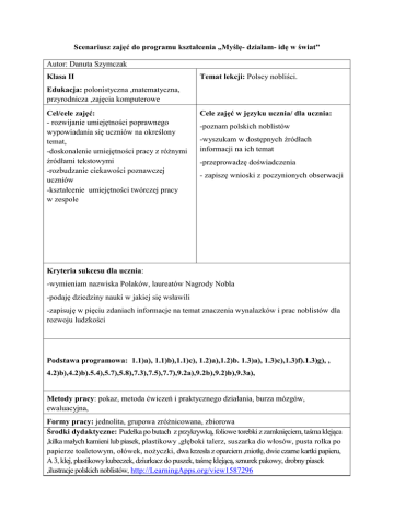 Scenariusz zajęć do programu kształcenia „Myślę- działam- idę w świat” Autor: Danuta Szymczak Klasa II Temat lekcji: Polscy nobliści. Edukacja: polonistyczna ,matematyczna, przyrodnicza ,zajęcia komputerowe Cel/cele zajęć: - rozwijanie umiejętności poprawnego wypowiadania się uczniów na określony temat, -doskonalenie umiejętności pracy z różnymi źródłami tekstowymi -rozbudzanie ciekawości poznawczej uczniów -kształcenie umiejętności twórczej pracy w zespole Cele zajęć w języku ucznia/ dla ucznia: -poznam polskich noblistów -wyszukam w dostępnych źródłach informacji na ich temat -przeprowadzę doświadczenia - zapiszę wnioski z poczynionych obserwacji Kryteria sukcesu dla ucznia: -wymieniam nazwiska Polaków, laureatów Nagrody Nobla -podaję dziedziny nauki w jakiej się wsławili -zapisuję w pięciu zdaniach informacje na temat znaczenia wynalazków i prac noblistów dla rozwoju ludzkości Podstawa programowa: 1.1)a), 1.1)b),1.1)c), 1.2)a),1.2)b. 1.3)a), 1.3)c),1.3)f).1.3)g), , 4.2)b),4.2)b).5.4),5.7),5.8),7.3),7.5),7.7),9.2a),9.2b),9.2)b),9.3a), Metody pracy: pokaz, metoda ćwiczeń i praktycznego działania, burza mózgów, ewaluacyjna, Formy pracy: jednolita, grupowa zróżnicowana, zbiorowa Środki dydaktyczne: Pudełka po butach z przykrywką, foliowe torebki z zamknięciem, taśma klejąca ,kilka małych kamieni lub piasek, plastikowy ,głęboki talerz, suszarka do włosów, pusta rolka po papierze toaletowym, ołówek, nożyczki, dwa krzesła z oparciem ,miotłę, dwie czarne kartki papieru, A 3, klej, plastikowy kubeczek, dziurkacz do puszek, taśmę klejącą, sznurek pakowy, drobny piasek ,ilustracje polskich noblistów, http://LearningApps.org/view1587296 Przebieg zajęć „Drogowskazy” -wskazówki i uwagi o realizacji 1..Zabawa na dobry początek. Jak wyglądałby świat bez…… Uczniowie siedzą w kręgu, nauczyciel podaje temat do wypowiedzi uczniów. Może on dotyczyć jednej kwestii lub kilku. Jeśli dotyczy jednej wówczas uczniowie podają do niej, jak najwięcej skojarzeń, np.: - jak wyglądałby świat bez wody? - jak wyglądałby świat bez ognia? - jak wyglądałby świat bez drzew? - jak wyglądałby świat bez ptaków? Uczniowie mogą również zadawać swoje pytania1. Centra Aktywnej Edukacji polonistycznokomunikacyjne 2. Podanie celów zajęć, określenie kryterium sukcesu uczniów. 3. Nauczyciel dzieli uczniów na grupy . Każda grupa przeprowadza doświadczenie matematycznoprzyrodnicze w swojej stacji badawczej (dostosowanie stopni trudności zadań) I grupa :Magiczna skrzynia 2 Do przeprowadzenia doświadczenia potrzebne są następujące przedmioty: Pudełka po butach z przykrywką, foliowe torebki z zamknięciem, taśma klejąca ,kilka małych kamieni lub piasek. Uczniowie odczytują instrukcję wykonania doświadczenia, podejmują działanie badawcze, formułują wnioski z poczynionych obserwacji. Załącznik 1 II grupa :Poduszkowiec Do przeprowadzenia doświadczenia potrzebne są: plastikowy ,głęboki talerz, suszarka do włosów, pusta rolka po papierze toaletowym, ołówek, nożyczki. Uczniowie odczytują instrukcję wykonania doświadczenia, podejmują działanie badawcze, formułują wnioski z poczynionych obserwacji. Załącznik 1 1 polonistycznokomunikacyjne polonistycznokomunikacyjne Zabawa opracowana na podstawie książki J. Stasica „Rozwijanie fantazji ,zainteresowań i zdolności uczniów ”Oficyna Wydawnicza „Impuls”, Kraków 2001 2 Przy opracowaniu doświadczeń wykorzystano materiał zawarty w książce M. Ruter „ 111 nowych niezwykłych eksperymentów” Wydawnictwo Jedność Kielce 2009 III grupa : Obrazy z piasku Przeprowadzając doświadczenie uczniowie wykorzystują :dwa krzesła z oparciem ,miotłę, dwie czarne kartki papieru, A 3, klej, plastikowy kubeczek, dziurkacz do puszek, taśmę klejącą, sznurek pakowy, drobny piasek. Uczniowie tak jak w poprzednich grupach odczytują polecenia i wykonują działanie badawcze, formułują wnioski. Załącznik 1 Za pomocą metodników sygnalizują etap wykonania doświadczeń. Po skończonej pracy następuje prezentacja wyników. Każda grupa podaje argumenty świadczące o tym, że warto eksperymentować. 4.Nauczyciel prezentuje zadanie w programie: http://LearningApps.org/view1587296 Uczniowie wykreślają nazwiska noblistów(praca przy tablicy interaktywnej) i odczytują je głośno na forum klasy. 5.Uczniowie podzieleni na sześć grup przygotowują prezentacje na temat noblistów. Każda grupa wykorzystuje przyniesione na zajęcia materiały (bilet wstępu). . Wykorzystują również zasoby Internetu do stworzenia prezentacji. W pracach uczniowie uwzględniają następujące zagadnienia. Imię i nazwisko noblisty Charakterystyka postaci zaprezentowana w 3 zdaniach Podanie dziedziny z jakiej otrzymała dana osoba nagrodę Data otrzymania nagrody Za jakie osiągnięcia (wynalazek, odkrycie, dzieło naukowe, działalność) Jakie ma to znaczenie dla ludzkości Wykonane zadania grupy prezentują pozostałym uczniom, którzy dokonują oceny prac. W ocenie uwzględniamy ustalone wcześniej kryteria. 6.Uczniowie pracują metodą „Burzy mózgów”, zapisują na kartkach cechy charakteryzujące ludzi ,którzy otrzymują Nagrodę Nobla. Nauczyciel poleca, aby podali jak najwięcej synonimów. Przypomina znaczenie określenia synonim, Załącznik 2 Uzupełnione karteczki odczytują i szeregują promyczkowo, zgodnie z powtarzającymi się określeniami. Uczniowie zastanawiają się, czy sami posiadają takie cechy. komputerowe komputerowe polonistycznokomunikacyjne polonistyczno komunikacyjne 7.Praca w programie LearningApps komputerowe http://LearningApps.org/view1586258 8.Na podstawie zdobytych na zajęciach wiadomości uczniowie uzupełniają informator o polskich noblistach –praca indywidualna Załącznik 3 9. Podsumowanie zajęć Uczniowie pracują w parach podają informacje na temat noblistów w formie PRAWDA/FAŁSZ Np. Alfred