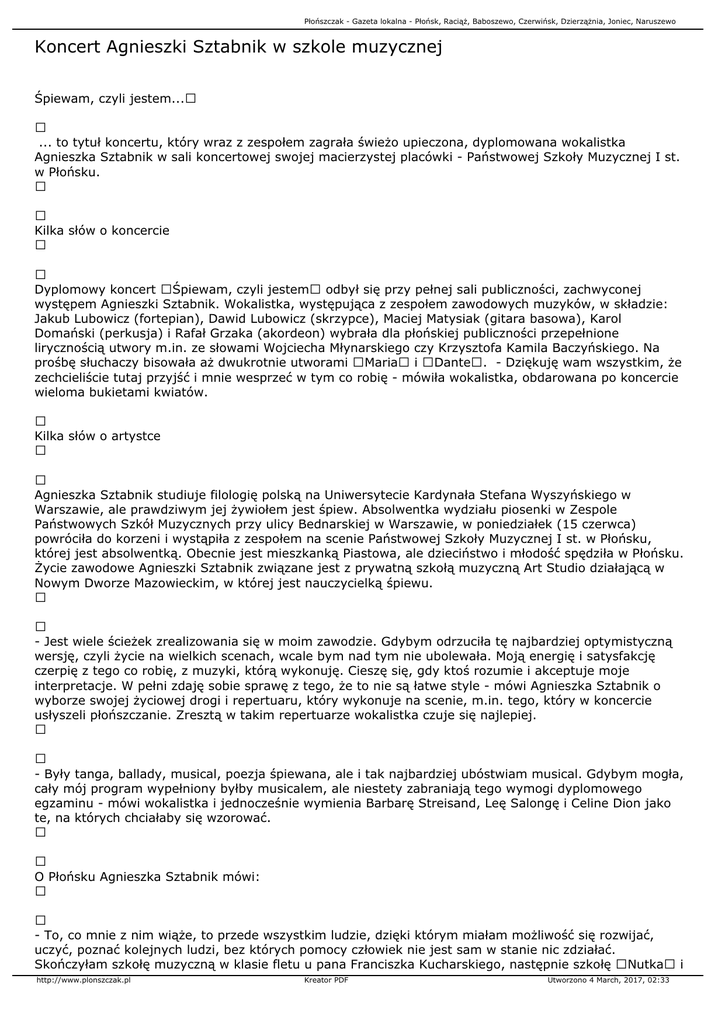 Płońszczak - Gazeta lokalna - Płońsk, Raciąż, Baboszewo, Czerwińsk, Dzierzążnia, Joniec, Naruszewo Koncert Agnieszki Sztabnik w szkole muzycznej Śpiewam, czyli jestem... ... to tytuł koncertu, który wraz z zespołem zagrała świeżo upieczona, dyplomowana wokalistka Agnieszka Sztabnik w sali koncertowej swojej macierzystej placówki - Państwowej Szkoły Muzycznej I st. w Płońsku. Kilka słów o koncercie Dyplomowy koncert Śpiewam, czyli jestem odbył się przy pełnej sali publiczności, zachwyconej występem Agnieszki Sztabnik. Wokalistka, występująca z zespołem zawodowych muzyków, w składzie: Jakub Lubowicz (fortepian), Dawid Lubowicz (skrzypce), Maciej Matysiak (gitara basowa), Karol Domański (perkusja) i Rafał Grzaka (akordeon) wybrała dla płońskiej publiczności przepełnione lirycznością utwory m.in. ze słowami Wojciecha Młynarskiego czy Krzysztofa Kamila Baczyńskiego. Na prośbę słuchaczy bisowała aż dwukrotnie utworami Maria i Dante. - Dziękuję wam wszystkim, że zechcieliście tutaj przyjść i mnie wesprzeć w tym co robię - mówiła wokalistka, obdarowana po koncercie wieloma bukietami kwiatów. Kilka słów o artystce Agnieszka Sztabnik studiuje filologię polską na Uniwersytecie Kardynała Stefana Wyszyńskiego w Warszawie, ale prawdziwym jej żywiołem jest śpiew. Absolwentka wydziału piosenki w Zespole Państwowych Szkół Muzycznych przy ulicy Bednarskiej w Warszawie, w poniedziałek (15 czerwca) powróciła do korzeni i wystąpiła z zespołem na scenie Państwowej Szkoły Muzycznej I st. w Płońsku, której jest absolwentką. Obecnie jest mieszkanką Piastowa, ale dzieciństwo i młodość spędziła w Płońsku. Życie zawodowe Agnieszki Sztabnik związane jest z prywatną szkołą muzyczną Art Studio działającą w Nowym Dworze Mazowieckim, w której jest nauczycielką śpiewu. - Jest wiele ścieżek zrealizowania się w moim zawodzie. Gdybym odrzuciła tę najbardziej optymistyczną wersję, czyli życie na wielkich scenach, wcale bym nad tym nie ubolewała. Moją energię i satysfakcję czerpię z tego co robię, z muzyki, którą wykonuję. Cieszę się, gdy ktoś rozumie i akceptuje moje interpretacje. W pełni zdaję sobie sprawę z tego, że to nie są łatwe style - mówi Agnieszka Sztabnik o wyborze swojej życiowej drogi i repertuaru, który wykonuje na scenie, m.in. tego, który w koncercie usłyszeli płońszczanie. Zresztą w takim repertuarze wokalistka czuje się najlepiej. - Były tanga, ballady, musical, poezja śpiewana, ale i tak najbardziej ubóstwiam musical. Gdybym mogła, cały mój program wypełniony byłby musicalem, ale niestety zabraniają tego wymogi dyplomowego egzaminu - mówi wokalistka i jednocześnie wymienia Barbarę Streisand, Leę Salongę i Celine Dion jako te, na których chciałaby się wzorować. O Płońsku Agnieszka Sztabnik mówi: - To, co mnie z nim wiąże, to przede wszystkim ludzie, dzięki którym miałam możliwość się rozwijać, uczyć, poznać kolejnych ludzi, bez których pomocy człowiek nie jest sam w stanie nic zdziałać. Skończyłam szkołę muzyczną w klasie fletu u pana Franciszka Kucharskiego, następnie szkołę Nutka i http://www.plonszczak.pl Kreator PDF Utworzono 4 March, 2017, 02:33 Płońszczak - Gazeta lokalna - Płońsk, Raciąż, Baboszewo, Czerwińsk, Dzierzążnia, Joniec, Naruszewo dzięki Marzenie Kunickiej i jej wierze zdecydowałam się zdawać na Bednarską (i iść w wielki świat). Każdego to czekało po maturze ale ja nie miałam wybranych żadnych innych studiów oprócz Bednarskiej. Przez chwilę, z perspektywy czasu myślałam, że nie było to dobre, ale z chwilą kiedy zobaczyłam wyniki egzaminu dyplomowego uwierzyłam, że teraz to mogę iść na każde studia. Anna Piórkowska foto: Anna Piórkowska http://www.plonszczak.pl Kreator PDF Utworzono 4 March, 2017, 02:33