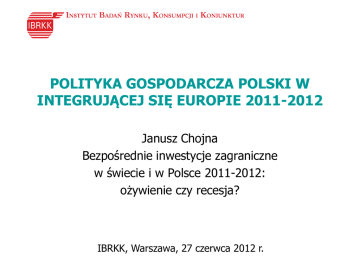 POLITYKA GOSPODARCZA POLSKI W INTEGRUJĄCEJ SIĘ EUROPIE 2011-2012 Janusz Chojna Bezpośrednie inwestycje zagraniczne w świecie i w Polsce 2011-2012: ożywienie czy recesja? IBRKK, Warszawa, 27 czerwca 2012 r. W 2011 r. napływ BIZ (w USD) zwiększył się o: 17% w świecie 58% w Polsce Czy można mówić o sukcesie? Instytut Badań Rynku, Konsumpcji i Koniunktur Program prezentacji • Napływ BIZ w świecie i w Polsce w 2011 r. oraz prognozy na 2012 r. • Uwarunkowania napływu BIZ do Polski i polityka wobec inwestorów zagranicznych Instytut Badań Rynku, Konsumpcji i Koniunktur Napływ BIZ w latach 2000-2011 w mld USD: świat, kraje rozwinięte (KR), kraje rozwijające się (KSR) 2000 1800 1600 1400 1200 1000 800 600 400 200 0 2000 2001 2002 2003 2004 2005 2006 2007 2008 2009 2010 2011 świat 1393 824 651 558 711 916 1461 1969 1744 1180 1290 1509 KR 1121 589 460 359 396 542 973 1307 965 603 636 753 246 209 162 175 276 334 434 662 779 577 654 756 KSR Źródło: UNCTAD Instytut Badań Rynku, Konsumpcji i Koniunktur Uwarunkowania światowego napływu BIZ w latach 2011-2012 2011 wzrost o: 10% (OECD), 17% (UNCTAD) 2012 prognozowany wzrost o 6% (UNCTAD) wynikający głównie ze: ale w przeciwnym kierunku mogą działać: • • • statystycznego efektu przeniesienia zwiększenia wartości M&As (o 50%) przy spadku inwestycji greenfield (o 3%) • • czynniki makroekonomiczne (spowolnienie wzrostu gospodarki światowej, kryzys strefy euro, niepokój na rynkach finansowych) słabe wyniki IV kwartału 2011 r. i prognozy M&As w 2012 r. efekt kursowy (wzmocnienie dolara) Instytut Badań Rynku, Konsumpcji i Koniunktur Kwartalny napływ BIZ w świecie i w Polsce w latach 2008-2011 (w USD, 2005=100) 250 200 150 100 50 0 08/1 08/2 08/3 08/4 09/1 09/2 09/3 09/4 10/1 10/2 10/3 10/4 11/1 11/2 11/3 11/4 Św iat Polska Źródło: UNCTAD, NBP i obliczenia własne Instytut Badań Rynku, Konsumpcji i Koniunktur Kryzys w napływie BIZ do Polski głębszy i dłuższy niż w świecie Zmiany napływu BIZ do Polski na tle świata w latach 2007-2011 (USD, w %) Okres Świat Polska 2009/2007 -40,1 -61,5a 2011/2009 27,9 57,6b 2011/2007 -23,4 -39,4 2010/2007; b 2011/2010 Źródło: obliczenia własne na podstawie danych UNCTAD i NBP a Instytut Badań Rynku, Konsumpcji i Koniunktur Źródła wzrostu napływu BIZ do Polski w 2011 r. Napływ BIZ do Polski w latach 2010-2011 z uwzględnieniem transakcji M&As (w mln USD) Wyszczególnienie 2010 2011 zmiana w % Ogółem 9,1 14,3 57,6 M&As (wg UNCTAD) 1,0 10,1 868,3 Ogółem bez M&As 8,1 4,2 -48,1 Źródło: NBP, UNCTAD i obliczenia własne Instytut Badań Rynku, Konsumpcji i Koniunktur Napływ BIZ do Polski i jego składowe w latach 2007-2011 (w mln USD) 24 000 22 000 20 000 18 000 16 000 14 000 12 000 10 000 8 000 6 000 4 000 2 000 0 -2 000 2007 2008 2009 2010 2011 ogółem 23 651 14 978 13 022 9 104 14344 udz 7 728 9 873 5 282 3 136 809 rz 9 340 -1 116 5 011 5 851 5079 pk 6583 6221 2729 117 8456 Uwagi: udz-wnoszenie/wycofywanie udziałów, rz-reinwestowane zyski, pk-pozostały kapitał Źródło: NBP i obliczenia własne Instytut Badań Rynku, Konsumpcji i Koniunktur Uwarunkowania napływu BIZ do Polski w 2012 r. (+) • • • (-) Prognozowany wzrost światowego napływu BIZ Rosnąca atrakcyjność inwestycyjna Polski Spadek ceny gruntów i kosztu siły roboczej w następstwie osłabienia złotego • • • • • • • Niepewność w gospodarce światowej Wyczerpujące się instrumenty wsparcia Niejasna przyszłość SSE Wysoka dynamika jednostkowych kosztów pracy Wyjątkowy charakter wzrostu napływu BIZ w 2011 r. (wielkie transakcje M&As) Słabe wyniki 4 miesięcy 2012 r. Wzrost znaczenia sektorów usługowych w napływie BIZ do Polski Instytut Badań Rynku, Konsumpcji i Koniunktur Skumulowany miesięczny napływ BIZ do Polski w latach 2011-2012 (w mln USD) 15000 10000 5000 0 -5000 I I-II I-III I-IV I-V I-VI I-VII I-VIII I-IX I-X I-XI I-XII 7249 7219 6793 8134 11554 13852 14526 14189 2011 2182 3441 5227 7218 2012 -575 -5027 -3657 -3832 Źródło: obliczenia własne na podstawie danych NBP Instytut Badań Rynku, Konsumpcji i Koniunktur Przeciętna wartość prowadzonych przez PAIiIZ projektów inwestycyjnych w wiodących branżach (wg stanu na 17.01.2012, w mln EUR) 70 60 50 40 30 20 10 0 Obsługa biznesu B+R Przemysł maszynowy Źródło: obliczenia własne na podstawie danych PAIiIZ Instytut Badań Rynku, Konsumpcji i Koniunktur Przemysł motoryzacyjny Klimat inwestycyjny w Polsce w latach 2007-2011 i jego składowe 4 3,5 3 2,5 2 2007 2008 2009 2010 2011 klimat inwestycyjny czynniki makroekonomiczne czynniki regulacyjne infrastruktura Źródło: PAIiIZ i obliczenia własne Instytut Badań Rynku, Konsumpcji i Koniunktur Wyzwania na najbliższe lata • Zasadnicza poprawa warunków prowadzenia działalności gospodarczej w Polsce • Generalna strategia przyciągania bezpośrednich inwestorów zagranicznych Instytut Badań Rynku, Konsumpcji i Koniunktur Dziękuję za uwagę [email protected]