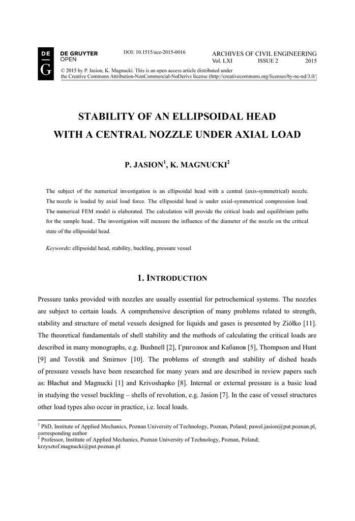 STABILITY OF AN ELLIPSOIDAL HEAD WITH A CENTRAL NOZZLE UNDER AXIAL LOAD P. JASION1, K. MAGNUCKI2 The subject of the numerical investigation is an ellipsoidal head with a central (axis-symmetrical) nozzle. The nozzle is loaded by axial load force. The ellipsoidal head is under axial-symmetrical compression load. The numerical FEM model is elaborated. The calculation will provide the critical loads and equilibrium paths for the sample head.. The investigation will measure the influence of the diameter of the nozzle on the critical state of the ellipsoidal head. Keywords: ellipsoidal head, stability, buckling, pressure vessel 1. INTRODUCTION Pressure tanks provided with nozzles are usually essential for petrochemical systems. The nozzles are subject to certain loads. A comprehensive description of many problems related to strength, stability and structure of metal vessels designed for liquids and gases is presented by Ziółko [11]. The theoretical fundamentals of shell stability and the methods of calculating the critical loads are described in many monographs, e.g. Bushnell [2], Григолюк and Кабанов [5], Thompson and Hunt [9] and Tovstik and Smirnov [10]. The problems of strength and stability of dished heads of pressure vessels have been researched for many years and are described in review papers such as: Błachut and Magnucki [1] and Krivoshapko [8]. Internal or external pressure is a basic load in studying the vessel buckling – shells of revolution, e.g. Jasion [7]. In the case of vessel structures other load types also occur in practice, i.e. local loads. 1 PhD, Institute of Applied Mechanics, Poznan University of Technology, Poznan, Poland; [email protected], corresponding author 2 Professor, Institute of Applied Mechanics, Poznan University of Technology, Poznan, Poland; [email protected] 90 P. JASION, K. MAGNUCKI Theoretical research of spherical shells buckling under such load types are presented e.g. in Fitch [4], Gupta et al. [6] and Evkin [3]. This paper is devoted to an ellipsoidal head with a central nozzle (Fig. 1). The nozzle is loaded with an axial force. Hence, the ellipsoidal head is subject to the axially symmetric load. In the linear buckling analysis the relation between the diameter of the nozzle and the buckling load and buckling shape is analyzed. The results of non-linear analysis show the post-critical behavior of the head. Fig. 1. Scheme of the ellipsoidal head with a nozzle 2. FEM MODEL OF THE ELLIPSOIDAL HEAD WITH A NOZZLE 2.1. HEAD DESCRIPTION The ellipsoidal head of the radius a, depth b and wall thickness te is supported at the edge. The head is connected with a cylindrical central nozzle of diameter c and wall thickness tk. The distance between the edge of the head and the edge of the nozzle is constant and equals d. The nozzle is loaded with lengthwise force F – tension or compression. 2.2. FEM MODEL The ellipsoidal head and the nozzle are thin-walled shells of revolution; hence they are modeled with shell 181 elements – ANSYS system (Fig. 2). STABILITY OF AN ELLIPSOIDAL HEAD WITH A CENTRAL NOZZLE UNDER AXIAL LOAD 91 Fig. 2. Scheme of the ellipsoidal head with a nozzle These elements have four nodes and six degrees of freedom in each node. The model of the head is defined in the cylindrical coordinate system. Conservative force is applied to the edge of the nozzle (total force spreads equally on all nodes). Two types of support conditions have been applied to the edge of the head. The first one is a simple support – the radial u, circumferential v and axial w displacements are blocked. In the second case the radial displacements u are allowed. An additional support has been introduced to the edge of the nozzle: only axial displacements w are allowed. The mechanical properties of the material of the head assumed in analyses correspond to steel: Young’s modulus E = 2·105 MPa, Poisson’s ratio ν = 0.3. The nozzle has been modelled in a simplified way. By its shortening and stiffening (Young’s modulus is 103 times higher than the one for the material of the head) the influence of the length and deformation of the nozzle on the buckling behavior of the head has been eliminated. Since the present considerations are limited to the elastic buckling, plastic properties of the material have not been defined. The following geometrical parameters have been assumed (see Fig 1): a = 750 mm, b = 375 mm, d = 425 mm, te = 4 mm, tk = 6 mm. The diameter of the nozzle varies in the range c = <100,500> mm. 92 P. JASION, K. MAGNUCKI 3. NUMERICAL ANALYSIS 3.1. CRITICAL LOADS – CRITICAL STATES The goal of the linear buckling analysis is to investigate the influence of the load – compression, tension – and the diameter of the nozzle on the buckling shape and buckling load of the head. The influence of different support conditions is also analyzed. Examples of buckling modes are shown in Fig. 3. In the case of compressive force the buckling is related to the indentation and rotation of the nozzle (Fig. 3a, and 3b). For the tensile force a number of short circumferential waves appear around the nozzle in the region of the highest compressive stress (Fig. 3c). Fig. 3. First buckling mode of the ellipsoidal head: under compression a), b); under tension c) The influence of the nozzle diameter on the value of the critical load of the head is shown in Fig. 4. On the horizontal axis the diameter of the nozzle c is given. The vertical axis corresponds to the dimensionless critical force which is the ratio of the critical force for a given case (Fcr) and the critical load corresponding to the case of ellipsoidal head without nozzle (c = 0 mm) (Fcrc=0). However to avoid numerical errors and to assure the axially symmetrical mesh a very small nozzle has been modelled, namely c = 10 mm. STABILITY OF AN ELLIPSOIDAL HEAD WITH A CENTRAL NOZZLE UNDER AXIAL LOAD 93 Fig. 4. Influence of a nozzle diameter on the critical load of a head In both load cases the incr