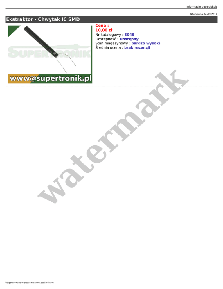 Informacje o produkcie Utworzono 04-03-2017 Ekstraktor - Chwytak IC SMD Cena : 10,00 zł w at er m ar k Nr katalogowy : S049 Dostępność : Dostępny Stan magazynowy : bardzo wysoki Średnia ocena : brak recenzji Wygenerowano w programie www.oscGold.com er m ar k Ekstraktor - Chwytak SMD w at Ekstraktor - Chwytak SMD do podzespołów SMD przy wylutowywaniu elementów (układy scalone).