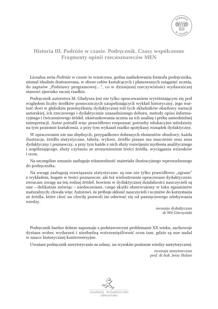 Historia III. Podró¿e w czasie. Podrêcznik. Czasy wspó³czesne Fragmenty opinii rzeczoznawców MEN Licealna seria Podró¿e w czasie to wzorcowa, godna naladowania formu³a podrêcznika, niemal idealnie dostosowana, w sferze celów kszta³c¹cych i planowanych osi¹gniêæ ucznia, do zapisów Podstawy programowej , co w dzisiejszej rzeczywistoci wydawniczej stanowi zjawisko raczej rzadkie. Podrêcznik autorstwa M. G³adysza jest nie tylko opracowaniem wyró¿niaj¹cym siê pod wzglêdem liczby rodków pomocniczych uzupe³niaj¹cych wyk³ad historyczny, jego wartoæ tkwi w g³êbokim przemyleniu dydaktycznej roli tych sk³adników obudowy narracji autorskiej, ich rzeczowego i dydaktycznie uzasadnionego doboru, metody opisu informacyjnego i æwiczeniowego róde³, ukierunkowania ucznia na ich analizê i próbê samodzielnej interpretacji. Autor potrafi³ wiêc prawid³owo rozpoznaæ potrzeby edukacyjne m³odzie¿y na tym poziomie kszta³cenia, a przy tym wykaza³ rzadko spotykany rozs¹dek dydaktyczny. W opracowaniu nie ma zbêdnych, przypadkowo dobranych elementów obudowy; ka¿da ilustracja, ród³o statystyczne, tabela, wykres, ród³o pisane ma znaczenie oraz sens dydaktyczny i poznawczy, a przy tym ka¿de z nich s³u¿y rozwijaniu mylenia analitycznego i uogólniaj¹cego, s³u¿y czytaniu ze zrozumieniem treci ród³a, wyci¹gania wniosków i ocen. Na szczególne uznanie zas³uguje ró¿norodnoæ materia³u ilustracyjnego wprowadzonego do podrêcznika. Na uwagê zas³uguj¹ rozwi¹zania statystyczne; s¹ one nie tylko prawid³owo zgrane z wyk³adem, bogate w treci poznawcze, ale te¿ wielostronnie opracowane dydaktycznie; zwracam uwagê na ten rodzaj róde³, bowiem w dydaktycznej dzia³alnoci nauczycieli s¹ one delikatnie mówi¹c niedoceniane, czego skutki obserwujemy w toku egzaminów maturalnych; chwa³a wiêc Autorowi, ¿e próbuje sk³oniæ nauczycieli i uczniów do korzystania ze ród³a, które choæ na chwilê pozwoli im oderwaæ siê od pamiêciowego zdobywania wiedzy. recenzja dydaktyczna dr Wit Górczyñski Podrêcznik bardzo dobrze zapoznaje z podstawowymi problemami XX wieku, zachowuje dystans wobec wydarzeñ i niezbêdn¹ wstrzemiêliwoæ ocen tam, gdzie s¹ one nadal w nauce historycznej kontrowersyjne. Uwa¿am podrêcznik merytorycznie za udany, na wysokim poziomie wiedzy merytorycznej. recenzja merytoryczna prof. dr hab. Jerzy Holzer Jak poprzednie z tego cyklu i ten podrêcznik jest napisany starannym jêzykiem literackim, z zachowaniem regu³ sk³adaj¹cych siê na normê wzorcow¹. Ogólnie oceniaj¹c wysoko jêzykow¹ warstwê podrêcznika, za najwiêksz¹ jej zaletê uwa¿am po³¹czenie zwiêz³oci ze swobod¹ i naturalnoci¹ toku narracji. Z mojego punktu widzenia tê w³anie zaletê mogê wskazaæ jako powód wysokiej lokacji Historii III wród innych podrêczników tego przedmiotu. recenzja jêzykowa mgr Wac³aw Wawrzyniak (...) Otrzymalimy bowiem dzie³o wydane bardzo starannie, zilustrowane ró¿norodnymi materia³ami ikonograficznymi, dobrze napisane jêzykiem komunikatywnym i odpowiednim do wieku i mo¿liwoci intelektualnych uczniów klas maturalnych, zawieraj¹ce ciekawe materia³y ród³owe i wyposa¿one w solidn¹ obudowê dydaktyczn¹. Podrêcznik prezentuje najnowszy stan badañ polskiej i wiatowej historiografii. recenzja merytoryczna prof. dr hab. Jerzy Eisler
