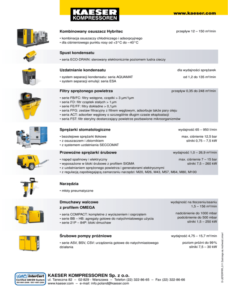 www.kaeser.com Kombinowany osuszacz Hybritec przepływ 12 – 150 m³/min • kombinacja osuszaczy chłodniczego i adsorpcyjnego • dla ciśnieniowego punktu rosy od +3°C do – 40°C Spust kondensatu • seria ECO-DRAIN: sterowany elektronicznie poziomem lustra cieczy Uzdatnianie kondensatu dla wydajności sprężarek od 1,2 do 135 m³/min • system separacji kondensatu: seria AQUAMAT • system separacji emulsji: seria ESA Filtry sprężonego powietrza przepływ 0,35 do 248 m³/min • serie FB/FC: filtry wstępne, cząstki > 3 µm/1µm • seria FD: filtr cząstek stałych > 1 µm • serie FE/FF: filtry dokładne > 0,1µm • seria FFG: zestaw filtracyjny z filtrem węglowym, adsorbuje także pary oleju • seria ACT: adsorber węglowy o szczególnie długim czasie eksploatacji • seria FST: filtr sterylny dostarczający powietrze pozbawione mikroorganizmów Sprężarki stomatologiczne • bezolejowe sprężarki tłokowe • z osuszaczem i zbiornikiem • z systemem uzdatniania SECCOMAT Przewoźne sprężarki śrubowe wydajność 65 – 950 l/min max. ciśnienie 12,5 bar silniki 0,75 – 7,5 kW wydajność 1,0 – 26,9 m³/min max. ciśnienie 7 – 15 bar • napęd spalinowy i elektryczny silniki 7,5 – 260 kW • wyposażone w bloki śrubowe z profilem SIGMA • z uzdatnianiem sprężonego powietrza i generatorami elektrycznymi • z regulacją zapobiegającą zamarzaniu narzędzi: M20, M26, M43, M57, M64, M80, M100 Narzędzia • młoty pneumatyczne • seria COMPACT: kompletne z wyciszeniem i osprzętem • serie BB – HB: agregaty gotowe do natychmiatowego użycia • serie 21P – 84P: bloki dmuchaw Śrubowe pompy próżniowe • serie ASV, BSV, CSV: urządzenia gotowe do natychmiastowego działania KAESER KOMPRESSOREN Sp. z o.o. wydajność na tłoczeniu/ssaniu 1,5 – 156 m³/min nadciśnienie do 1000 mbar podciśnienie do 500 mbar silniki 1,5 – 250 kW wydajność 4,75 – 15,7 m³/min poziom próżni do 99 % silniki 7,5 – 30 kW ul. Taneczna 82 – 02-829 - Warszawa – Telefon (22) 322-86-65 – Fax (22) 322-86-66 www.kaeser.com – e-mail: [email protected] D-LIEFERPRPL.3/11 Zastrzega się możliwość zmian! Dmuchawy walcowe z profilem OMEGA www.kaeser.com Program produkcji Sprężarki tłokowe wydajność na ssaniu 130 – 660 l/min max. ciśnienie 10 –15 bar silniki 0,75 – 3 kW sprężarki mobilne • serie CLASSIC i PREMIUM wydajność na ssaniu 150 – 1 500 l/min max. ciśnienie 10 –15 bar silniki 1,1 – 7,5 kW stacjonarne sprężarki warsztatowe • seria EUROCOMP • ze zbiornikiem stojącym lub leżącym • z obudową wyciszającą wydajność 60 – 1400 l/min max. ciśnienie 7,10 i 35 bar silniki 0,75 – 18,5 kW stacjonarne sprężarki tłokowe • klasyczna konstrukcja z napędem pasowym • wersje bezolejowe i smarowane olejem sprężarki doprężajace - booster wydajność 0,28 – 15,4 m³/min ciśnienie wej. do 13 bar, ciśnienie wyj. do 45 bar silniki 2,2 – 45 kW Sprężarki śrubowe z energooszczędnymi blokami śrubowymi z profilem SIGMA • serie SX do HSD • ze sterowaniem SIGMA CONTROL 2 • seria AIRCENTER, kompaktowa stacja sprężonego powietrza z osuszaczem chłodniczym i zbiornikiem • sprężarki śrubowe z zabudowanym osuszaczem chłodniczym • systemy odzysku ciepła • wykonania z regulacją częstotliwościową wydajność 0,26 – 86 m³/min max. ciśnienie 5,5 i 15 bar silniki 2,2 – 515 kW System zarządzania sprężonym powietrzem • SIGMA AIR MANAGER z adaptacyjną regulacją 3-D Zbiorniki sprężonego powietrza do stacji sprężonego powietrza do 16 sprężarek pojemność 90 – 10 000 l • wersje stojące i leżące Osuszacze chłodnicze ciśnieniowy punkt rosy + 3°C • serie TAH – TCH • serie TA – TF ze sterowaniem SECOTEC • serie TG – TI • serie TL – TW Osuszacze membranowe przepływ 0,35 – 3,5 m³/min przepływ 0,6 – 25 m³/min przepływ 30,8 – 90 m³/min przepływ 110 – 175 m³/min przepływ 0,35 do 4,4 m³/min ciśnieniowy punkt rosy do -40°C • seria KMM także z filtrem FE/FF Osuszacze adsorpcyjne ciśnieniowy punkt rosy do -70 °C • wykonania regenerowane na zimno i na gorąco przepływ 0,15 – 194,2 m³/min