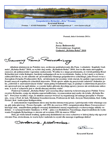 Gospodarstwo Rybackie „Róża” Promno Krzysztof Karoń Promno * 62-010 Pobiedziska * e- mail: [email protected] * www.karon-ryby.pl Poznań, dnia 6 kwietnia 2011r. Sz. Pan Jerzy Bobrowski Przewodniczący Kapituły Godności „Rybaka Roku” 2010 składam niniejszym na Pańskie ręce, serdeczne podziękowanie dla Pana i członków Kapituły Godności „Rybaka Roku” 2010, za wybór mej osoby „Rybakiem Roku” 2010. Jest to dla mnie niewątpliwy zaszczyt, ale jednocześnie i ogromne zaskoczenie. Wynika to z mego przekonania, że wśród polskiej Braci Rybackiej jest wielu Kolegów, bardziej zasługujących na to wyróżnienie. Sadzę, że być może o wyborze zadecydowało to, że nie zależnie od prowadzenia własnego gospodarstwa rybackiego, jako Prezes wraz z Zarządem Związku Producentów Ryb, od dziesięciu lat czynimy wiele starań, by godnie reprezentować i bronić naszych wspólnych rybackich interesów. Wiele spraw udało się pozytywnie załatwić! Jednakże jako „człowiek w zaawansowanym wieku” mam pełną świadomość tego, że pamięć o załatwionych pozytywnie sprawach jest na ogół ulotna a o ocenie ludzi, głównie decydują sprawy jeszcze nie uwieńczone sukcesem. A tych w rybactwie jest w chwili obecnej niestety wiele! Ponieważ Godność „Rybaka Roku” jest szczytną ideą i materią wykreowaną przez Polskie Towarzystwo Rybackie, czuję się niejako usprawiedliwiony, wyznaczeniem mej osoby do tytułu „Rybaka Roku”. Powyższe wynika z tego, że miałem zaszczyt tworzyć tę organizację od samego początku w Poznaniu , wraz z Prof. dr hab. Michałem Iwaszkiewiczem, Profesorem dr hab. Jerzym Mastyńskim, Kol. Lidią Pirtań i Kol. Andrzejem Kuligowskim. Z sentymentem wspominam okres mej bardzo intensywnej pracy i poświęcenie wiele własnego czasu, gdy jako pierwszy Prezes Zarządu - od 1991 do czerwca 1993- zorganizowałem Biuro Towarzystwa i kierując nim, umożliwiłem podjęcie owocnej działalności naszej organizacji a wykorzystując układy rodzinne - w sytuacji braków funduszy w PTR - jako z-ca Redaktora Naczelnego, doprowadziłem do wydawania Przeglądu Rybackiego w okresie od września 1991 do marca 1994r! Dziś, po wielu latach trudnej, społecznej działalności na rzecz rybactwa w której dużą rolę ogrywał również Pan, stwierdzam, że warto było i należało to czynić dla naszego wspólnego dobra! Krzysztof Karoń