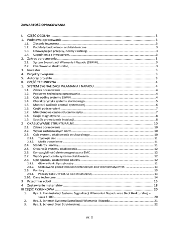 ZAWARTOŚĆ OPRACOWANIA I. CZĘŚĆ OGÓLNA .................................................................................................................... 3 1. Podstawa opracowania ....................................................................................................... 3 1.1. 1.2. 1.3. 1.4. Zlecenie Inwestora. ....................................................................................................................3 Podkłady budowlano - architektoniczne ...................................................................................3 Obowiązujące przepisy, normy i katalogi. .................................................................................3 Uzgodnienia z Inwestorem. .......................................................................................................3 2. Zakres opracowania ............................................................................................................. 3 2.1. 2.2. 3. 4. 5. II. 1. System Sygnalizacji Włamania i Napadu (SSWiN),.....................................................................3 Okablowanie strukturalne, ........................................................................................................3 Inwestor ............................................................................................................................... 3 Projekty związane ................................................................................................................ 3 Autorzy projektu .................................................................................................................. 3 CZĘŚĆ TECHNICZNA ............................................................................................................. 4 SYSTEM SYGNALIZACJI WŁAMANIA I NAPADU.................................................................... 4 1.1. 1.2. 1.3. 1.4. 1.5. 1.6. 1.7. 1.8. 1.9. 2 Zakres opracowania ...................................................................................................................4 Podstawa techniczna opracowania ...........................................................................................4 Opis ogólny systemu SSWiN ......................................................................................................4 Charakterystyka systemu alarmowego ......................................................................................5 Montaż i zasilanie centrali systemowej .....................................................................................6 Czujki podczerwieni ...................................................................................................................7 Mikrofonowa czujka stłuczenia szyby ........................................................................................7 Czujki magnetyczne ...................................................................................................................8 Sposób prowadzenia instalacji ...................................................................................................8 OKABLOWANIE STRUKTURALNE........................................................................................ 10 2.1. 2.2. 2.3. Zakres opracowania ................................................................................................................ 10 Wykaz zastosowanych norm................................................................................................... 10 Opis systemu okablowania strukturalnego ............................................................................ 10 2.3.1. 2.3.2. 2.4. 2.5. 2.6. 2.7. 2.8. Standardy i normy................................................................................................................... 11 Otwartość systemu okablowania ............................................................................................ 12 Kompatybilność elektromagnetyczna EMC ............................................................................ 12 Wybór producenta systemu okablowania .............................................................................. 12 Opis sposobu okablowania obiektu ........................................................................................ 12 2.8.1. 2.8.2. 2.9. Topologia sieci ................................................................................................................................ 11 Media transmisyjne ........................................................................................................................ 11 Główny Punkt Dystrybucyjny .......................................................................................................... 12 Okablowanie gniazd terminali telefonicznych oraz teleinformatycznych. ..................................... 13 Pomiary ................................................................................................................................... 13 2.9.1. Pomiary kabli UTP kat. 5e sieci strukturalnej ................................................................................. 13 2.10. Dane techniczne...................................................................................................................... 14 3 Przedmiar robót ................................................................................................................. 15 4 Zestawienie materiałów .................................................................................................... 18 III CZĘŚĆ RYSUNKOWA ............................................................................................................. 20 1. 2. 3. Rys. 1. Plan instalacji Systemu Sygnalizacji Włamania i Napadu oraz Sieci Strukturalnej – skala 1:100 ........................................................................................................................ 20 Rys. 2. Schemat Systemu Sygnalizacji Włamania i Napadu ...........................