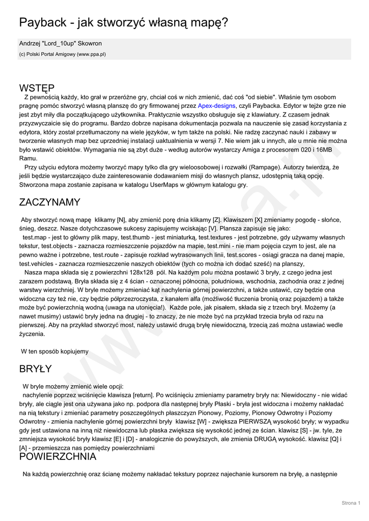 Payback - jak stworzyć własną mapę? Andrzej "Lord_10up" Skowron (c) Polski Portal Amigowy (www.ppa.pl) WSTĘP w .p pa ZACZYNAMY .p l Z pewnością każdy, kto grał w przeróżne gry, chciał coś w nich zmienić, dać coś "od siebie". Właśnie tym osobom pragnę pomóc stworzyć własną planszę do gry firmowanej przez Apex-designs, czyli Paybacka. Edytor w tejże grze nie jest zbyt miły dla początkującego użytkownika. Praktycznie wszystko obsługuje się z klawiatury. Z czasem jednak przyzwyczaicie się do programu. Bardzo dobrze napisana dokumentacja pozwala na nauczenie się zasad korzystania z edytora, który został przetłumaczony na wiele języków, w tym także na polski. Nie radzę zaczynać nauki i zabawy w tworzenie własnych map bez uprzedniej instalacji uaktualnienia w wersji 7. Nie wiem jak u innych, ale u mnie nie można było wstawić obiektów. Wymagania nie są zbyt duże - według autorów wystarczy Amiga z procesorem 020 i 16MB Ramu. Przy użyciu edytora możemy tworzyć mapy tylko dla gry wieloosobowej i rozwałki (Rampage). Autorzy twierdzą, że jeśli będzie wystarczająco duże zainteresowanie dodawaniem misji do własnych plansz, udostępnią taką opcję. Stworzona mapa zostanie zapisana w katalogu UserMaps w głównym katalogu gry. w Aby stworzyć nową mapę klikamy [N], aby zmienić porę dnia klikamy [Z]. Klawiszem [X] zmieniamy pogodę - słońce, śnieg, deszcz. Nasze dotychczasowe sukcesy zapisujemy wciskając [V]. Plansza zapisuje się jako: test.map - jest to główny plik mapy, test.thumb - jest miniaturką, test.textures - jest potrzebne, gdy używamy własnych tekstur, test.objects - zaznacza rozmieszczenie pojazdów na mapie, test.mini - nie mam pojęcia czym to jest, ale na pewno ważne i potrzebne, test.route - zapisuje rozkład wytrasowanych linii, test.scores - osiągi gracza na danej mapie, test.vehicles - zaznacza rozmieszczenie naszych obiektów (tych co można ich dodać sześć) na planszy, Nasza mapa składa się z powierzchni 128x128 pól. Na każdym polu można postawić 3 bryły, z czego jedna jest zarazem podstawą. Bryła składa się z 4 ścian - oznaczonej północna, południowa, wschodnia, zachodnia oraz z jednej warstwy wierzchniej. W bryle możemy zmieniać kąt nachylenia górnej powierzchni, a także ustawić, czy będzie ona widoczna czy też nie, czy będzie półprzezroczysta, z kanałem alfa (możliwość tłuczenia bronią oraz pojazdem) a także może być powierzchnią wodną (uwaga na utonięcia!). Każde pole, jak pisałem, składa się z trzech brył. Możemy (a nawet musimy) ustawić bryły jedna na drugiej - to znaczy, że nie może być na przykład trzecia bryła od razu na pierwszej. Aby na przykład stworzyć most, należy ustawić drugą bryłę niewidoczną, trzecią zaś można ustawiać wedle życzenia. W ten sposób kopiujemy BRYŁY w W bryle możemy zmienić wiele opcji: nachylenie poprzez wciśnięcie klawisza [return]. Po wciśnięciu zmieniamy parametry bryły na: Niewidoczny - nie widać bryły, ale ciągle jest ona używana jako np. podpora dla następnej bryły Płaski - bryła jest widoczna i możemy nakładać na nią tekstury i zmieniać parametry poszczególnych płaszczyzn Pionowy, Poziomy, Pionowy Odwrotny i Poziomy Odwrotny - zmienia nachylenie górnej powierzchni bryły klawisz [W] - zwiększa PIERWSZĄ wysokość bryły; w wypadku gdy jest ustawiona na inną niż niewidoczna lub płaska zwiększa się wysokość jednej ze ścian. klawisz [S] - jw. tyle, że zmniejsza wysokość bryły klawisz [E] i [D] - analogicznie do powyższych, ale zmienia DRUGĄ wysokość. klawisz [Q] i [A] - przemieszcza nas pomiędzy powierzchniami POWIERZCHNIA Na każdą powierzchnię oraz ścianę możemy nakładać tekstury poprzez najechanie kursorem na bryłę, a następnie Strona 1 Payback - jak stworzyć własną mapę? Andrzej "Lord_10up" Skowron (c) Polski Portal Amigowy (www.ppa.pl) wybranie ściany - 1 to góra, 2 północ itd. Następnie wciskamy [T], aby wybrać teksturę, którą sobie życzymy. Nie jest to pokaźny zbiór, ale na początek wystarcza. Klawisz [Y] zmienia typ powierzchni: wyłączona normalna z przezroczystym - kolor 0 jest niewidoczny (dobre w zastosowaniu tekstur okiennych) z kanałem alfa - przezroczystość 50% z możliwością tłuczenia z odbiciami - efekt i fizyka wody Klawisz [F] odpowiada za odwrócenie tekstury w poziomie - każda tekstura powinna być odwrócona, aby była wyświetlana poprawnie. W PRANIU w .p pa .p l Jeśli przebrnęliście przez to wszystko, to gratulacje, jeśli nie to czytajcie dalej - będzie łatwiej zrozumieć. Jak zacząć? Zaznaczamy cały górny pas mapy uważając, aby nie "zahaczyć" o koniec planszy, a następnie: wciskamy [RETURN], aby włączyć bryłę wciskamy [1], aby wybrać górną powierzchnię, [T] i mamy wybraną teksturę, [Y], aby było widać teksturę. I tak samo mając zaznaczony pas brył wciskamy [2], aby zmienić zaznaczenie na północną ścianę i jak wyżej. Powtarzamy z południem, następnie wybieramy skrajną bryłę mapy i jeśli jest to wschód, to zmieniamy ustawienie kursora i ustalamy powierzchnię. Tak samo z zachodnim blokiem. Kiedy mamy zrobioną górną ramkę mapy, możemy zaznaczyć ponownie cały górny pas, wcisnąć [C], aby skopiować to, co mamy zaznaczone, następnie jedziemy na dolny lewy róg mapy i wklejamy mur za pomocą klawisza [P]. Ważne, że gdy skopiujemy np. budynek 4x5 brył to aby wkleić go w inne miejsce, zaznaczamy jeden punkt na mapie, a po wklejeniu budynku będziemy mieli pod kursorem lewy górny róg budynku - tzw. punkt (0,0) tego co wkleiliśmy. Kończymy ramkę mapy tworząc lewy i prawy mur i mamy "szkic" tego co będzie. W każdym bądź razie postać nie zginie nam poza ekranem. Jak zbudować budynek? Zaznaczamy interesujący nas skrawek ziemi, powiedzmy 4x6 brył, wciskamy [RETURN] i tworzymy dach budynku kolejno klawiszami [1], [T], [Y]. Wiem, że to pracochłonn