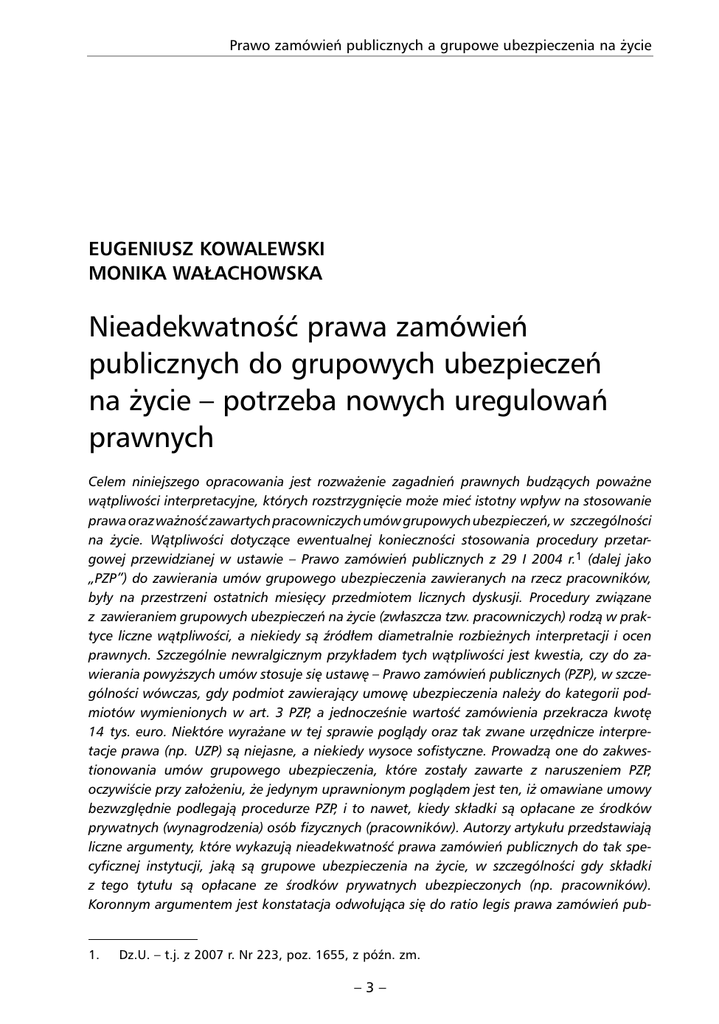 Prawo zamówień publicznych a grupowe ubezpieczenia na życie EUGENIUSZ KOWALEWSKI MONIKA WAŁACHOWSKA Nieadekwatność prawa zamówień publicznych do grupowych ubezpieczeń na życie – potrzeba nowych uregulowań prawnych Celem niniejszego opracowania jest rozważenie zagadnień prawnych budzących poważne wątpliwości interpretacyjne, których rozstrzygnięcie może mieć istotny wpływ na stosowanie prawa oraz ważność zawartych pracowniczych umów grupowych ubezpieczeń, w szczególności na życie. Wątpliwości dotyczące ewentualnej konieczności stosowania procedury przetargowej przewidzianej w ustawie – Prawo zamówień publicznych z 29 I 2004 r.1 (dalej jako „PZP”) do zawierania umów grupowego ubezpieczenia zawieranych na rzecz pracowników, były na przestrzeni ostatnich miesięcy przedmiotem licznych dyskusji. Procedury związane z zawieraniem grupowych ubezpieczeń na życie (zwłaszcza tzw. pracowniczych) rodzą w praktyce liczne wątpliwości, a niekiedy są źródłem diametralnie rozbieżnych interpretacji i ocen prawnych. Szczególnie newralgicznym przykładem tych wątpliwości jest kwestia, czy do zawierania powyższych umów stosuje się ustawę – Prawo zamówień publicznych (PZP), w szczególności wówczas, gdy podmiot zawierający umowę ubezpieczenia należy do kategorii podmiotów wymienionych w art. 3 PZP, a jednocześnie wartość zamówienia przekracza kwotę 14 tys. euro. Niektóre wyrażane w tej sprawie poglądy oraz tak zwane urzędnicze interpretacje prawa (np. UZP) są niejasne, a niekiedy wysoce sofistyczne. Prowadzą one do zakwestionowania umów grupowego ubezpieczenia, które zostały zawarte z naruszeniem PZP, oczywiście przy założeniu, że jedynym uprawnionym poglądem jest ten, iż omawiane umowy bezwzględnie podlegają procedurze PZP, i to nawet, kiedy składki są opłacane ze środków prywatnych (wynagrodzenia) osób fizycznych (pracowników). Autorzy artykułu przedstawiają liczne argumenty, które wykazują nieadekwatność prawa zamówień publicznych do tak specyficznej instytucji, jaką są grupowe ubezpieczenia na życie, w szczególności gdy składki z tego tytułu są opłacane ze środków prywatnych ubezpieczonych (np. pracowników). Koronnym argumentem jest konstatacja odwołująca się do ratio legis prawa zamówień pub- 1. Dz.U. – t.j. z 2007 r. Nr 223, poz. 1655, z późn. zm. –3– Wiadomości Ubezpieczeniowe 3/2010 licznych, iż w znaczeniu aksjologicznym prawo to nie może i nie powinno ograniczać dyspozycji środkami prywatnymi. To bowiem prowadziłoby do burzenia fundamentalnych instytucji rządzących umowami cywilnoprawnymi, w szczególności zasady swobody kontraktowej. Wątpliwości dotyczące ewentualnej konieczności stosowania procedury przetargowej przewidzianej w ustawie – Prawo zamówień publicznych z 29 I 2004 r. do zawierania umów grupowego ubezpieczenia zawieranych na rzecz pracowników, były na przestrzeni ostatnich miesięcy przedmiotem licznych dyskusji, wywołanych zwłaszcza wydaną w lutym 2009 r. opinią Urzędu Zamówień Publicznych, która kwestię tę – wydawałoby się – przesądziła ostatecznie2. Urząd uznał bowiem, iż procedura przetargowa, przewidziana przez PZP, ma zastosowanie w procesie wyboru kontrahenta i zawierania tychże umów ubezpieczeń grupowych. Niniejszy artykuł jest próbą zajęcia stanowiska co do zasadności takiego twierdzenia, zwłaszcza w świetle odpowiedzi Dyrekcji Generalnej ds. Wspólnego Rynku i Usług Komisji Europejskiej na zapytanie UZP złożone w dn. 9 XII 2009 r.3 1. Analiza PZP oraz zakres jego stosowania Nieadekwatność prawa zamówień publicznych przy zawieraniu umów ubezpieczenia grupowego na życie nie wynika z istoty samego prawa zamówień publicznych, gdyż nie ingeruje ono w system cywilnoprawny, lecz przewiduje pewien sposób postępowania przy zawieraniu umów przez wskazane w niej podmioty należące do „sektora publicznego”. Jest więc „instrumentem” przy zawieraniu pewnych umów. W zakresie uregulowanym w PZP, przepisy wyłączają stosowanie przepisów k.c. dotyczących zawarcia umowy w drodze aukcji lub przetargu (art. 701 – 721 k.c.) oraz przyrzeczenia publicznego (art. 919 – 921 k.c.), natomiast z drugiej strony zawieranie umów o zamówienia publiczne, ich wykonanie, skutki niewykonania lub nienależytego wykonania, regulowane są (poza wyjątkami z art. 99 – 101, 102 – 109, 139 – 151 PZP) przepisami kodeksu cywilnego 4. Wynika z tego, że prawo zamówień publicznych nie ma na celu ingerować w system cywilnoprawny jako taki, nie ma modyfikować, co do zasady, jego podstawowych reguł. Przewidziane w PZP szczegółowe procedury nie wyłączają chociażby zasady swobody umów przewidzianej w prawie cywilnym. Prawo zamówień publicznych przewiduje jednak pewne mechanizmy „kontroli” w sytuacji, gdy część lub 2. 3. 4. Zob. stanowisko UZP, znak UZP/DP/0-RJE/245379/3329/09 z 24 II 2009 r., dostępne na stronach www.uzp.gov.pl. Odpowiedź Dyrekcji Generalnej ds. Wspólnego Rynku i Usług Komisji Europejskiej z dn. 31 III 2010 r. (na zapytanie UZP złożone w dn. 9 XII 2009 r.), MARKT C2 LR/bmg D(2010) 171464, dostępne na stronie www.uzp.gov.pl, podstrona http://www.uzp.gov.pl/aktualnosci/komisjaeuropejska-potwierdzi142a-stanowisko-urzedu-zamowien-publicznych-w-sprawieobowiazku-stosowania-ustawy-prawo-zamowien-publicznych-przy-zawieraniu-umowgrupowego-ubezpieczenia-pracownikow/ (data odczytu: 7 VI 2010 r.). Przepisy ogólne stosowane są również m.in. do postępowania odwoławczego przed Krajową Izbą Odwoławczą (na podstawie art. 184 ust. 6 PZP stosuje się tu przepisy kodeksu postępowania cywilnego). Ponadto w toku postępowania odwoławczego (ze skargi na orzeczenie Krajowej Izby Odwoławczej) do zamówień publicznych zastosowanie mają (z wyjątkami z art. 194 – 198 PZP) także przepisy k.p.c. (art. 194 ust. 2 PZP). –4– Prawo zamówień publicznych a grupowe ubez