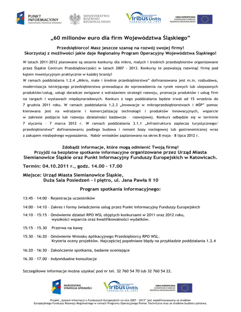 „60 milionów euro dla firm Województwa Śląskiego” Przedsiębiorco! Masz jeszcze szansę na rozwój swojej firmy! Skorzystaj z możliwości jakie daje Regionalny Program Operacyjny Województwa Śląskiego! W latach 2011-2012 planowane są ostanie konkursy dla mikro, małych i średnich przedsiębiorstw organizowane przez Śląskie Centrum Przedsiębiorczości w latach 2007 - 2013. Konkursy te pozwalają rozwinąć firmę pod kątem inwestycyjnym praktycznie w każdej branży! W ramach poddziałania 1.2.4 „Mikro, małe i średnie przedsiębiorstwa” dofinansowana jest m.in. rozbudowa, modernizacja istniejącego przedsiębiorstwa prowadząca do wprowadzenia na rynek nowych lub ulepszonych produktów/usług, usługi doradcze związane z wdrażaniem strategii rozwoju, promocja produktów i usług firm na targach i wystawach międzynarodowych. Konkurs z tego poddziałania będzie trwał od 15 września do 7 grudnia 2011 roku. W ramach poddziałania 1.2.3 „Innowacje w mikroprzedsiębiorstwach i MŚP” pomoc kierowana jest na wdrażanie i komercjalizację technologii i produktów innowacyjnych, wsparcie w zakresie podjęcia lub rozwoju działalności badawczo – rozwojowej. Konkurs odbędzie się w terminie 7 stycznia – 7 marca 2012 r. W ramach poddziałania 3.1.1 „Infrastruktura zaplecza turystycznego/ przedsiębiorstwa” dofinansowaniu podlega budowa i remont bazy noclegowej lub gastronomicznej wraz z zakupem niezbędnego wyposażenia. Nabór wniosków zaplanowano na okres 8 maja – 8 lipca 2012 r. Zdobądź informacje, które mogą odmienić Twoją firmę! Przyjdź na bezpłatne spotkanie informacyjne organizowane przez Urząd Miasta Siemianowice Śląskie oraz Punkt Informacyjny Funduszy Europejskich w Katowicach. Termin: 04.10.2011 r., godz. 14.00 – 17.00 Miejsce: Urząd Miasta Siemianowice Śląskie, Duża Sala Posiedzeń – I piętro, ul. Jana Pawła II 10 Program spotkania informacyjnego: 13:45 – 14:00 – Rejestracja uczestników 14:00 – 14:10 – Zakres i formy świadczenia usług przez Punkt Informacyjny Funduszy Europejskich 14:10 – 15:15 – Omówienie działań RPO WSL objętych konkursami w 2011 oraz 2012 roku, wysokości wsparcia oraz kwalifikowalności wydatków. 15:15 – 15.30 Przerwa na kawę 15:30 – 16:20 – Omówienie Wniosku Aplikacyjnego Przedsiębiorcy RPO WSL. Kryteria oceny projektów. Najczęściej popełniane błędy na przykładzie poddziałania 1.2.4 16:20 – 16:30 – Zakończenie spotkania, badanie oceniające 16.30 – 17.00 – Indywidualne konsultacje Szczegółowe informacje można uzyskać pod nr tel. 32 760 54 70 lub 32 760 54 22. Projekt „System Informacji o Funduszach Europejskich na lata 2007 - 2013” jest współfinansowany ze środków Europejskiego Funduszu Rozwoju Regionalnego w ramach Programu Operacyjnego Pomoc Techniczna oraz ze środków budżetu państwa.
