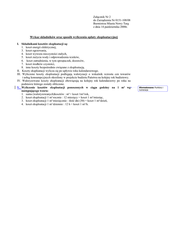 Załącznik Nr 2 do Zarządzenia Nr 0151-108/08 Burmistrza Miasta Nowy Targ z dnia 14 października 2008r. Wykaz składników oraz sposób wyliczenia opłaty eksploatacyjnej I. Składnikami kosztów eksploatacji są: 1. koszt energii elektrycznej, 3. koszt ogrzewania, 4. koszt wywozu nieczystości stałych, 5. koszt zuŜycia wody i odprowadzenia ścieków, 6. koszt zatrudnienia, w tym sprzątaczek, dozorców, 7. koszt środków czystości, 8. inne koszty bezpośrednio związane z eksploatacją. II. Koszty eksploatacji wylicza się po upływie roku kalendarzowego. III. Wyliczone koszty eksploatacji podlegają waloryzacji o wskaźnik wzrostu cen towarów i usług konsumpcyjnych określony w projekcie budŜetu Państwa na kolejny rok budŜetowy. IV. Waloryzowane koszty eksploatacji obowiązują na kolejny rok kalendarzowy po roku na podstawie którego zostały obliczone. V. Wyliczenie kosztów eksploatacji ponoszonych w ciągu godziny na 1 m² wg następującego wzoru: 1. suma (waloryzowanych)kosztów : m² = koszt 1m²/rok, 2. koszt eksploatacji 1 m² rocznie : 12 miesięcy = koszt 1 m²/miesiąc, 3. koszt eksploatacji 1 m² miesięcznie : ilość dni (30) = koszt 1 m²/dzień, 4. koszt eksploatacji 1 m² dziennie : 12 h = koszt 1 m²/h. Sformatowane: Punktory i numeracja