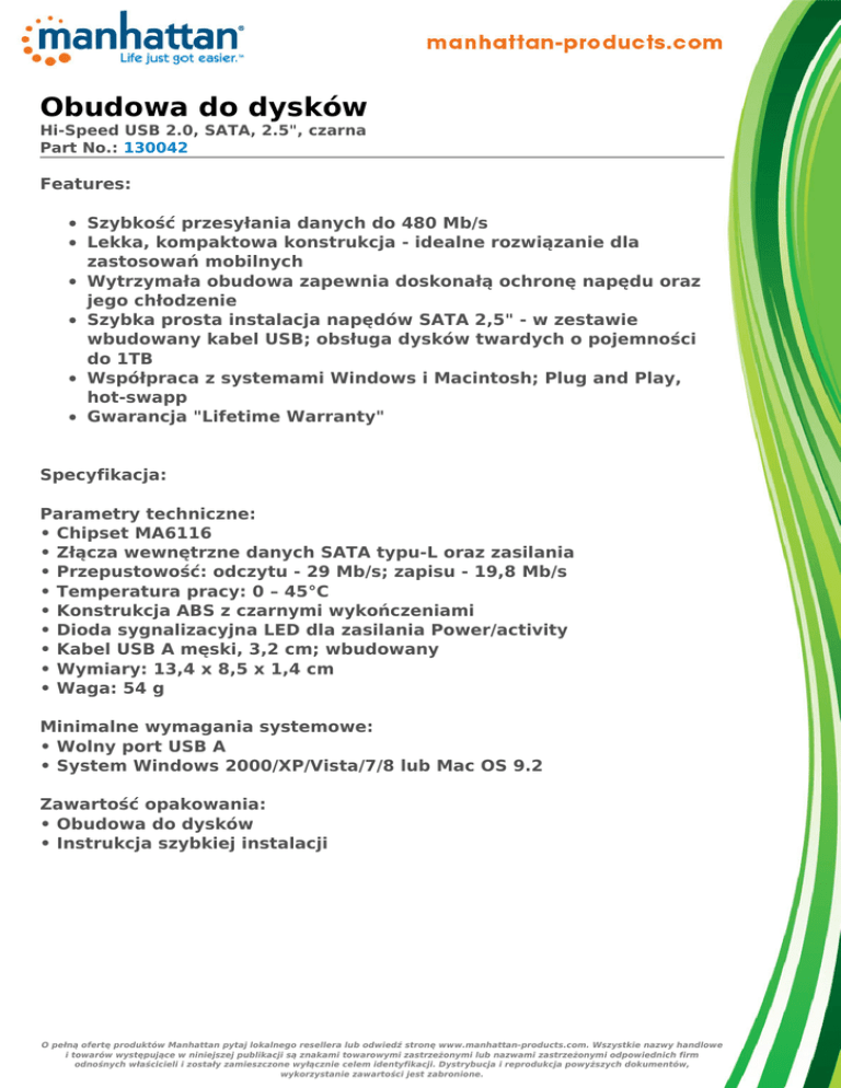 Obudowa do dysków Hi-Speed USB 2.0, SATA, 2.5", czarna Part No.: 130042 Features: Szybkość przesyłania danych do 480 Mb/s Lekka, kompaktowa konstrukcja - idealne rozwiązanie dla zastosowań mobilnych Wytrzymała obudowa zapewnia doskonałą ochronę napędu oraz jego chłodzenie Szybka prosta instalacja napędów SATA 2,5" - w zestawie wbudowany kabel USB; obsługa dysków twardych o pojemności do 1TB Współpraca z systemami Windows i Macintosh; Plug and Play, hot-swapp Gwarancja "Lifetime Warranty" Specyfikacja: Parametry techniczne: • Chipset MA6116 • Złącza wewnętrzne danych SATA typu-L oraz zasilania • Przepustowość: odczytu - 29 Mb/s; zapisu - 19,8 Mb/s • Temperatura pracy: 0 – 45°C • Konstrukcja ABS z czarnymi wykończeniami • Dioda sygnalizacyjna LED dla zasilania Power/activity • Kabel USB A męski, 3,2 cm; wbudowany • Wymiary: 13,4 x 8,5 x 1,4 cm • Waga: 54 g Minimalne wymagania systemowe: • Wolny port USB A • System Windows 2000/XP/Vista/7/8 lub Mac OS 9.2 Zawartość opakowania: • Obudowa do dysków • Instrukcja szybkiej instalacji O pełną ofertę produktów Manhattan pytaj lokalnego resellera lub odwiedź stronę www.manhattan-products.com. Wszystkie nazwy handlowe i towarów występujące w niniejszej publikacji są znakami towarowymi zastrzeżonymi lub nazwami zastrzeżonymi odpowiednich firm odnośnych właścicieli i zostały zamieszczone wyłącznie celem identyfikacji. Dystrybucja i reprodukcja powyższych dokumentów, wykorzystanie zawartości jest zabronione. O pełną ofertę produktów Manhattan pytaj lokalnego resellera lub odwiedź stronę www.manhattan-products.com. Wszystkie nazwy handlowe i towarów występujące w niniejszej publikacji są znakami towarowymi zastrzeżonymi lub nazwami zastrzeżonymi odpowiednich firm odnośnych właścicieli i zostały zamieszczone wyłącznie celem identyfikacji. Dystrybucja i reprodukcja powyższych dokumentów, wykorzystanie zawartości jest zabronione.