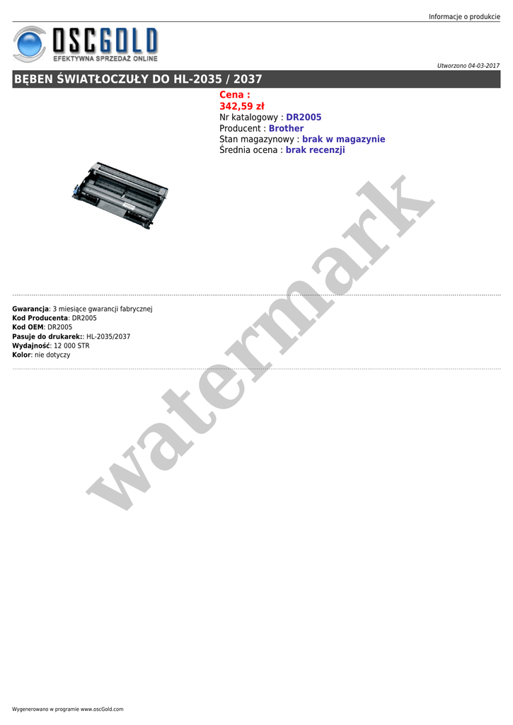 Informacje o produkcie Utworzono 04-03-2017 BĘBEN ŚWIATŁOCZUŁY DO HL-2035 / 2037 Cena : 342,59 zł er m ar k Nr katalogowy : DR2005 Producent : Brother Stan magazynowy : brak w magazynie Średnia ocena : brak recenzji w at Gwarancja: 3 miesiące gwarancji fabrycznej Kod Producenta: DR2005 Kod OEM: DR2005 Pasuje do drukarek:: HL-2035/2037 Wydajność: 12 000 STR Kolor: nie dotyczy Wygenerowano w programie www.oscGold.com