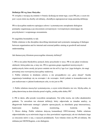 Definicja PR wg Jana Matysika W związku z toczącą się