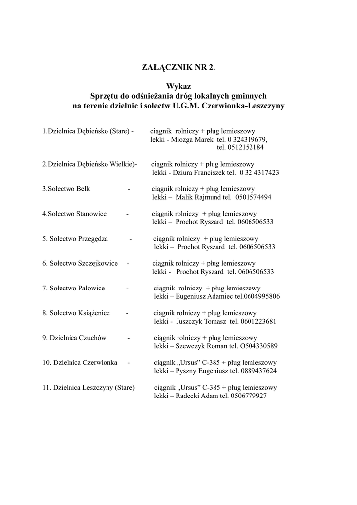 ZAŁĄCZNIK NR 2. Wykaz Sprzętu do odśnieżania dróg lokalnych gminnych na terenie dzielnic i sołectw U.G.M. Czerwionka-Leszczyny 1.Dzielnica Dębieńsko (Stare) - ciągnik rolniczy + pług lemieszowy lekki - Miozga Marek tel. 0 324319679, tel. 0512152184 2.Dzielnica Dębieńsko Wielkie)- ciągnik rolniczy + pług lemieszowy lekki - Dziura Franciszek tel. 0 32 4317423 3.Sołectwo Bełk - ciągnik rolniczy + pług lemieszowy lekki – Malik Rajmund tel. 0501574494 4.Sołectwo Stanowice - ciągnik rolniczy + pług lemieszowy lekki – Prochot Ryszard tel. 0606506533 5. Sołectwo Przegędza - ciągnik rolniczy + pług lemieszowy lekki – Prochot Ryszard tel. 0606506533 6. Sołectwo Szczejkowice - ciągnik rolniczy + pług lemieszowy lekki - Prochot Ryszard tel. 0606506533 7. Sołectwo Palowice - ciągnik rolniczy + pług lemieszowy lekki – Eugeniusz Adamiec tel.0604995806 8. Sołectwo Książenice - ciągnik rolniczy + pług lemieszowy lekki - Juszczyk Tomasz tel. 0601223681 9. Dzielnica Czuchów - ciągnik rolniczy + pług lemieszowy lekki – Szewczyk Roman tel. O504330589 10. Dzielnica Czerwionka - ciągnik „Ursus” C-385 + pług lemieszowy lekki – Pyszny Eugeniusz tel. 0889437624 11. Dzielnica Leszczyny (Stare) ciągnik „Ursus” C-385 + pług lemieszowy lekki – Radecki Adam tel. 0506779927