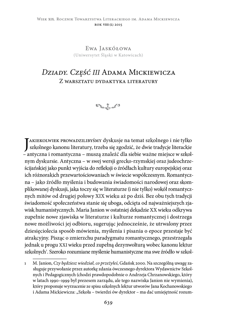 Wiek XIX . Rocznik Towarzystwa Literackiego im. Adama Mickiewicza rok VIii (L) 2015 Ewa Jaskółowa (Uniwersy tet Śląski w Katowicach) Dziady. Część III Adama Mickiewicza Z warsztatu dydaktyka literatury J akiekolwiek prowadzilibyśmy dyskusje na temat szkolnego i nie tylko szkolnego kanonu literatury, trzeba się zgodzić, że dwie tradycje literackie – antyczna i romantyczna – muszą znaleźć dla siebie ważne miejsce w szkolnym dyskursie. Antyczna – w swej wersji grecko-rzymskiej oraz judeochrześcijańskiej jako punkt wyjścia do refleksji o źródłach kultury europejskiej oraz ich różnorakich przewartościowaniach w świecie współczesnym. Romantyczna – jako źródło myślenia i budowania świadomości narodowej oraz skomplikowanej dyskusji, jaka toczy się w literaturze (i nie tylko) wokół romantycznych mitów od drugiej połowy XIX wieku aż po dziś. Bez obu tych tradycji świadomość społeczeństwa stanie się uboga, odcięta od najważniejszych zjawisk humanistycznych. Maria Janion w ostatniej dekadzie XX wieku odkrywa zupełnie nowe zjawiska w literaturze i kulturze romantycznej i dostrzega nowe możliwości jej odbioru, sugerując jednocześnie, że utrwalony przez dziesięciolecia sposób mówienia, myślenia i pisania o epoce przestaje być atrakcyjny. Pisząc o zmierzchu paradygmatu romantycznego, przestrzegała jednak u progu XXI wieku przed zupełną dezynwolturą wobec kanonu lektur szkolnych1. Szeroko rozumiane myślenie humanistyczne ma swe źródło w szkol1 M. Janion, Czy będziesz wiedział, co przeżyłeś, Gdańsk 2000. Na szczególną uwagę zasługuje przywołanie przez autorkę zdania ówczesnego dyrektora Wydawnictw Szkolnych i Pedagogicznych (chodzi prawdopodobnie o Andrzeja Chrzanowskiego, który w latach 1990–1999 był prezesem zarządu, ale tego nazwiska Janion nie wymienia), który proponuje wyrzucenie ze spisu szkolnych lektur utworów Jana Kochanowskiego i Adama Mickiewicza: „Szkoła – twierdzi ów dyrektor – ma dać umiejętność rozum- 639 • Ewa Jaskółowa • nej edukacji polonistycznej. Określana tak ze względu na nazwę przedmiotu – język polski – jest przecież edukacją ogólnokulturową, humanistyczną w najszerszym znaczeniu tego słowa, bo łączy w sobie kształcenie literackie, językowe i kulturowe, a wykorzystuje jako konteksty: historię, psychologię, socjologie, politykę. Ważność nauczania tego przedmiotu szkolnego, jego formacyjny charakter uznają wszyscy krytycy i „entuzjaści edukacji”. Spór dotyczy kwestii, w jakim stopniu zadania formacyjne są spełniane przez szkołę. Od razu chcę podkreślić, należę do „entuzjastów”, choć widzę mankamenty edukacji. Dostrzegam je jednak w człowieku, bo jest on twórcą i realizatorem systemu. Krytycy widzą problem w systemie egzaminów oraz w zapisach dokumentów ministerialnych, takich jak podstawa programowa, często także w hierarchicznej strukturze kontroli oświaty. Entuzjaści podkreślają, że najważniejsza jest organizacja procesu dydaktycznego, który zależy wyłącznie od nauczyciela. Jest on odpowiedzialny za planowanie i realizację treści nauczania w ramach oczywiście wyznaczonych przez podstawę programową, która wszakże nie jest ani nadmiernie sztywna, ani opresyjna. Jeśli coś ogranicza nauczycielskie działania to chyba tylko wyobraźnia i może w jakimś stopniu chęci oraz zainteresowania uczniów. Choć te ostatnie – warto podkreślić tę kwestię – w dużej mierze zależą także od nauczyciela i jego pasji. Nie podejmuję tu kwestii sprawozdawczości, która jest zmorą całego systemu oświaty oraz nauki i szkolnictwa wyższego. Wracając do nauczyciela – jest ogniwem w „systemie” najważniejszym. I powiedzmy sobie od razu nie jest to ogniwo, ani jednorodne, ani spójne. Znam nauczycieli świetnych, otwartych, pomysłowych z ogromnym potencjałem intelektualnym. Są w różnym wieku, praca z młodzieżą jest ich pasją i powołaniem, zapalają młodych ludzi swoim zaangażowaniem i sposobem myślenia. Spotkałam jednak i takich, którzy prezentują utrwalony od lat, negatywny sposób myślenia o własnym zawodzie. Żadne propozycje otwarcia na nowe metody postępowania z uczniami, prowadzenia niesztampowych lekcji, kreowania nowych zagadnień na lekcjach języka polskiego ich nie przekonują. Nie dostrzegają nowych sposobów czytania literatury, powtarzają od lat utarte interpretacje i każą je przyswajać uczniom. Na nowe sposoby diagnozowania umiejętności uczniów reagują gwałtownie i agresywnie. W ich przekonaniu „system” jest zły, a oni tylko na ten zły system reagują buntem, który głównie polega na tym, że odmawiają wszelkich działań, które ich zdaniem wykraczają poza „wytyczne sytemu”. A tymczasem ów złowieszczy system daje nauczynego obcowania z literaturą, a nie wiedzę historycznoliteracką, zaś jeśli młodzi ludzie czytają dziś Folleta, a nie poetów romantycznych, to może na współczesnych przykładach trzeba tę umiejętność wyrabiać” (por. tamże, s. 7). 640 • Dziady. Część III Adama Mickiewicza. Z warsztatu dydaktyka… • cielowi ogromną swobodę działania. Nie narzuca niezliczonej liczby tekstów do przeczytania i omówienia, pozwala na wybory, które mogą zadowolić i nauczyciela, i uczniów, przestaje być opresyjny, bo nie przymusza do jednolitego, określonego, zadekretowanego sposobu tworzenia lekcji. Pozwala na budowanie własnych programów autorskich, pozostawia swobodę myślenia, zachęca do działań niestandardowych. Nauczyciel więc jako najważniejsze ogniwo tego systemu może wraz z uczniami budować ciekawe projekty, może pokazywać drogę do zrozumienia najtrudniejszych szkolnych lektur i przełamywać niechęć do nich, wymyślając różne sposoby motywacji i działania, zmierzające do „przyjemności lektury”. „Przyjemność lektury”2 tak bardzo postulowana w wypowiedziach naukowych oraz badan