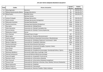 KTO JEST KIM W URZĘDZIE MIEJSKIM W GŁUSZYCY Pokój Osoba Nazwa stanowiska Symbol referatu B ZB Telefon bezpośredni 748 459 479 748 459 479 12 14 Alicja Ogorzelec Elżbieta Rembiszewska-Zibrow Burmistrz Zastępca Burmistrza 20 Alicja Pyszka Justyna Prokopek Aneta Literska Aleksandra Styrbicka Ewelina Kondracka SG SK KB KB ORM ORM 748 459 479 13 13 24 24 Skarbnik Gminy Sekretarz Gminy Obsługa Sekretariatu Obsługa Sekretariatu (Zastępstwo) Obsługa Rady Miejskiej Obsługa Rady Miejskiej (Zastępstwo) 1 1 1 1 2 Ewa Łęcka Halina Bartyoska Urszula Zaleska Władysława Pydych Artur Nazimek Stanowisko ds. Obsługi Klienta Stanowisko ds. Obsługi Przedsiębiorców Stanowisko ds. Edukacji i Pomocy Społecznej Goniec Obsługa Prawna Urzędu POK OP 748 459 479 748 866 763 748 866 748 748 459 479 748 459 479 3 Beata Jagóra Stanowisko ds. Wspólnot Mieszkaniowych GKiM 748 866 766 3 4 5 Jolanta Lompart Anna Błaszczyk Barbara Podgórska Kierownik Referatu Gospodarki Komunalnej i Mieszkaniowej Stanowisko ds. Windykacji Należności Czynszowych i Opłat Stanowisko ds. Gospodarki Lokalowej GKiM BiF GKiM 748 866 758 748 866 761 748 866 768 5 5 Ewelina Kondracka Jadwiga Matysiak Rzecznik Gminy/Asystent Burmistrza Stanowisko ds. Utrzymania Porządku, Czystości i Zieleni BiF 748 866 755 748 866 757 7 Anna Panter Stanowisko ds. Obywatelskich 7 Piotr Wąsik Stanowisko ds. Zarządzania Kryzysowego i Koordynacji Kultury i Sportu ZKKiKS 748 866 770 8 15 15 15 15 Wiesława Moździerz Andrzej Poniewierski Joanna Drzygała Kazimierz Jerzyk Piotr Piechocki Kierownik Urzędu Stanu Cywilnego i Kadr Kierownik Referatu Mienia Komunalnego Stanowisko ds. Gospodarki Przestrzennej Stanowisko ds. Infrastruktury Miejskiej Stanowisko ds. Infrastruktury Miejskiej (zastępstwo) USCiK MK MK MK MK 748 866 740 748 866 741 748 866 764 748 866 752 748 866 752 15 Tomasz Krzak Stanowisko ds. Rolnictwa, Leśnictwa, Gosp. Wodnej i Ochrony Środowiska MK 748 866 747 16 16 Beata Sokołowska Bożena Żołnieruk Stanowisko ds. Podatków Stanowisko ds. Finansowych BiF BiF 748 866 743 748 866 759 16 Elżbieta Ludkiewicz Stanowisko ds. Wymiaru Podatku i Opłat Lokalnych BiF 748 866 743 EiPS 748 459 479 748 459 479 748 866 746 748 866 746 748 866 753 17 17 17 Agata Szkatulska Anna Rudnicka Irena Piasecka Stanowisko ds. Finansowych (zastępstwo) Stanowisko ds. Finansowych Stanowisko ds. Księgowości Budżetowej BiF BiF BiF 748 866 750 748 866 750 748 866 762 17 22 23 Joanna Wieczorkiewicz Tomasz Żygadło Barbara Miszczuk Stanowisko ds. Księgowości i Płac Kierownik Referatu Inwestycji i Rozwoju Stanowisko ds. Obsługi Inwestorów i Zamówieo Publicznych BiF IiR IiR 748 866 762 748 866 756 748 866 767 23 Czesław Franków Monika Urbaniak Natalia Urbaoczyk Tomasz Szachta Władysława Ciura Stanowisko ds. Inwestycji Sprzątaczka Obsługa BHP Urzędu Obsługa Informatyczna Urzędu Pracownik Świetlicy Środowiskowej Konserwator IiR 748 866 767 OB OI e-mail [email protected] [email protected] [email protected] [email protected] [email protected] [email protected] [email protected] [email protected] [email protected] [email protected] [email protected] [email protected] [email protected] [email protected] [email protected] [email protected] [email protected] [email protected] [email protected] [email protected] [email protected] [email protected] [email protected] [email protected] [email protected] [email protected] [email protected] [email protected] [email protected] [email protected] [email protected] [email protected] [email protected] [email protected] [email protected]