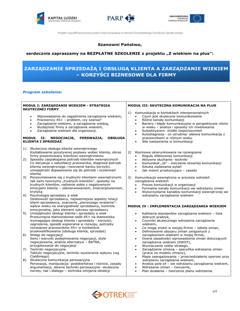 Szanowni Państwo, serdecznie zapraszamy na BEZPŁATNE SZKOLENIE z projektu „Z wiekiem na plus”: ZARZĄDZANIE SPRZEDAŻĄ I OBSŁUGĄ KLIENTA A ZARZĄDZANIE WIEKIEM – KORZYŚCI BIZNESOWE DLA FIRMY Program szkolenia: MODUŁ I: ZARZĄDZANIE WIEKIEM - STRATEGIA SKUTECZNEJ FIRMY Wprowadzenie do zagadnienia zarządzania wiekiem, Pracownicy 45+ - problem, czy szansa? Zarządzanie wiekiem, a zarządzanie wiedzą, Wydajność firmy a zarządzanie wiekiem, Zarządzanie wiekiem dla organizacji. MODUŁ II: NEGOCJACJE, KLIENTA I SPRZEDAŻ 1) 2) 3) 4) 5) 6) 7) 8) PERSWAZJA, MODUŁ III: SKUTECZNA KOMUNIKACJA NA PLUS 1) Komunikacja w kontaktach interpersonalnych Czym jest skuteczne komunikowanie Różne kanały komunikacji Bariery i błędy komunikacyjne w perspektywie różnic w wieku – analiza i sposoby ich niwelowania Subiektywizm- źródło nieporozumień Autodiagnoza - co utrudnia/ ułatwia komunikację z pracownikami w różnym wieku Siła nastawienia w komunikacji 2) Rozmowa ukierunkowana na rozwiązanie Reguły efektywnej komunikacji Aktywne słuchanie- techniki Komunikat „Ja” - ćwiczenie otwartej komunikacji Sztuka zadawania pytań Jak mówić przekonująco – zasady 3) Komunikacja wewnętrzna w procesie wdrożeń zarządzania wiekiem Proces komunikacji w organizacji Formalne kanały komunikacji we wdrażaniu zmian Wykorzystanie kanałów komunikacji wewnętrznej we wdrażaniu zarządzania wiekiem OBSŁUGA Skuteczna obsługa klienta wewnętrznego Kształtowanie pozytywnej postawy wobec klienta, obraz firmy prezentowany klientowi wewnętrznemu Sposoby zaspakajania potrzeb klientów wewnętrznych Co decyduje o satysfakcji pracownika, diagnoza potrzeb klienta wewnętrznego i tworzenie banku korzyści, umiejętność dopasowania się do potrzeb i oczekiwań klienta Porozumiewanie się z trudnymi klientami wewnętrznymi Jak sami tworzymy „trudnych klientów”, sposoby na trudnych klientów, radzenie sobie z negatywnymi emocjami klienta – zdenerwowaniem, zniecierpliwieniem, krytyką Psychologia sprzedaży a wiek Osobowość sprzedawcy, najważniejsze aspekty relacji klient-sprzedawca, znaczenie „pierwszego wrażenia”– wpływ wieku na wiarygodność sprzedawcy, kontrola emocjonalna, jako element sukcesu sprzedawcy Umiejętności obsługi klienta i sprzedaży a wiek Przesunięcia stanowiskowe osób 45+ na stanowiska wymagające obsługi klienta i sprzedaży - korzyści, zagrożenia, sposób wspierania w rozwoju, potrzeby rozwojowe pracowników 45+ w kontekście przekwalifikowania (obsługa klienta, sprzedaż) Wstęp do negocjacji Sens i warunki podejmowania negocjacji, style negocjowania, analiza alternatyw – BATNA, przygotowanie do negocjacji Techniki negocjacyjne Taktyki negocjacyjne, techniki wywierania wpływu (wg Cialdiniego) Skuteczna komunikacja perswazyjna Perswazja, manipulacja- podobieństwa i różnice, zasady argumentacji, słowne techniki perswazyjne- skuteczne zwroty, tak i dlatego – technika omijania obiekcji MODUŁ IV : IMPLEMENTACJA ZARZĄDZANIA WIEKIEM Kafeteria standardów zarządzania wiekiem – lista dobrych praktyk, Czynniki skutecznego wdrożenia zarządzania wiekiem, Co mogę zrobić w swojej firmie – tabela zmian, Definiowanie obszaru zmian związanych z zarządzaniem wiekiem w mojej firmie, Ocena zasadności wprowadzenia zmian dotyczących zarządzania wiekiem (SWOT), Wyznaczanie celów strategii, Zarządzanie zmianą – specyfika wdrażania zmian (praca na modelu zmiany), Mapa zaangażowania – przeciwdziałanie oporowi przy wdrażaniu zarządzania wiekiem, Analiza pola sił – we wdrażaniu zarządzania wiekiem, Wdrażanie zmian – ćwiczenie, Plan działania – tworzenie planu wdrożenia. 1/2 Trener: Violetta Sulima - psycholog, trener biznesu certyfikowany przez brytyjskie konsorcjum IRD, specjalizuje się w prowadzeniu szkoleń z zakresu psychologii zarządzania, technik sprzedaży, negocjacji, komunikacji, motywowania, zarządzania czasem, ocen pracowników i innej problematyki HR. Jest autorką programów szkoleniowych prowadzonych zarówno w postaci szkoleń otwartych jak i zamkniętych, dedykowanych dla konkretnych firm. Doskonali swój warsztat trenerski w oparciu o własne szkolenia, literaturę, wymianę informacji z innymi trenerami oraz analizę osobistych doświadczeń. Przeprowadziła szkolenia m. in. dla takich firm jak: Iveco Poland Kompleks, QAD, Zachodniopomorska Szkoła Biznesu, Telekomunikacja Polska, Zakłady Energetyczne, Kogeneracja S.A., TETA S.A, KMIS Sp. z o.o., WROBIS Wrocław, Cadbury Poland, Carrier Transicold France, Domy Towarowe Centrum, TFL Leasing, Kotlin Sp. z o.o., Poczta Polska, Bims Plus, ABB Instal, Hutmen S.A., MPWiK Wrocław i Warszawa, Hygea, Polmozbyt Jelcz, Phoenix Contact, Faurecia–Wałbrzych, Elektrownia „Rybnik” S.A., Winuel S.A, KGHM Polska Miedź S.A., PeBeKa Sp. z o.o., Pol-Motors Sp. z o.o., MAHLE Sp. z o.o., Max-Pol ZPCH, Zakłady Azotowe Kędzierzyn S.A., Fiat Services Polska Sp. z o.o. Organizacja: Szkolenie obejmuje 24 godziny dydaktyczne i odbędzie się w dniach 11-13.01.2012r. we Wrocławiu, przy ulicy Fabrycznej 10 – Centrum Konferencyjne Wrocławskiego Parku Przemysłowego. Zajęcia rozpoczynają się o godz. 9.00 i kończą o godz. 16.00, w trakcie zajęć przewidziano przerwy na kawę/ herbatę/ ciastko oraz obiad Cena: SZKOLENIE BEZPŁATNE - obejmuje i piśmiennicze, przerwy kawowe i obiad. 24 godziny zajęć dydaktycznych, materiały szkoleniowe Warunki udziału w bezpłatnym projekcie: Kadra zarządzająca i pracownicy działów personalnych z firmy małej, średniej i mikro oraz samozatrudnieni mogą skorzystać z bezpłatnych szkoleń, doradztwa i coachingu w projekcie "Z wiekiem na plus". Warunkiem jest nieprzekroczenie pomocy de minimis w wysokości 200.000 euro (w roku, w którym przedsiębiorstwo ubiega się o pomoc oraz w 2 poprzedzających go latach). Pomoc de minimis to wsparcie państwa udzielane przedsiębiorcom, które nie wymaga notyfikacji Komisji Euro